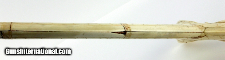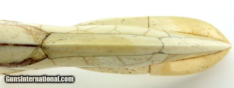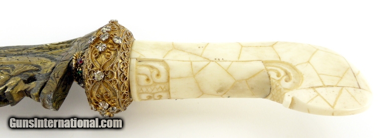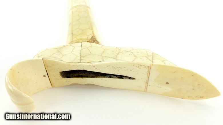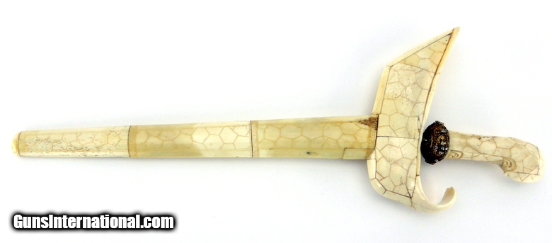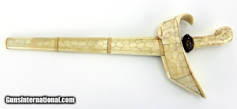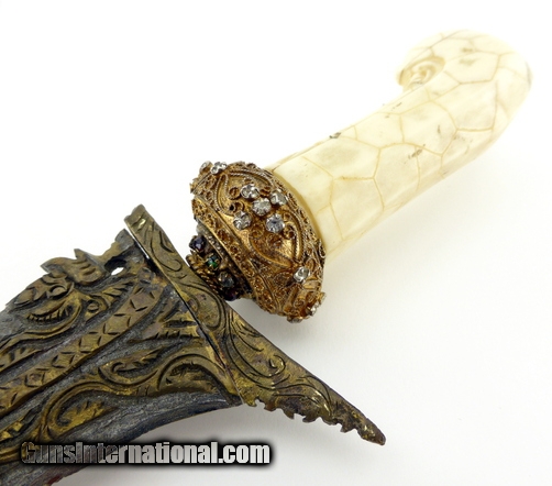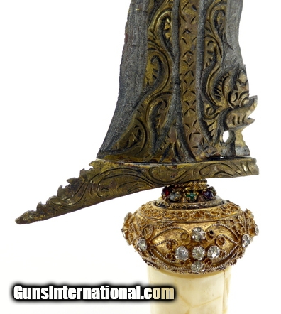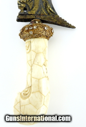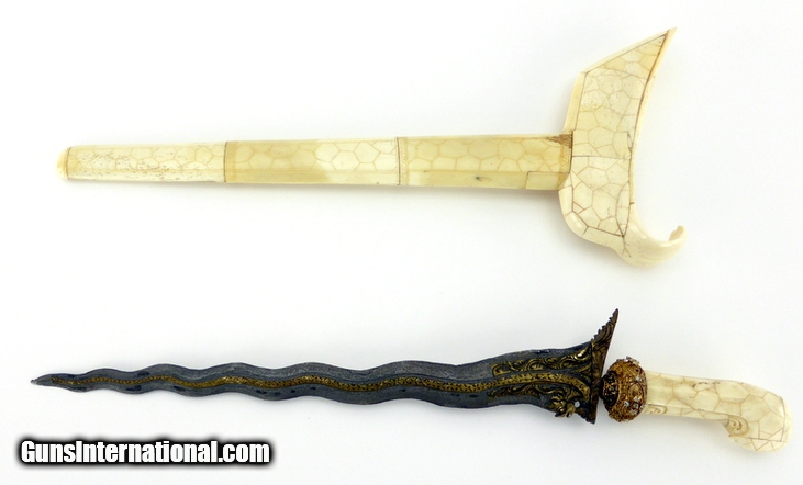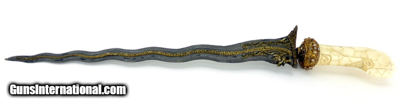 Description: " Beautiful Indonesian Keris with bone handle and Seath. Blade is 14” long and overall length with Seath is 20½”. Watered blade with bronze Dragoon. Very impressive Keris. SOLD |
