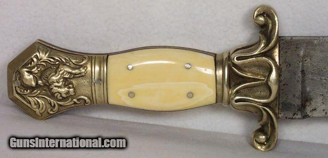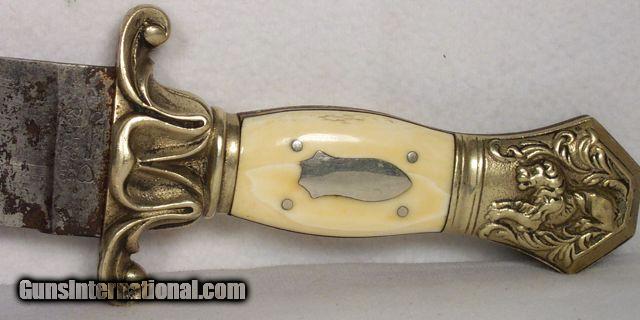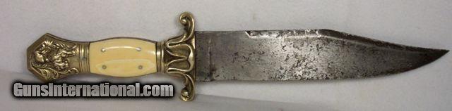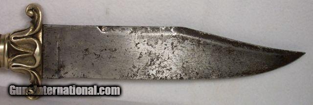 Description: Gold rush era Bowie made by Jonathan Crookes in Sheffield; 7 ¾” heavy clip point blade etched ‘California’; Crookes began making knives in Sheffield England around 1830; very high quality antique Bowie with Ivory handle; blade marked ‘Jonathan Crookes; with his pistol heart trade mark; he is listed in 1857 Sheffield Directory as is his pistol heart trade mark; antique;All items shipped fully insured- Knives, Swords & Sabers $30; (Texas residents please add 6.75% sales tax); return policy: three days inspection from the date the item is received; full refund of shipping both ways ONLY IF THE ITEM IS MISREPRESENTED. Note: No International sales under any circumstances. SOLD |