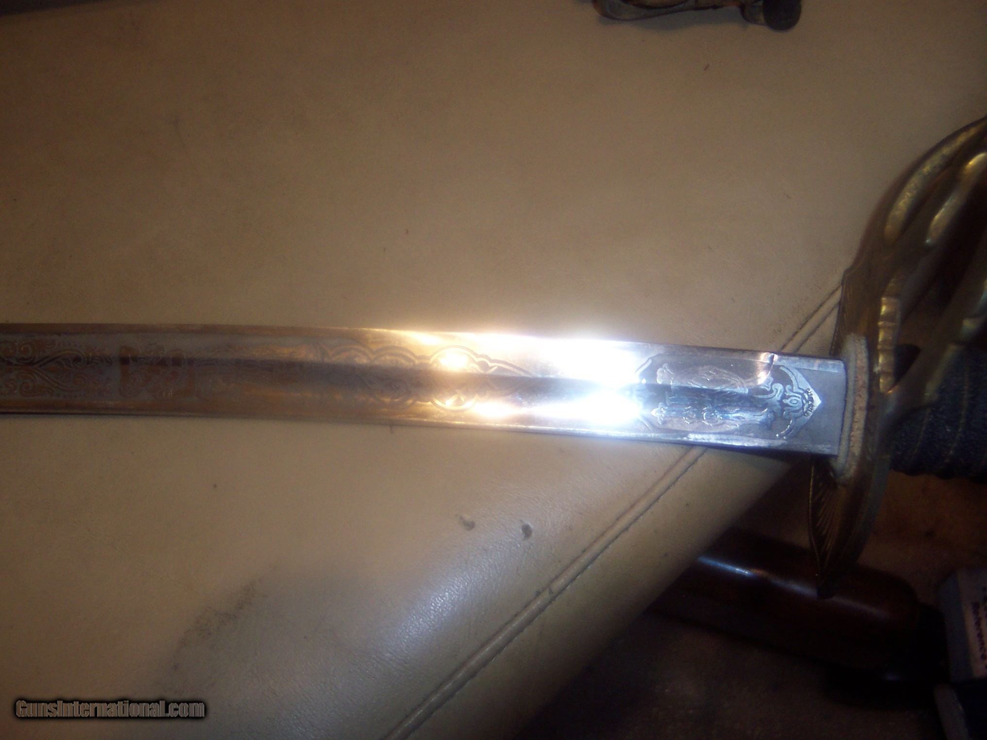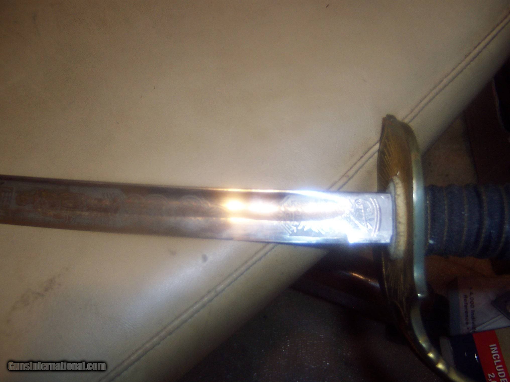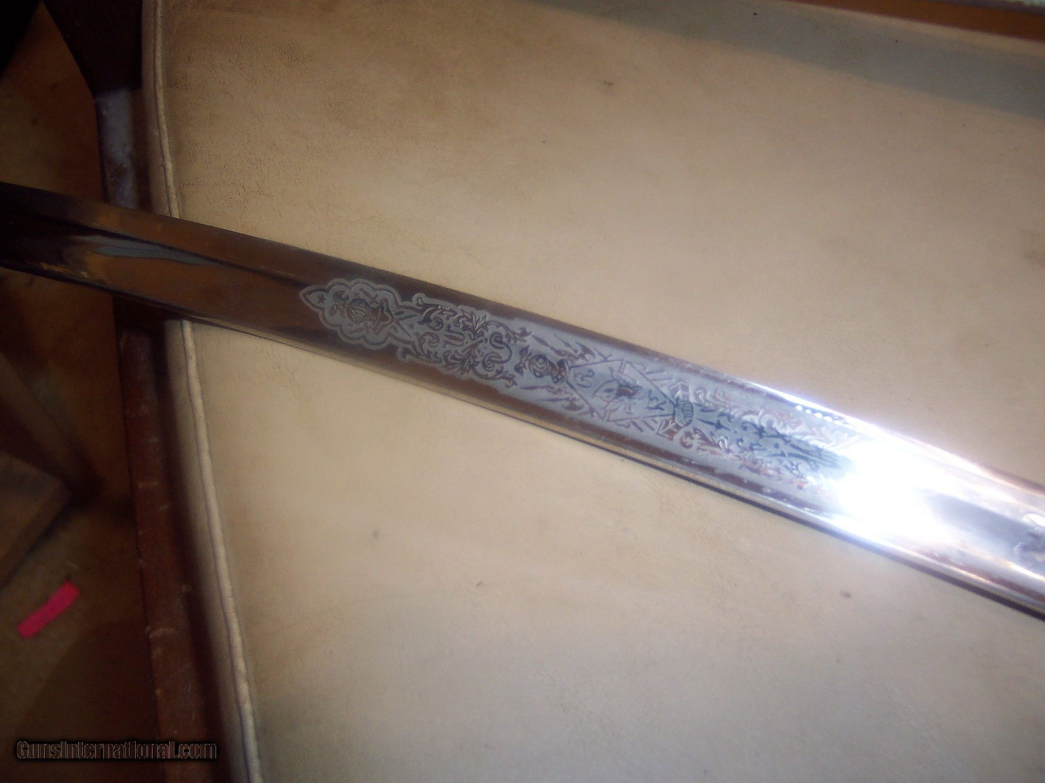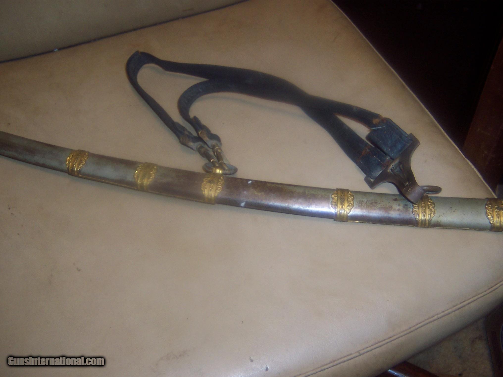 Description: has original hanger / this sword is probably pre1900 the hanger leather is showing its age // and lots od gilt missinbg on guard ////// f w clark etched on blade // this has the uniform rank mark /// lots of history on the internet about nights of pithias // the blade is excellent // scabbard shows loss on nickel / but in solid condition Early in the group's history, some Pythians formed the Uniformed Rank, which adopted military terminology for its organization. Swords owned by a member of the Uniformed Rank might be inscribed with the acronym, "UR," a dove, or a lily. (The Uniformed Rank was banned in the organization in the 1950s.) $40 sh made by pettibone bros cinti ohio// has U R on blade and guard // the hanger is very dry and cracking with repairs ,, rarer than the sword i think SOLD |