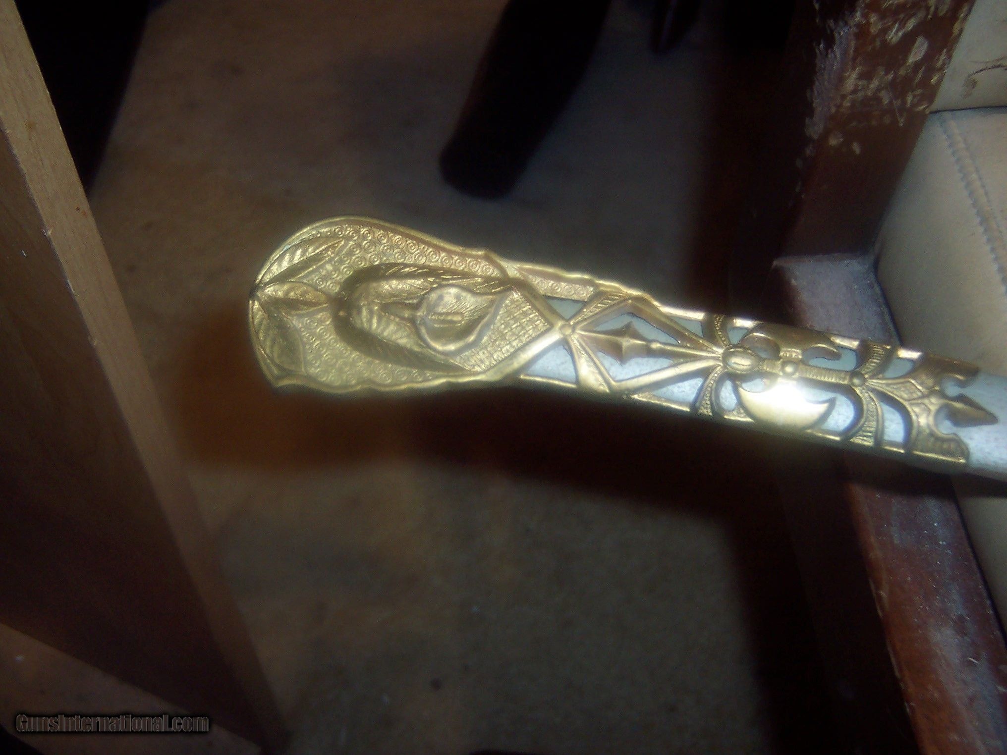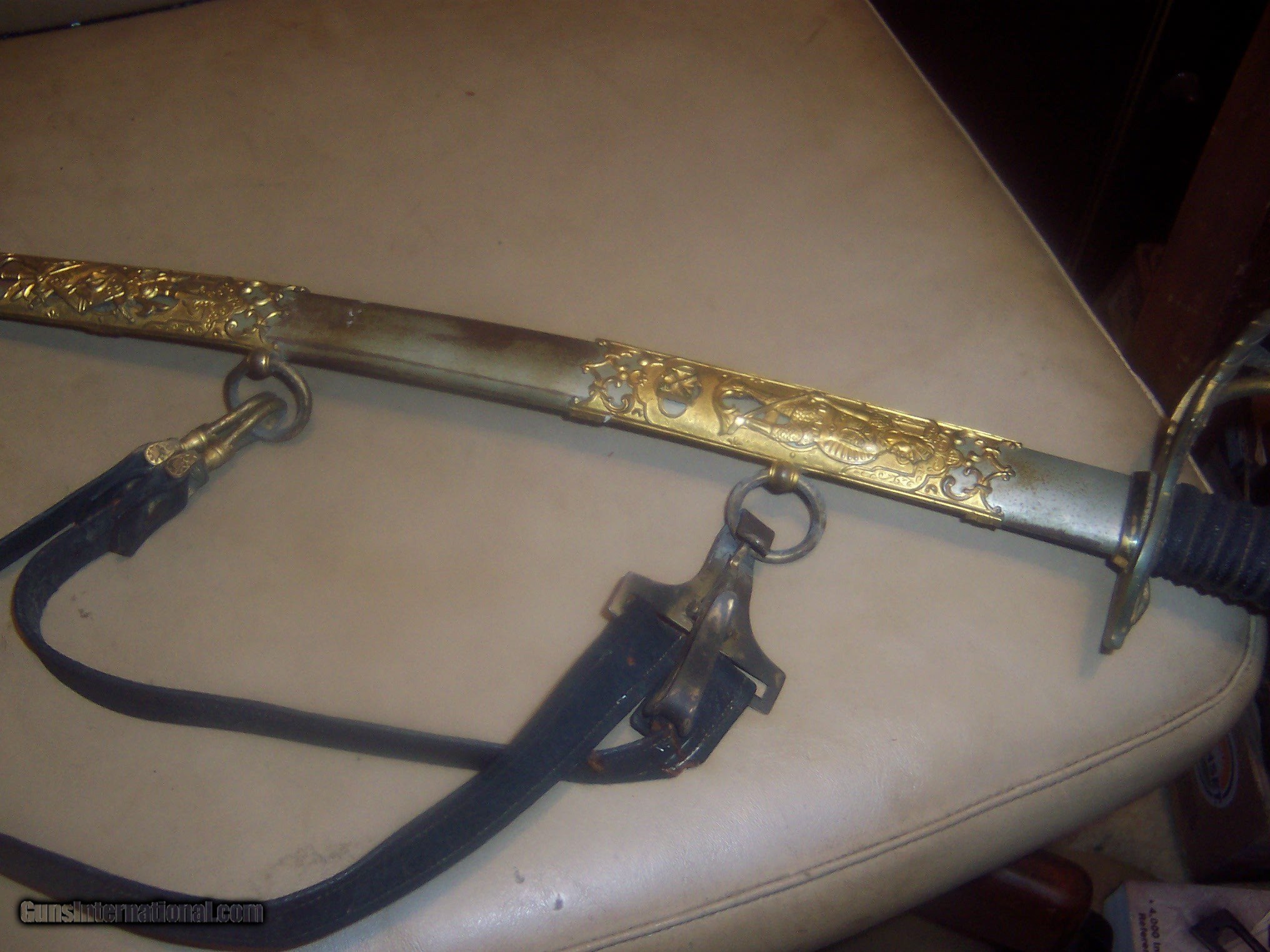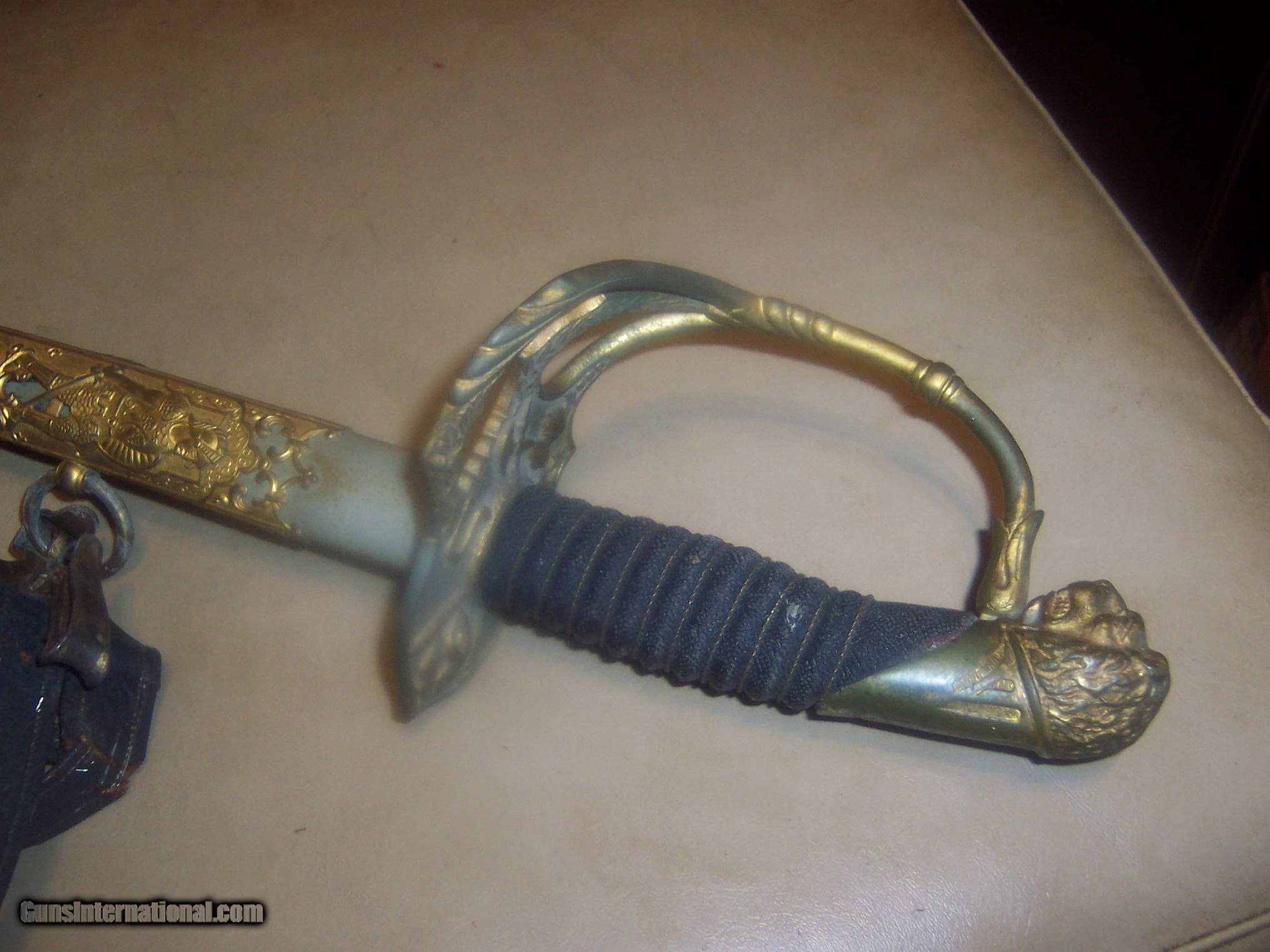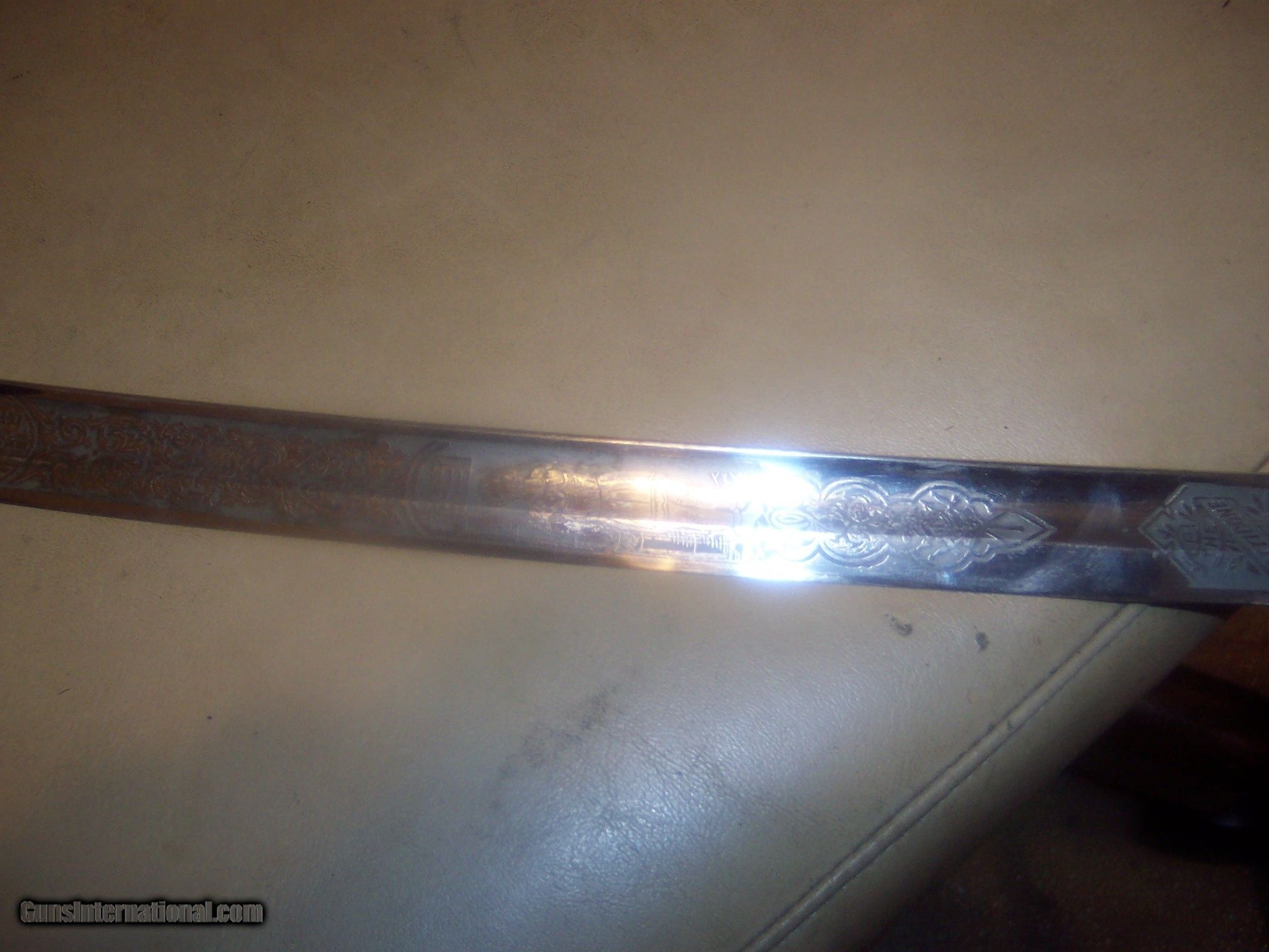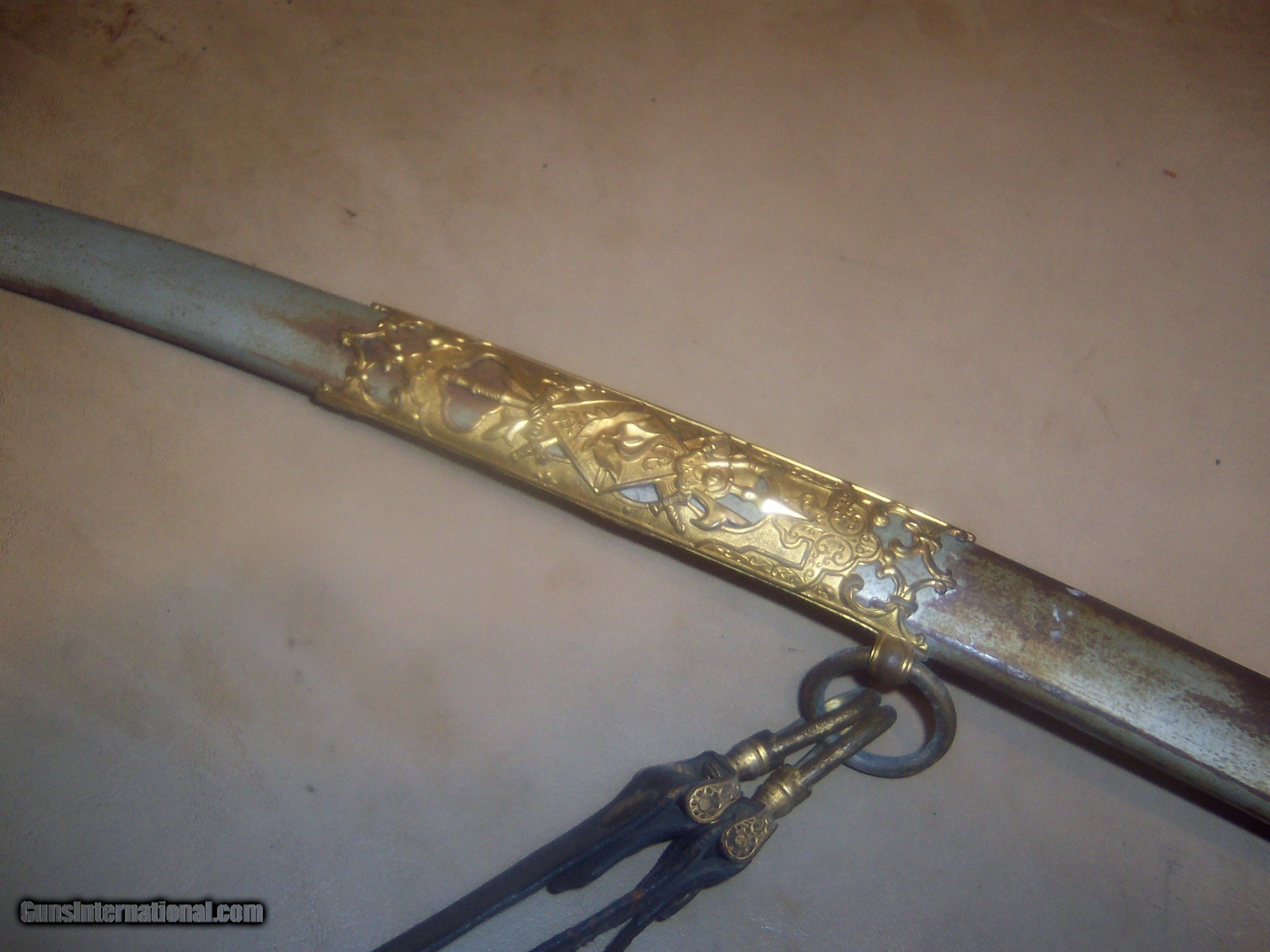 Description: has original hanger / this sword is probably pre1900 the hanger leather is showing its age // and lots od gilt missinbg on guard ////// f w clark etched on blade // this has the uniform rank mark /// lots of history on the internet about nights of pithias // the blade is excellent // scabbard shows loss on nickel / but in solid condition Early in the group's history, some Pythians formed the Uniformed Rank, which adopted military terminology for its organization. Swords owned by a member of the Uniformed Rank might be inscribed with the acronym, "UR," a dove, or a lily. (The Uniformed Rank was banned in the organization in the 1950s.) $40 sh made by pettibone bros cinti ohio// has U R on blade and guard // the hanger is very dry and cracking with repairs ,, rarer than the sword i think SOLD |