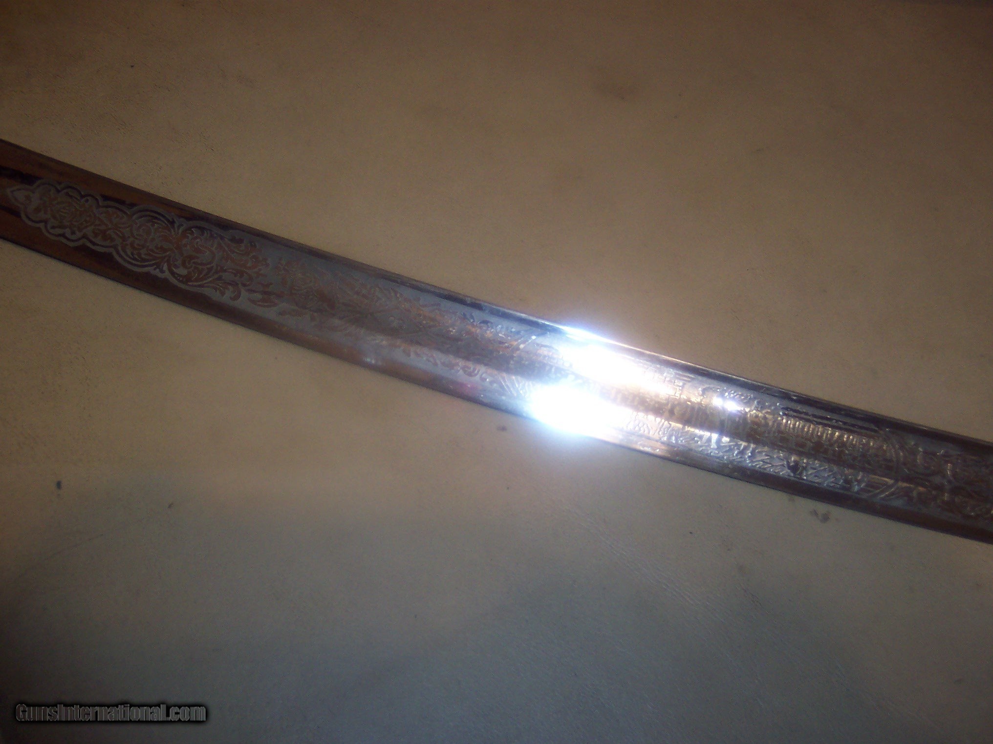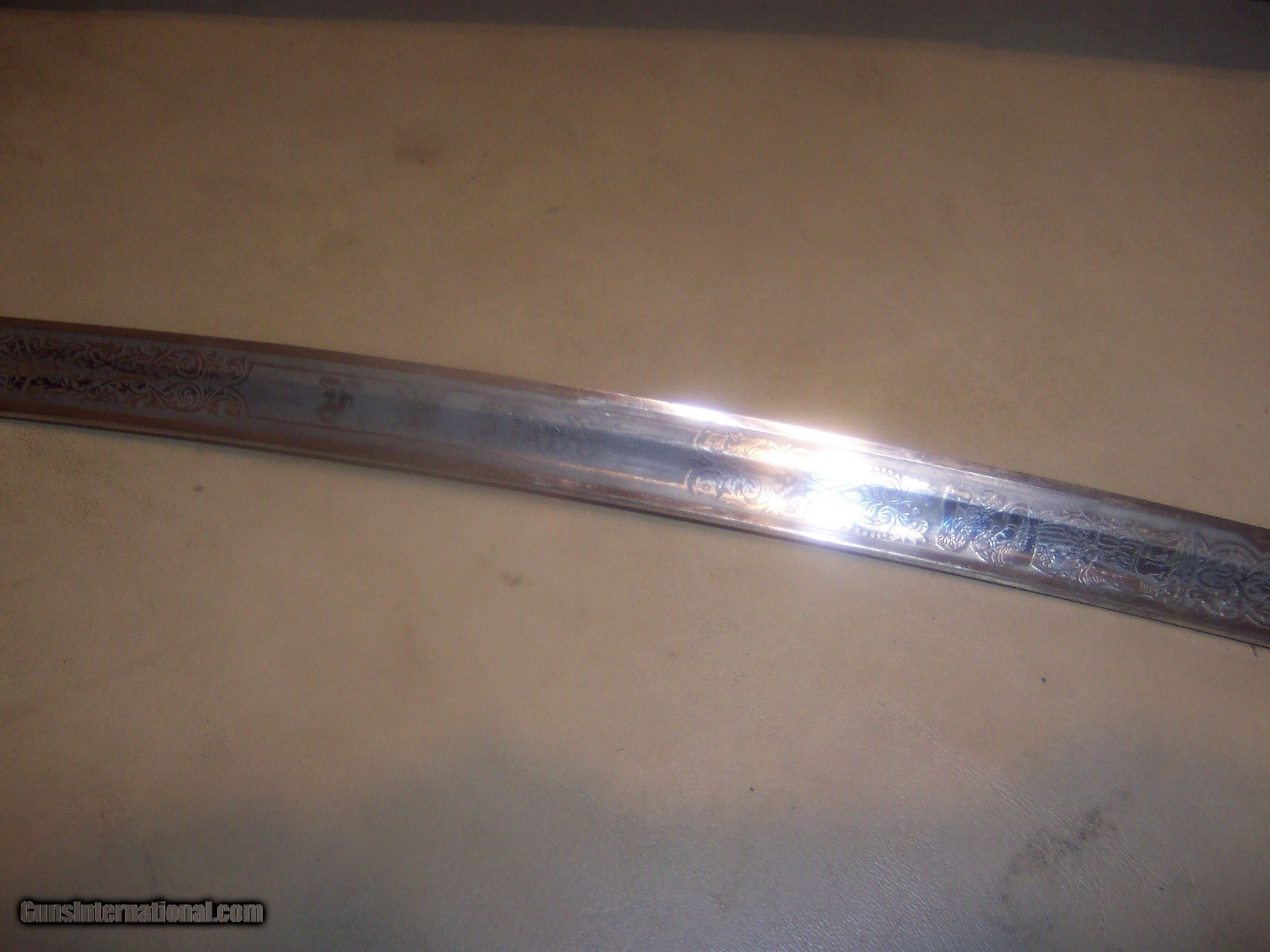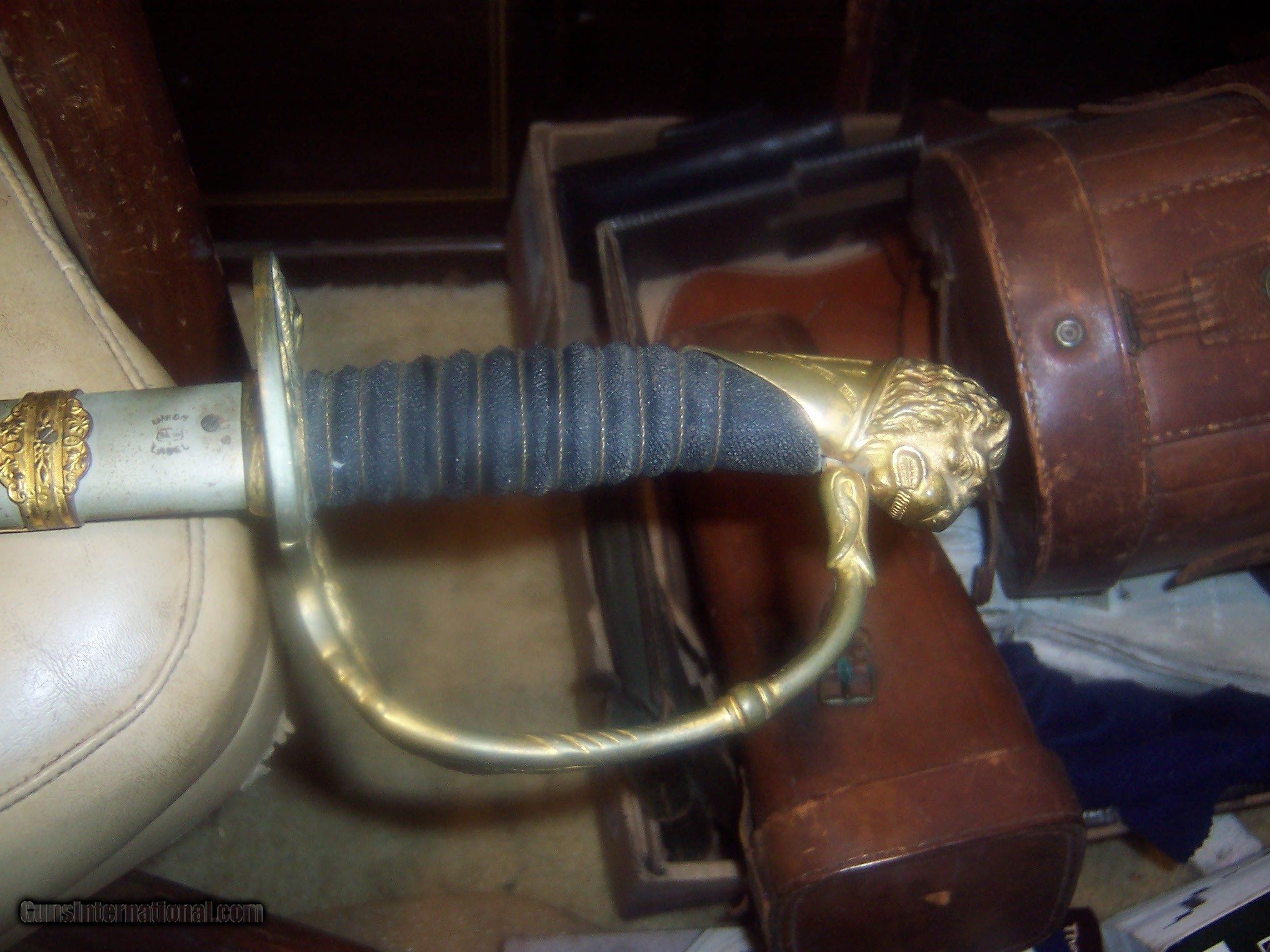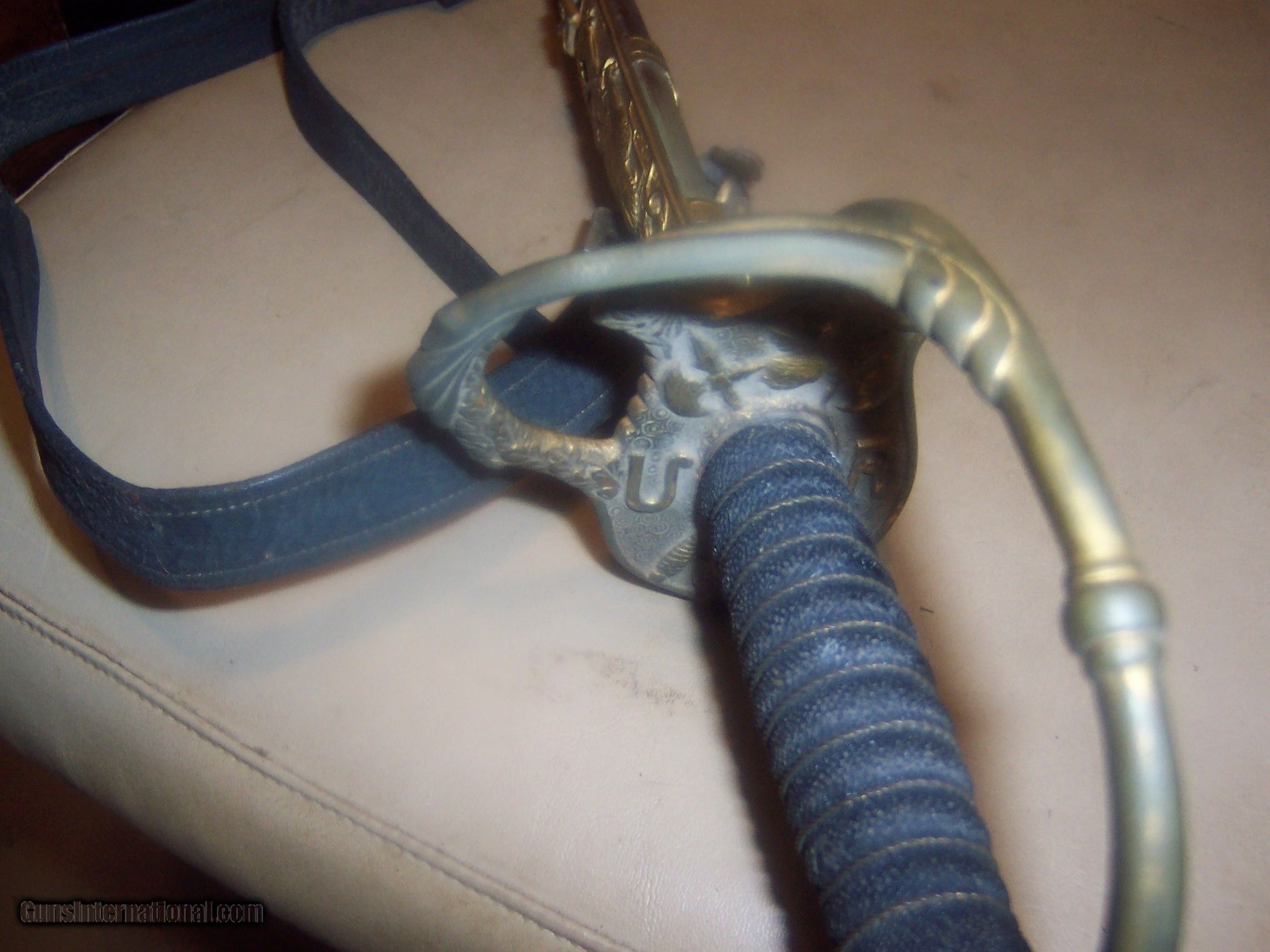 Description: has original hanger / this sword is probably pre1900 the hanger leather is showing its age // and lots od gilt missinbg on guard ////// f w clark etched on blade // this has the uniform rank mark /// lots of history on the internet about nights of pithias // the blade is excellent // scabbard shows loss on nickel / but in solid condition Early in the group's history, some Pythians formed the Uniformed Rank, which adopted military terminology for its organization. Swords owned by a member of the Uniformed Rank might be inscribed with the acronym, "UR," a dove, or a lily. (The Uniformed Rank was banned in the organization in the 1950s.) $40 sh made by pettibone bros cinti ohio// has U R on blade and guard // the hanger is very dry and cracking with repairs ,, rarer than the sword i think SOLD |