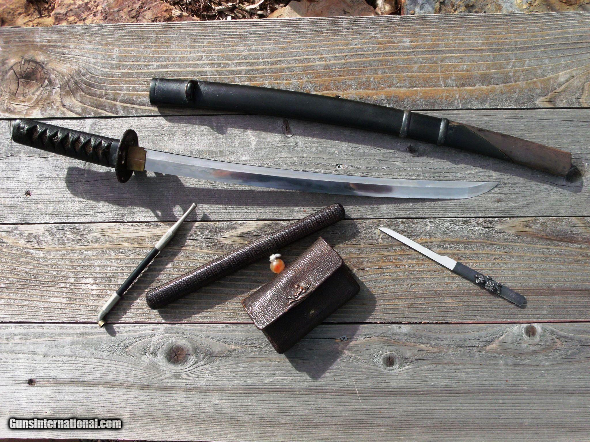 Description: This fine KO-Wakizashi sword and traditional Japanese pipe came in from one of our local collectors on consignment. He is liquidating a portion of his collection for an eminent move. This is the description of the sword from the current owner: " This is a Koto period (pre-1599) medium sword which is unsigned on the blade, but has full traditional mountings. The inlaid forged iron Tsuba is signed and features a relief of two fighters. The blade measures 17" and was professionally sharpened and cleaned. It has a fancy temper with minor blemishes to the laminations. The grip has very old wrappings and is adorned with soft metal menuki (figures). Scabard looks original and has a metal tip, but with some modern repairs. The kozuka is a modern replacement and the holder has a piece missing." ://markussesko/2015/08/11/the-wakizashi/ Description of the Japanese Kiseru pipe and case: "This decorative Japanese pipe, tobacco pouch, and pipe case features a Ojimi bead and decorative mount. The pipe is made of plate silver and ebony wood, 8" in length, and is in original and excellent condition. Disassembles for cleaning. Leather tobacco pouch features a menuki-style figure and is filled with very old Japanese paper - most likely used for rolling cigarettes. The case is in great condition and the bamboo checkering is strong." Kiseru ( kiseru) is a Japanese smoking pipe traditionally used for smoking kizami, a finely shredded tobacco product resembling hair. Typically the mouth piece and bowl are made from metal, with a tubular shaft of wood or bamboo stretching in between. The bowl is much smaller than that of western-style pipes. Because each kiseru is basically a rod with metal ends, extremely long kiseru could be carried as weapons, especially by the gangster-like kabukimono samurai of Edo period Japan. Many kiseru have been engraved with elaborate details by skilled artisans and were a status symbol for the owner. PAYMENT: We will hold items five (5) business days for the payment of the purchased item and its shipping cost, license receipt, and any other documentation required to complete the transaction. We prefer bank checks, postal money orders, VISA or Mastercard. Credit cards add 3% to total cost. $20.00 service fee if card is declined. A restocking fee of 15% is due for ALL returns. Personal checks are deposited for 14 business days before the item is shipped. Colorado purchases are subject to 8.2% sales tax if no resale certificate is presented. Please make checks/money orders out to: Red Bear Gun s. SHIPPING: We ship items like this Fedex Ground / Insured. Flat rate of $40 shipping for this item. SOLD Manufacturer: Japan Model: Wakizashi |