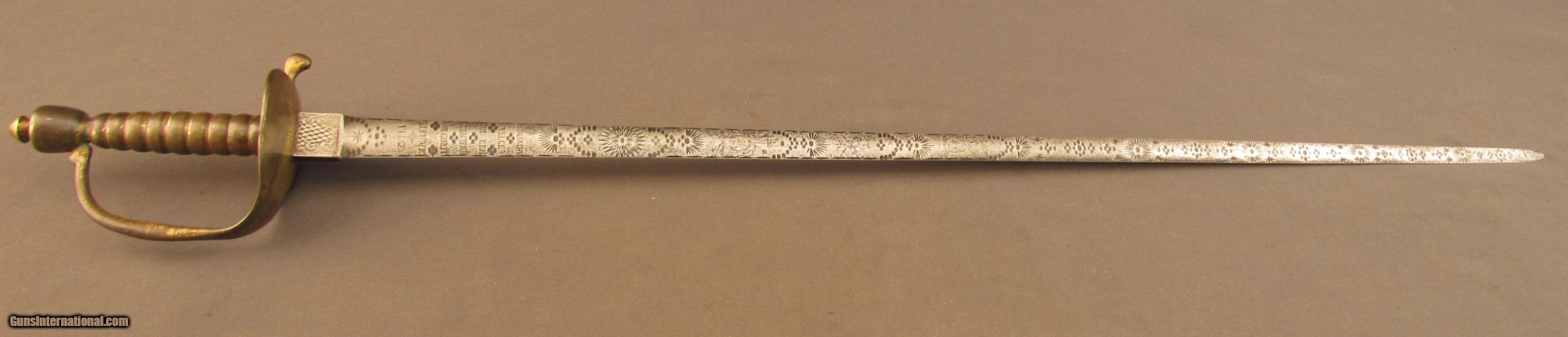 Description: This is a handsome sword that measures 38" overall with a 32" straight, unfullered blade that has decorative engraving along its entire length. The steel has an overall mottled gray patina with mild surface freckling throughout, heaviest toward the tip. There are simple geometric designs repeated along the entire length of the blade on both sides, with coats of arms and both martial and civil vignettes in the spaced breaks. The obverse forte is engraved with a dedication in Dutch: “MARGARITHA / VELGE / TOT EEN / GEDAGTENIS / AAN GIRRIT / LEENDERT / VELGE" that has traces of gold filling remaining within the letters. The solid brass hilt has a heart-shaped counterguard, single forward swept quillon, simple knucklebow, grooved grip, and an urn-shaped pommel. The brass has an overall dark ochre patina with about 15-20% of the original gilt finish remaining, mostly on the protected areas. The scabbard is no longer present. The declaration on the forte is apparently a dedication to the memory of (or a remembrance of the service of) Girrit Leendert Velge by Margaritha Velge (we assume she was his wife). Velge was the accountant and dispenser for the comptoir of the Dutch East India Company (V.O.C.) at Malaka (now Malacca in modern day Malaysia). He is listed in the collected archives of the Malaka outpost as still employed there in 1786 when he sold a two-masted boat to a Chinese merchant. In the archives his name is given as “Gerrit Leersdert Velge", which is almost certainly a misreading of the handwritten ledger. Authentic V.O.C. artifacts are extremely rare in the U.S. and this example rates about very good overall. {Ref. “The Lost Archives of Malaka: Are They Really Lost?" by M.R. Fernando – Journal of the Malaysian Branch of the Royal Asiatic Society Vol. 78, No. 1; 2005} SOLD Manufacturer: Dutch Model: Sword |