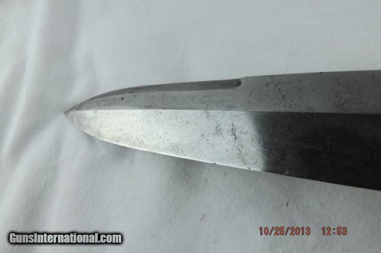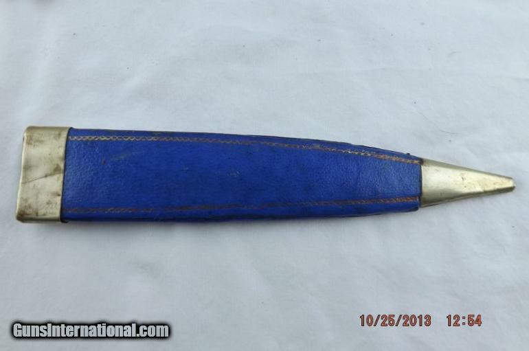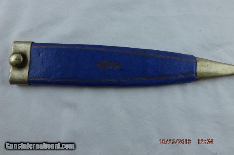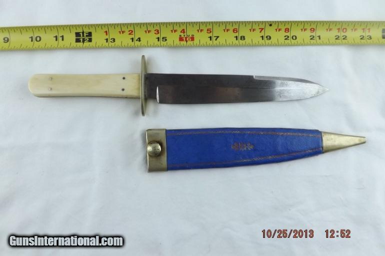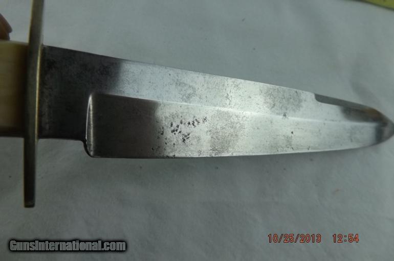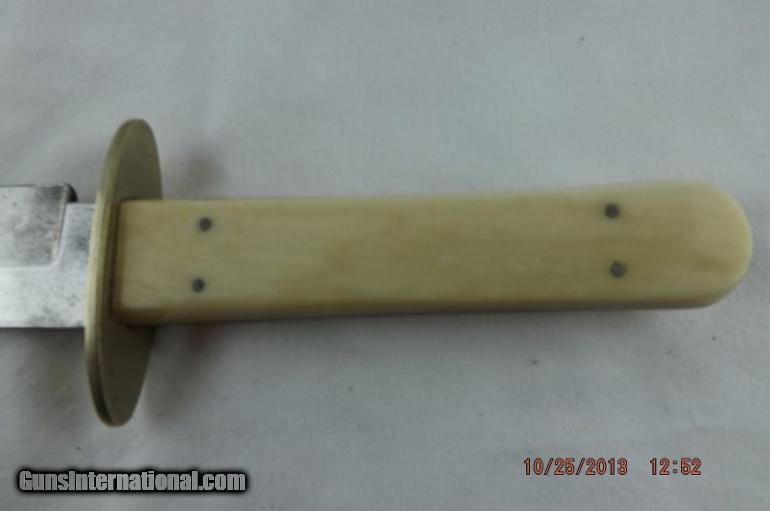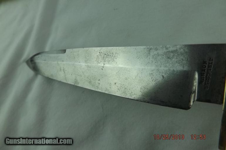 Description: Manson knife is 11 1/2" total length with a 7" spear point blade. The blade is nice and shiney with some very small pitting. There is etching on the left side of the blade but is too light to be able to read it. The bone scales are very nice with a beautiful yellow age patina with no cracks or losses. Comes with a blue paper sheath in very nice condition. SOLD |