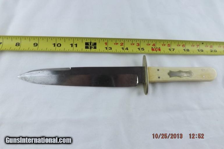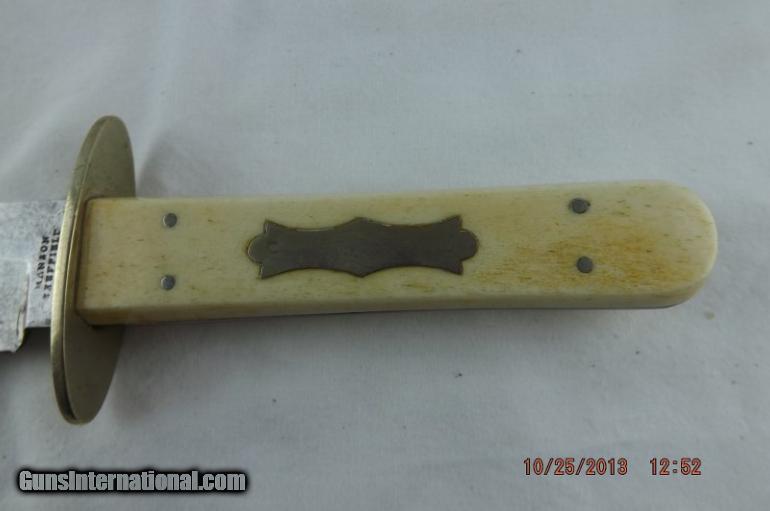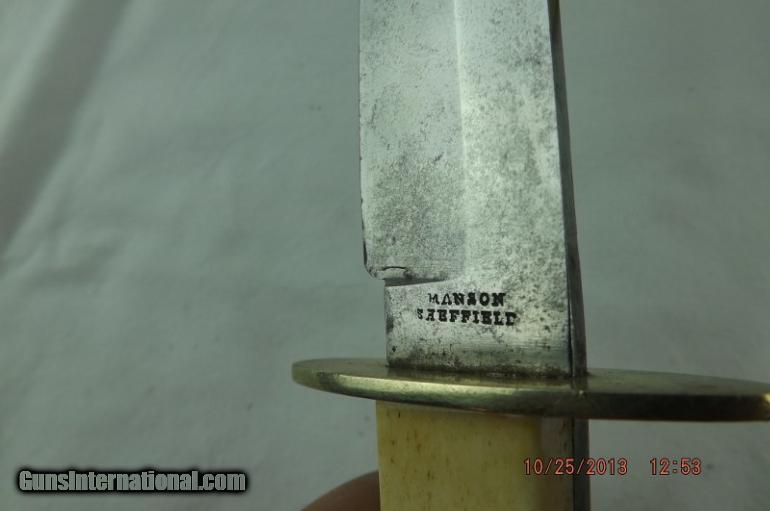 Manson knife is 11 1/2" total length with a 7" spear point blade. The blade is nice and shiney with some very small pitting. There is etching on the left side of the blade but is too light to be able to read it. The bone scales are very nice with a beautiful yellow age patina with no cracks or losses. Comes with a blue paper sheath in very nice condition.