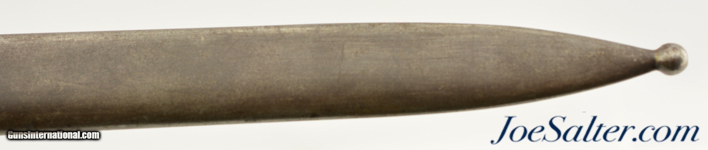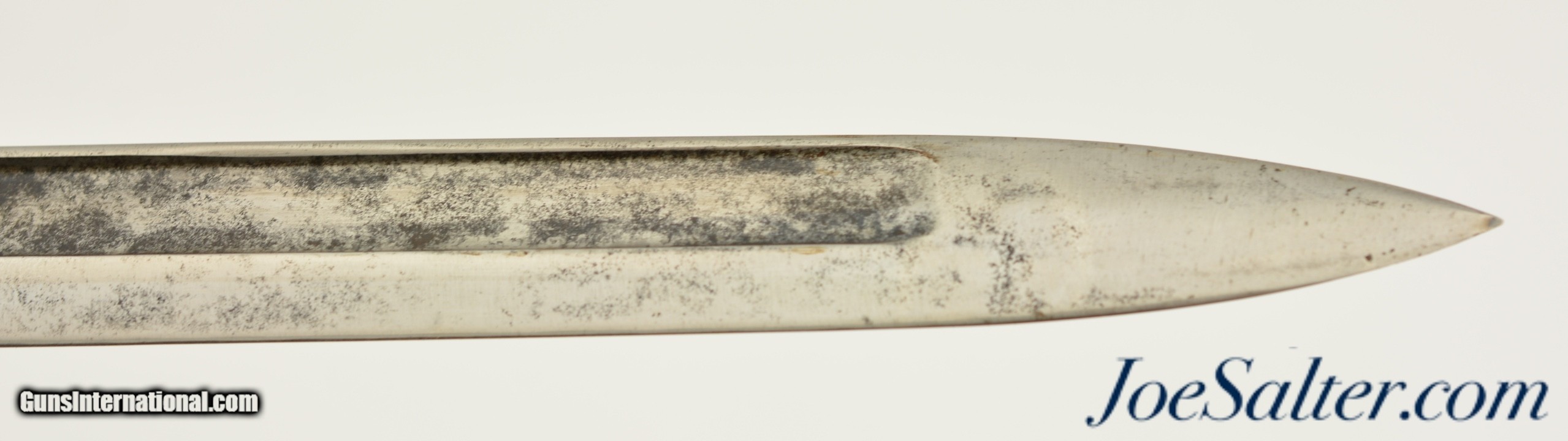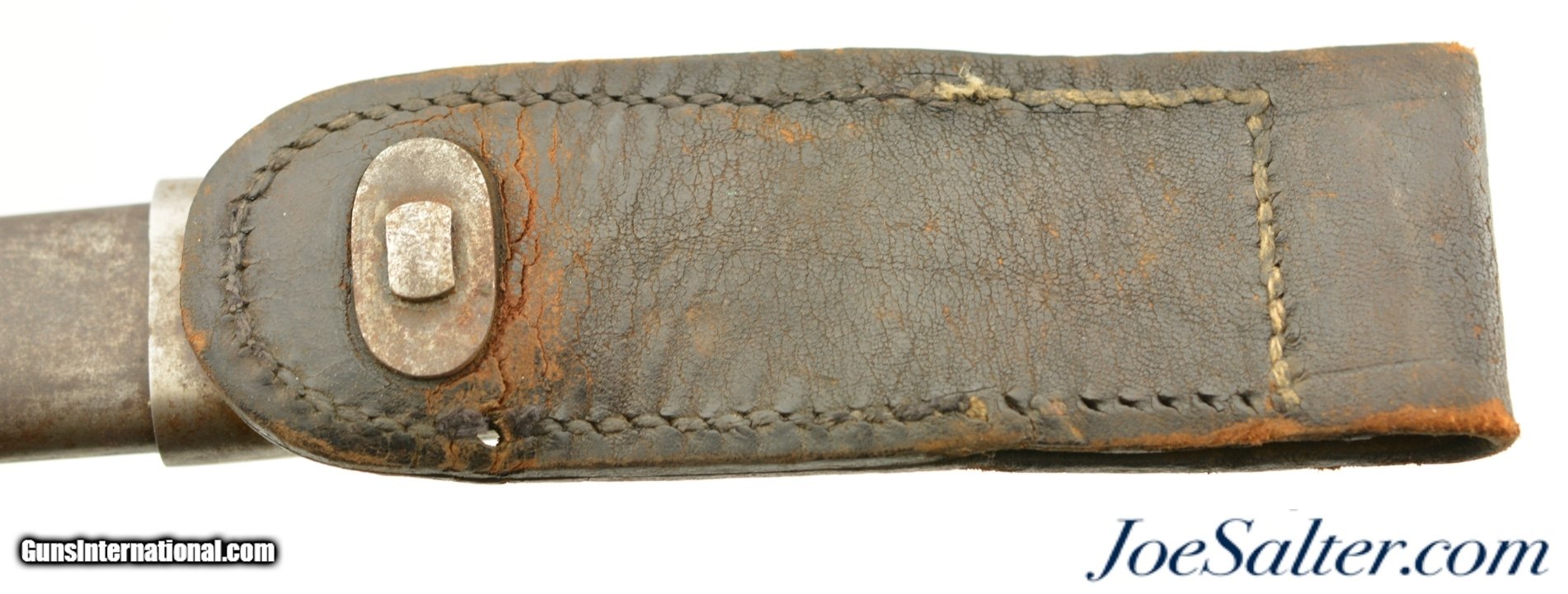Description: This is a Mexican 1889 Remington Rolling Block Bayonet/Scabbard/Frog, the 8 1/4" blade is in good unsharpened condition with oxidation and nearly unmarred edge and nice tip with a triangle with a T in it near the ricasso. The guard shows signs of normal wear and some oxidation and is unmarked. The handle scales are matched in size with a light patina with dings and scratches on both sides. The tang and rivets have scattered oxidation. Lastly ending in a functional rifle lug pommel with oxidation and no markings. The scabbard is not marked and in good+ condition with nice dark leather with some loose stitching and light surface oxidation. This example is unmarked by Remington and is minus the quillion. SOLD |