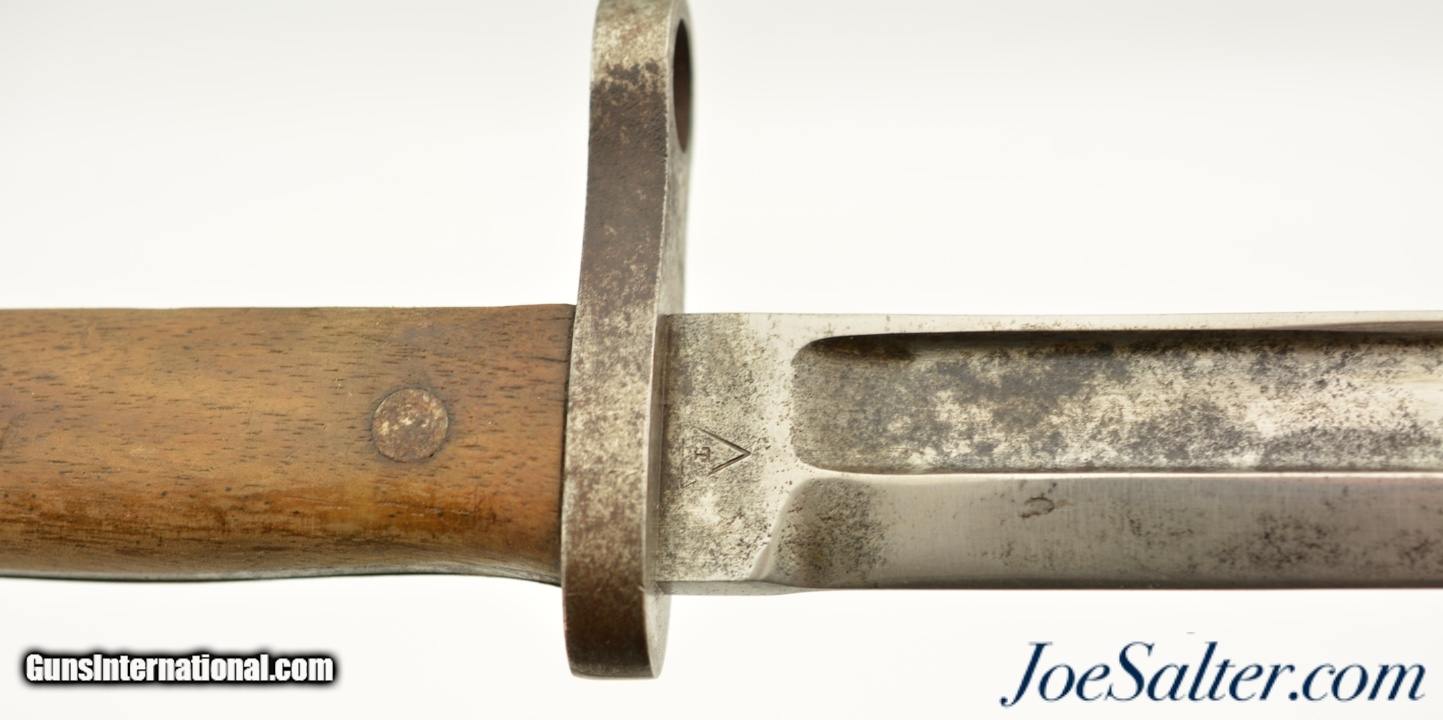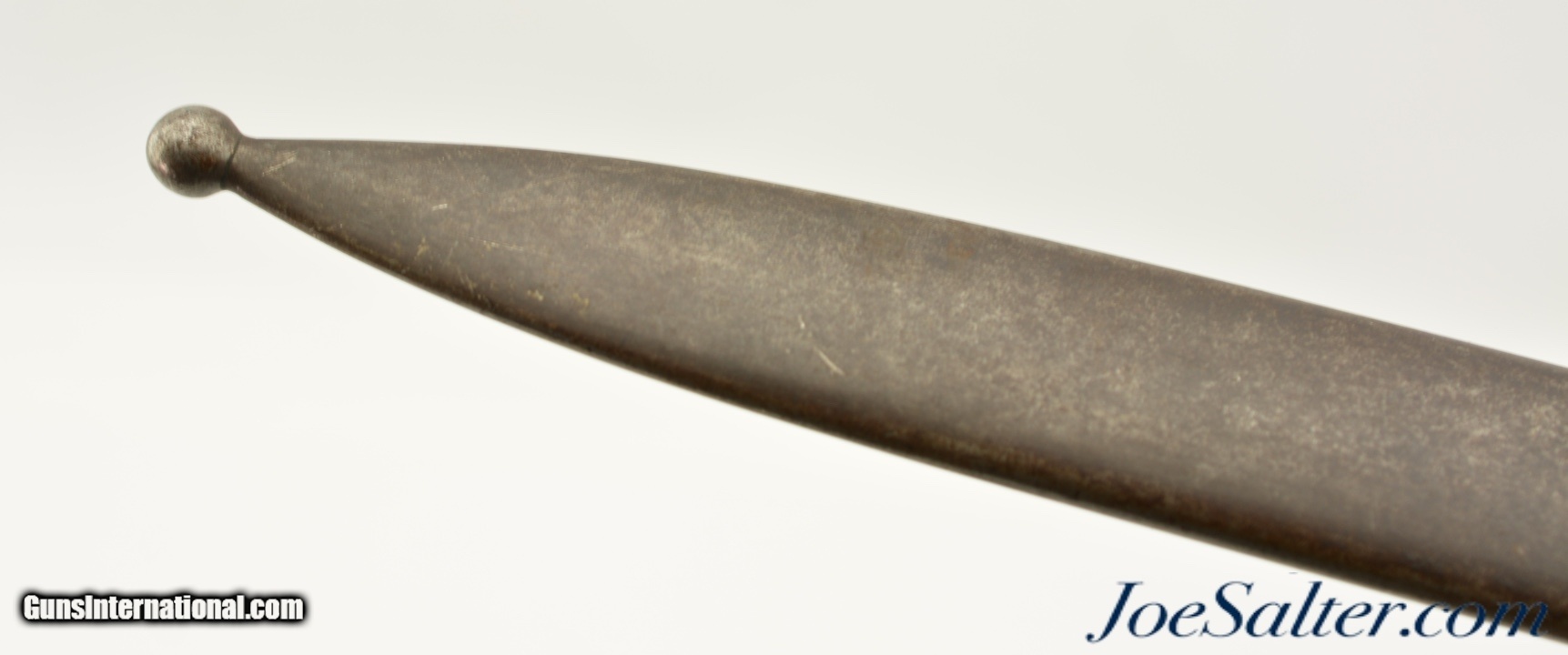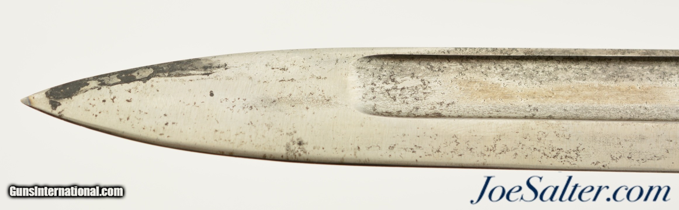 Description: This is a Mexican 1889 Remington Rolling Block Bayonet/Scabbard/Frog, the 8 1/4" blade is in good unsharpened condition with oxidation and nearly unmarred edge and nice tip with a triangle with a T in it near the ricasso. The guard shows signs of normal wear and some oxidation and is unmarked. The handle scales are matched in size with a light patina with dings and scratches on both sides. The tang and rivets have scattered oxidation. Lastly ending in a functional rifle lug pommel with oxidation and no markings. The scabbard is not marked and in good+ condition with nice dark leather with some loose stitching and light surface oxidation. This example is unmarked by Remington and is minus the quillion. SOLD |