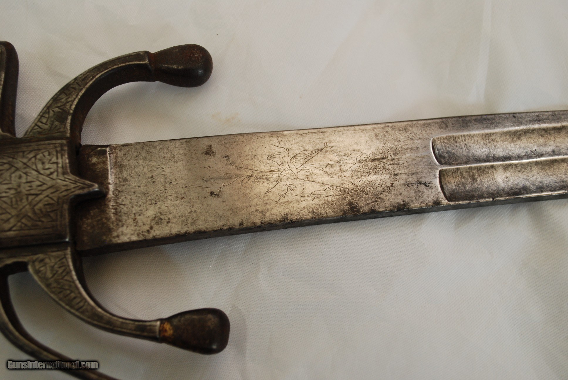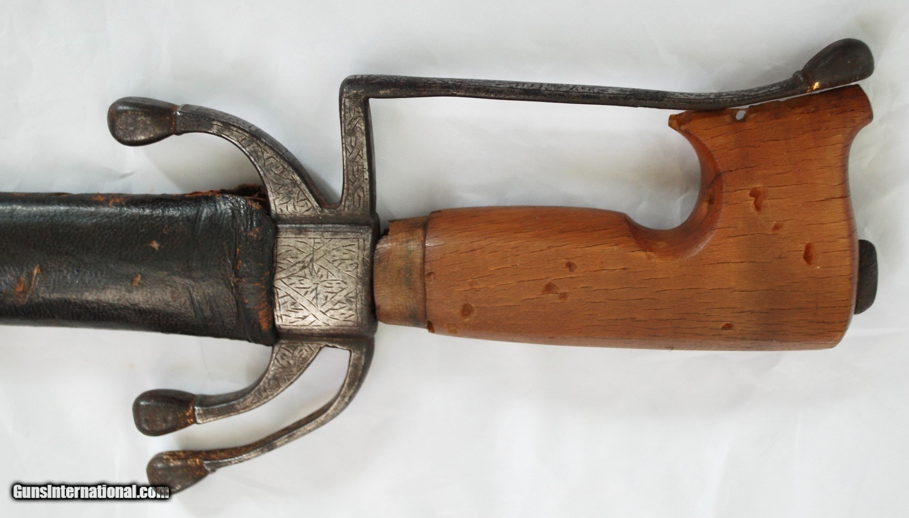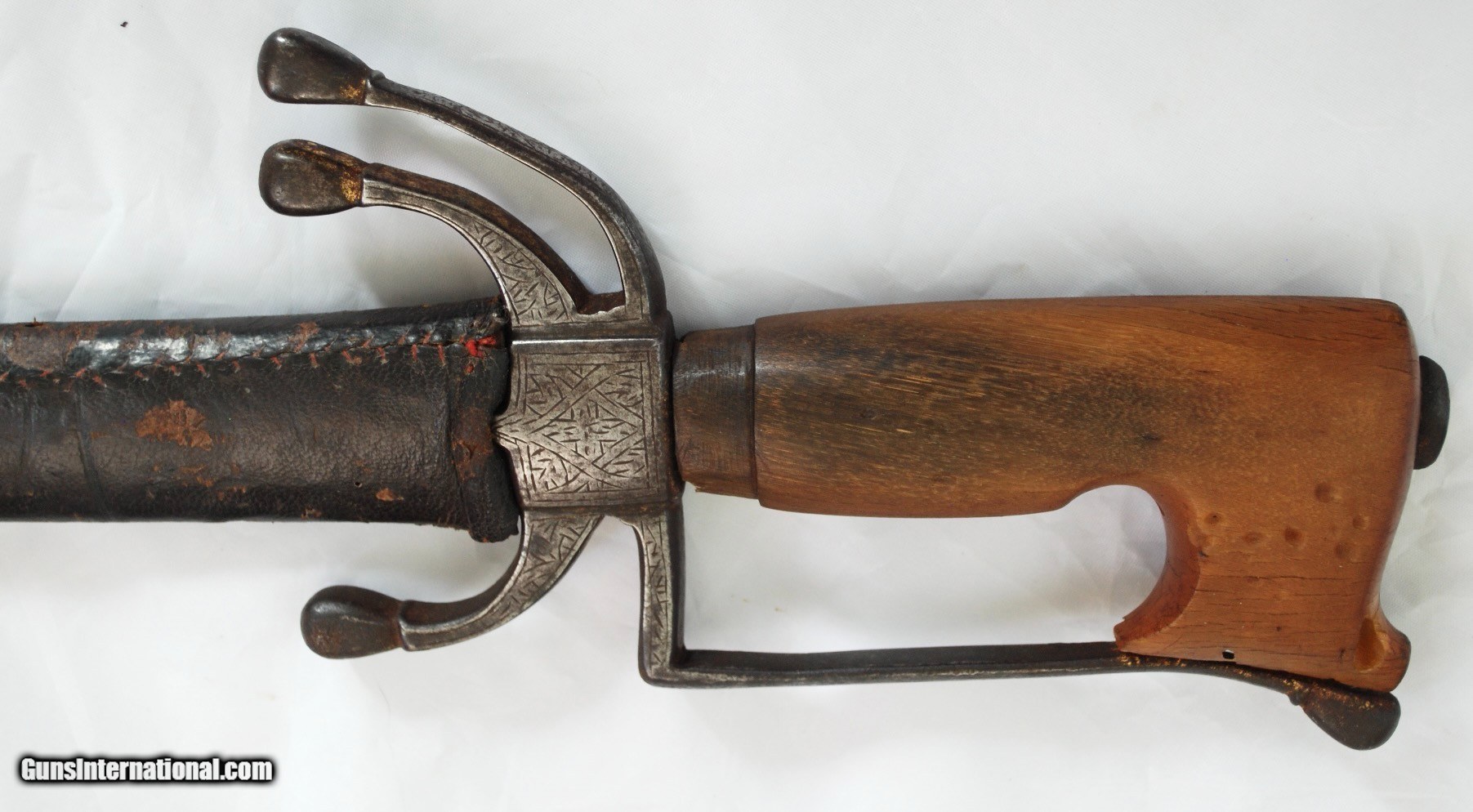 Description: This Nimcha sword is 40" overall with a 32" high quality European blade and an exquisite Rhino horn handle which is one of the rarest and most desirable materials on earth now, IT IS WORTH MORE THAN ITS WEIGHT IN GOLD OR DIAMONDS, look it up. ://newsroom.ucla.edu/releases/which-is-most-valuable-gold-cocaine-or-rhino-horn. The sword handle was obviously made well before rhino horn trade was banned. Overall condition is very good, leather held up surprisingly good, there are traces of gold wash on the handle;the sword was obviously made for a wealthy and influential individual. Npo international shipping on this one. Visa/MC add 3%. Thanks check my other listings. SOLD |