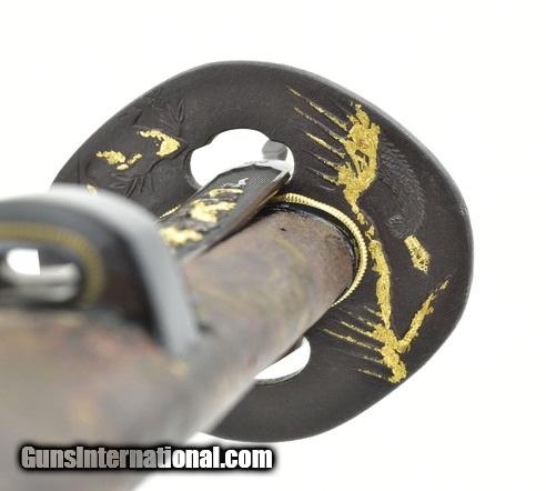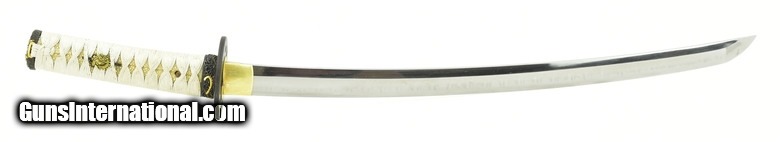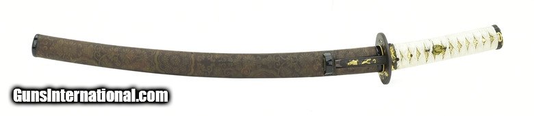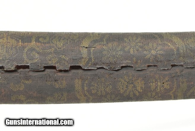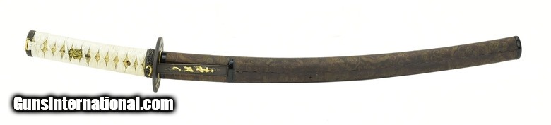 Description: Mounted Wakizashi. This is beautifully mounted Wakizashi signed “Bishu Osafune Sukesada saku”. This means that is was forged in the town of Osafune in Bishu province by the sword smith Sukesada. The cutting edge (Nagasa) 18 5/16 (46.5 cm). This poece is Ubu (unshortened) and in polish. The temper is a wide choji midare. The motif of the sword furniture is dragons with gold highlights. The fuchi is signed “Omori Teru Hide”. The scabbard is wrapped in cloth with a floral pattern. This is a exceptionally fine mounted Wakizashi. SOLD |