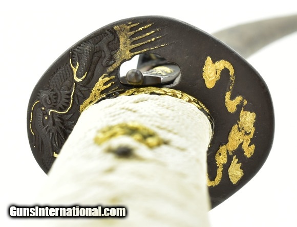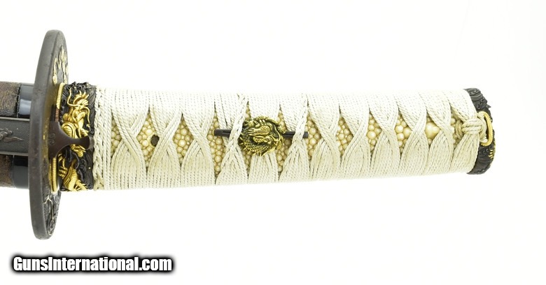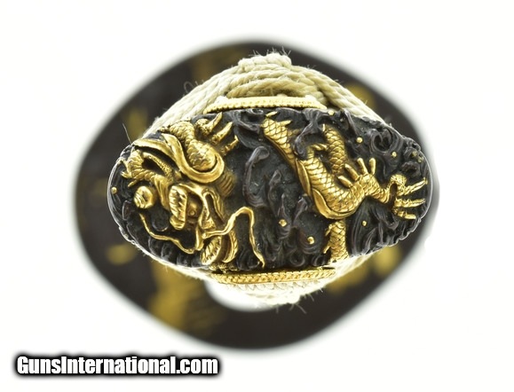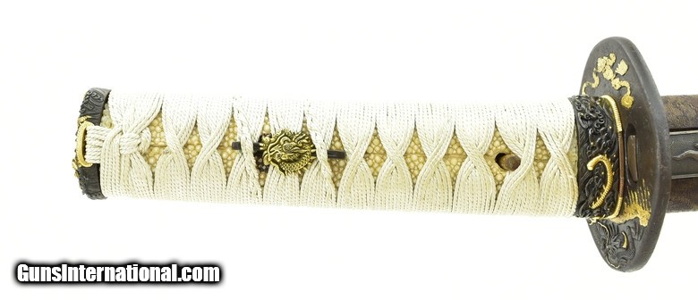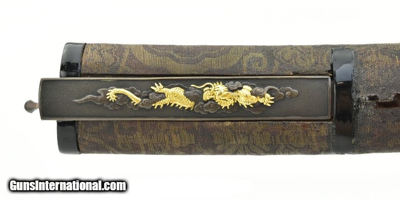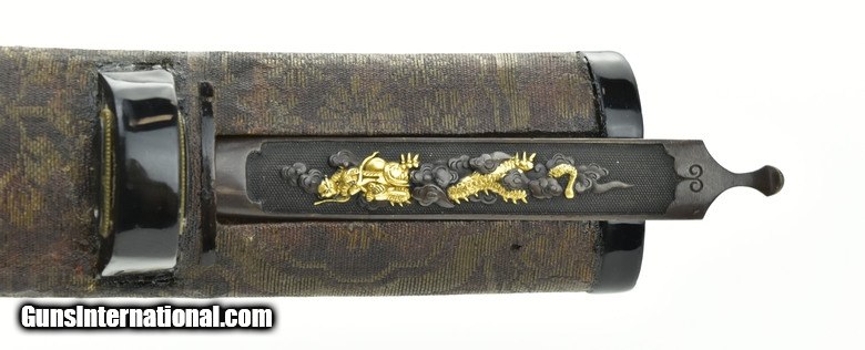 Mounted Wakizashi. This is beautifully mounted Wakizashi signed “Bishu Osafune Sukesada saku”. This means that is was forged in the town of Osafune in Bishu province by the sword smith Sukesada. The cutting edge (Nagasa) 18 5/16 (46.5 cm). This poece is Ubu (unshortened) and in polish. The temper is a wide choji midare. The motif of the sword furniture is dragons with gold highlights. The fuchi is signed “Omori Teru Hide”. The scabbard is wrapped in cloth with a floral pattern. This is a exceptionally fine mounted Wakizashi.