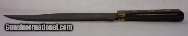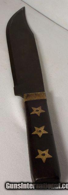 Description: Clip Point Side Knife—‘Snake Brand Sheffield’ marked with Rattlesnake Logo on blade; 8 3/8” blade; 13” L.O.A.; wooden handles with three stars on each; Early Americana or possibly Civil War era;All items shipped fully insured- Knives, Swords & Sabers $30; (Texas residents please add 6.75% sales tax); return policy: three days inspection from the date the item is received; full refund of shipping both ways ONLY IF THE ITEM IS MISREPRESENTED. Note: No International sales under any circumstances. SOLD |