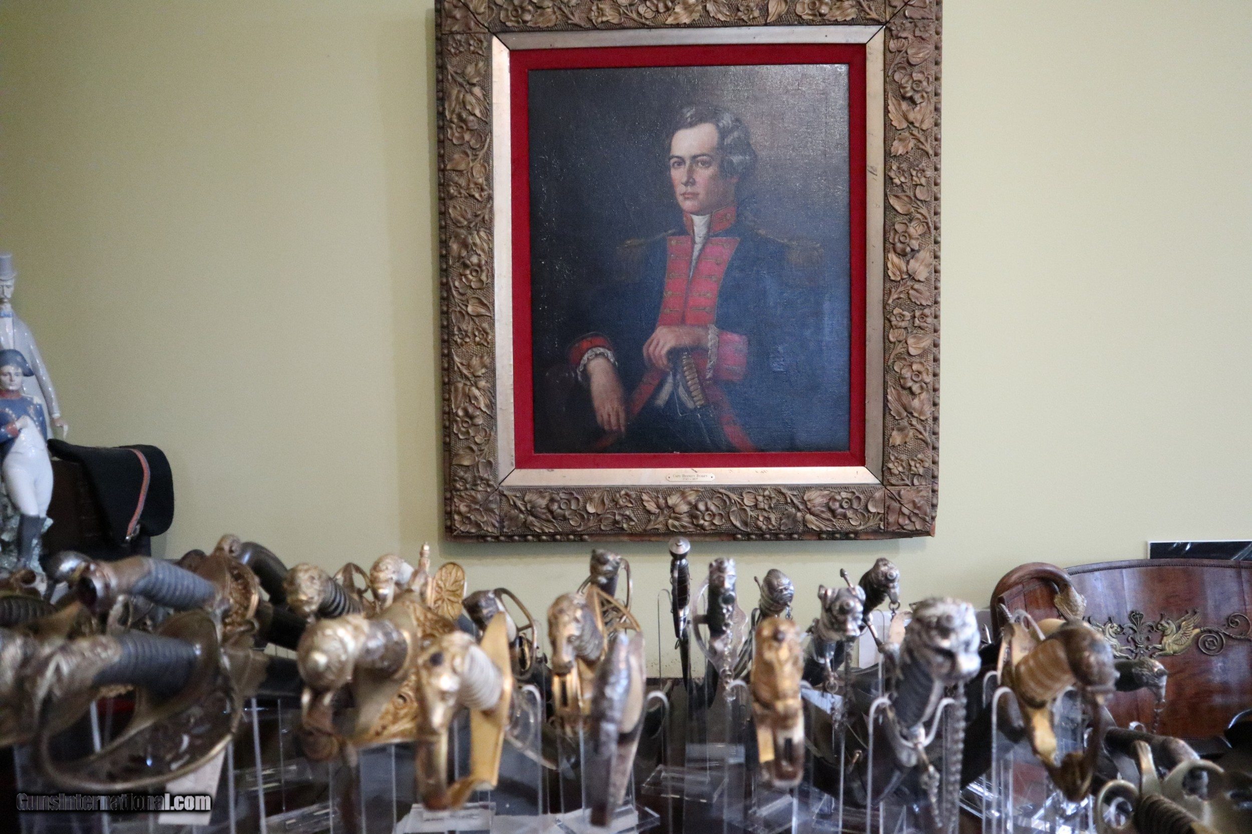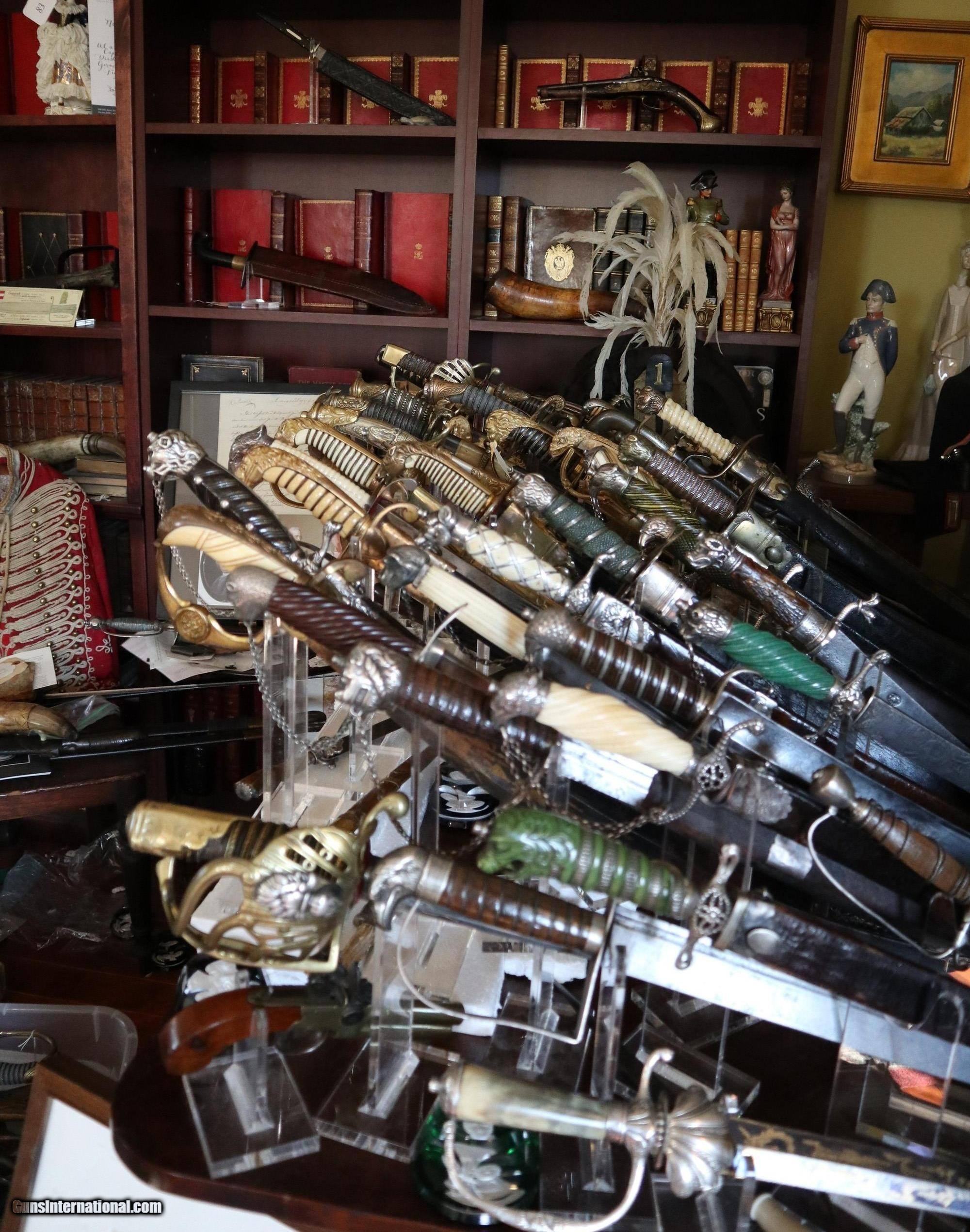 Description: PRESERVING HISTORY, PRE FRENCH-INDIAN WAR REVOLUTIONARY WAR DOG HEAD SILVER HILT SWORD CA 1670. THIS IS ONE OF A KIND PIECES OF ART, MOST LIKELY MADE FOR KING CHARLES II OR SOMEONE VERY INFLUENTIAL IN HIS COURT. THIS IS A SMALL SWORD MEASURING 23 1/2 INCHES OVERALL WITH A 18 INCH BLADE. WHEN YOU BUY THE BEST YOU WILL NEVER HAVE TO MAKE EXCUSES LATER. The design of the hilt seems is unique to this piece. It has a solid silver pommel in the form of a dog's head and solid counter-curved scaled quillons terminating in pairs of contra-facing dogs’ heads. The dogs’ heads look like those of spaniels which were popular amongst English high society, and of which King Charles II was especially fond, causing the breed to carry his name. This sword was most likely a royal commission for king Charles or someone very influential in his Court. The grip is of stag antler with a silver basal ferrule punched and chased with foliage. All the silver parts, pommel, cross guard and ferrule are clearly stamped with the pre-Britannia Silver Standard mark “WB” conjoined in raised relief inside a depressed heraldic shield. The slightly curved single-edged blade is double edged towards the point and has an armourer’s mark of a bust of a man wearing a hat facing to the right in raised relief inside an oval depression on both sides. The blade length is 18 inches , overall 23 1/2 inches long SOLD |