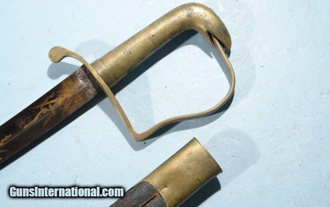 Description: RARE AMERICAN FOOT ARTILLERY MILITIA OFFICER’S PLAIN EAGLE POMMEL SWORD AND SCABBARD BY F.W. WIDMANN CA. LATE 1830’S. 29” overall with 23 ½” blade with gilded floral and martial motif etching on a fire blue ground. Plain stylized brass Eagle Pommel “D” guard hilt stamped on the forward face of the guard in an intaglio cartouche “F.W. WIDMANN/PHILADA”. Leather scabbard with plain brass mounts. Excellent condition with much fire blue and gilding on blade and traces of gilding on the face of the guard about the juncture of the blade. Scabbard excellent. 100% original and in fine condition overall. One of the few examples of this sword with a scabbard as well as one signed by Widmann. SOLD |
