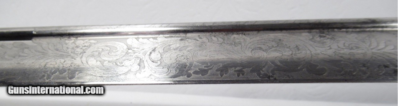 Description: SUPERB Mexican War Presentation Sword; One of Two Known, the other one sold to late Enrique E. Guerra; his was sold to him by Collectors Firearms, Houston, Texas for $7,000; Superb Mexican War Presentation Mexican Staff Officer’s Sword to the Adjutant of the 2nd New York Volunteers, Wounded in Action. Mexican War presentation sword of foreign manufacture. Regulation Mexican staff officer’s sword of undeniable European origin, made for Mexican officer, one of a group of captured Mexican officer’s swords presented to American officers. The blade is single edged, straight with a quill back blade that is etched across 45% of its surface. The etched decorations are somewhat generic with floral work, scrolls and military trophies. On both sides there is a small spread-winged eagle (without an American shield) holding a banner and standing on top of what appears to be a pile of cannon balls. No manufacturer’s name is present. The hilt is of cast brass with a wide counterguard and large half-basket knuckle guard comprising the design elements of a scallop shell with two rosettes at the base in the front and a folding counterguard panel on the rear. There are three branches spreading from the shell to the bird’s head pommel and back strap. The grip is of wood, covered in Sharkskin and wrapped with triple strand brass wire. There is a ferrule at the base of the grip. The scabbard is of nickel silver with plain brass mounts. Between the ring mounts is the bold inscription “Presented to/Lieut. J. S. McCabe/by his Company for his Gallant Conduct in the different battles in MEXICO 1847”. I was able to track down a short record of McCabe whose full name is James S. McCabe. He held the rank of Adjutant in the 2nd NY Vol. Inf. This regiment entered active duty service in the Mexican War in November 1846 and was mustered out in August 1848. McCabe is listed as being wounded in action at Churubusco. A Superb and Rare Mexican War presentation saber to a gallant officer who was wounded in action. CONDITION: Very Good. Blade has been cleaned and the etching is visible but weak in some areas. Hilt retains most of its Original Gilt Finish. Grip is fine showing only light wear and the scabbard is excellent with no dents. Provenance – Julia Oct. 9-11, 2006; Mike Heskett, New Braunfels, TX Collection SOLD |