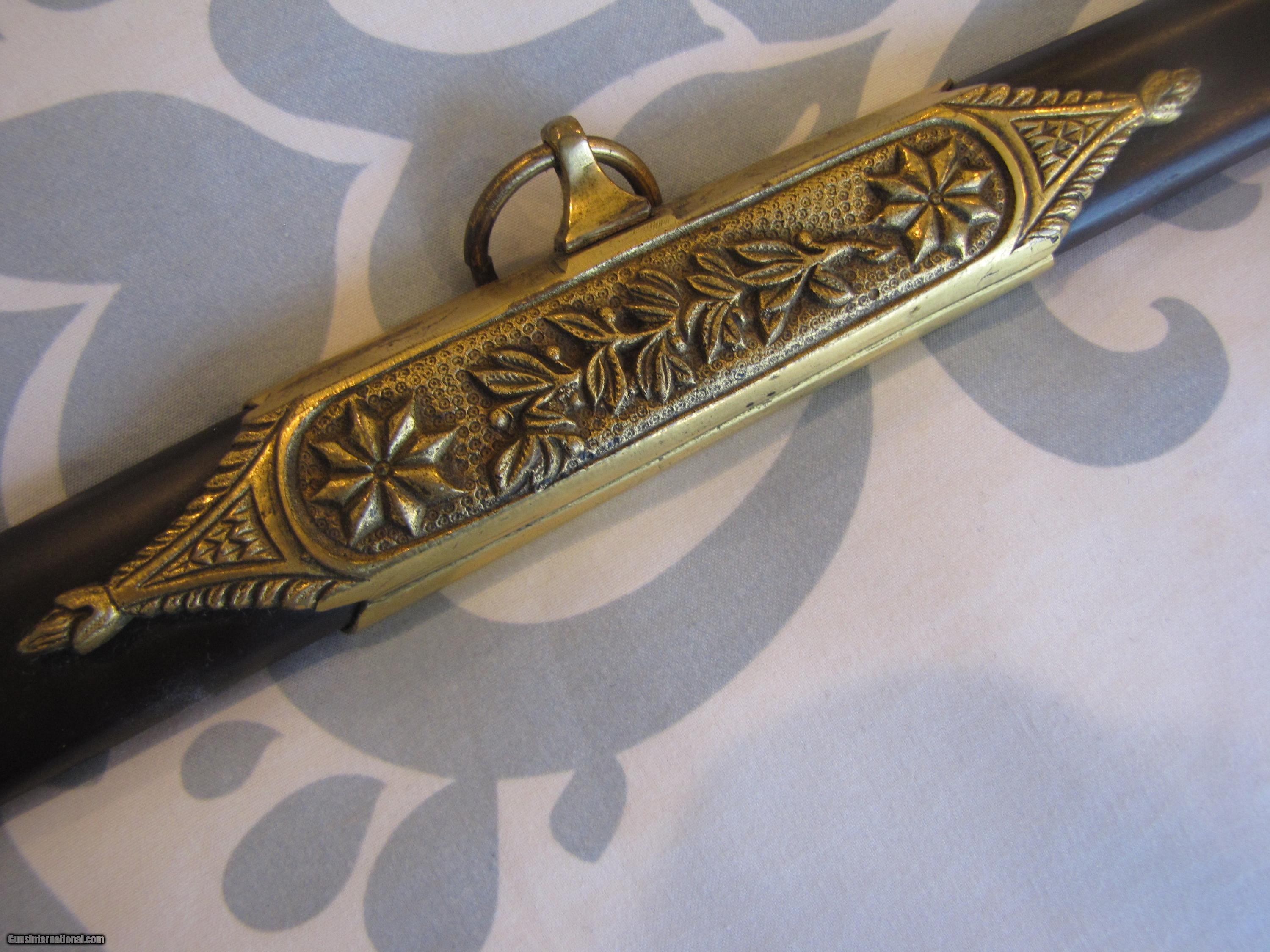 Description: This is an original 1840 UNITED STATES MEDICAL STAFF sword in near mint condition, bought in the 1960's. The blade is frosty and has the UNITED STATES MEDICAL STAFF motto frosty engraved on the blade with foral design, on the other side again foral , and an eagle , with E. PLURIBUS UNUM ON A RIBBON. The scabbard has 98% gold wash intact on the grip, the cross guard, both hangers and drag ,just as ornate as can be. The M.S. AND THIRTEEN stars on the cross guard as the total sword are as near mint as it comes, this was collected so early there is no wear. The brown painted on the scabbard is unbelieveable unworn. You can not find a model 1840 Medical Staff sword in any better condition than this . The sword has not been presented so the shield is open on the reverse. The blade is the early rounded. Just a Rare sword in near mint condition, if your looking for this model this should be your choice. SOLD |