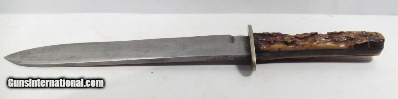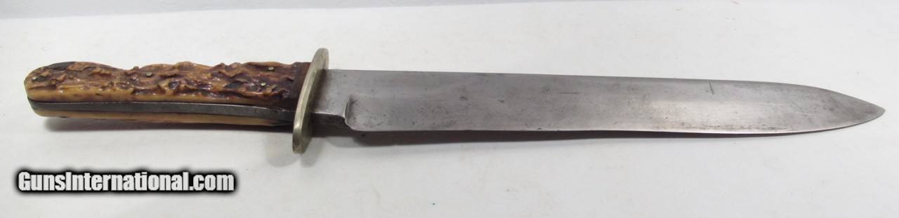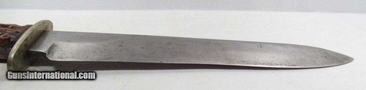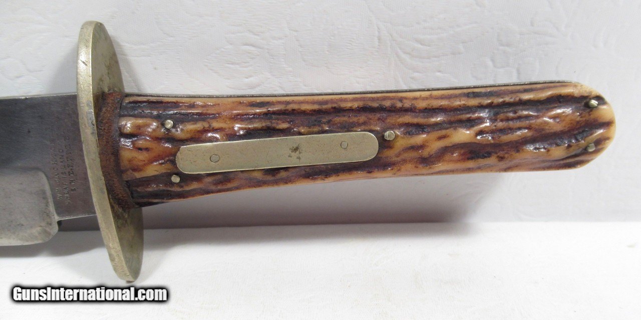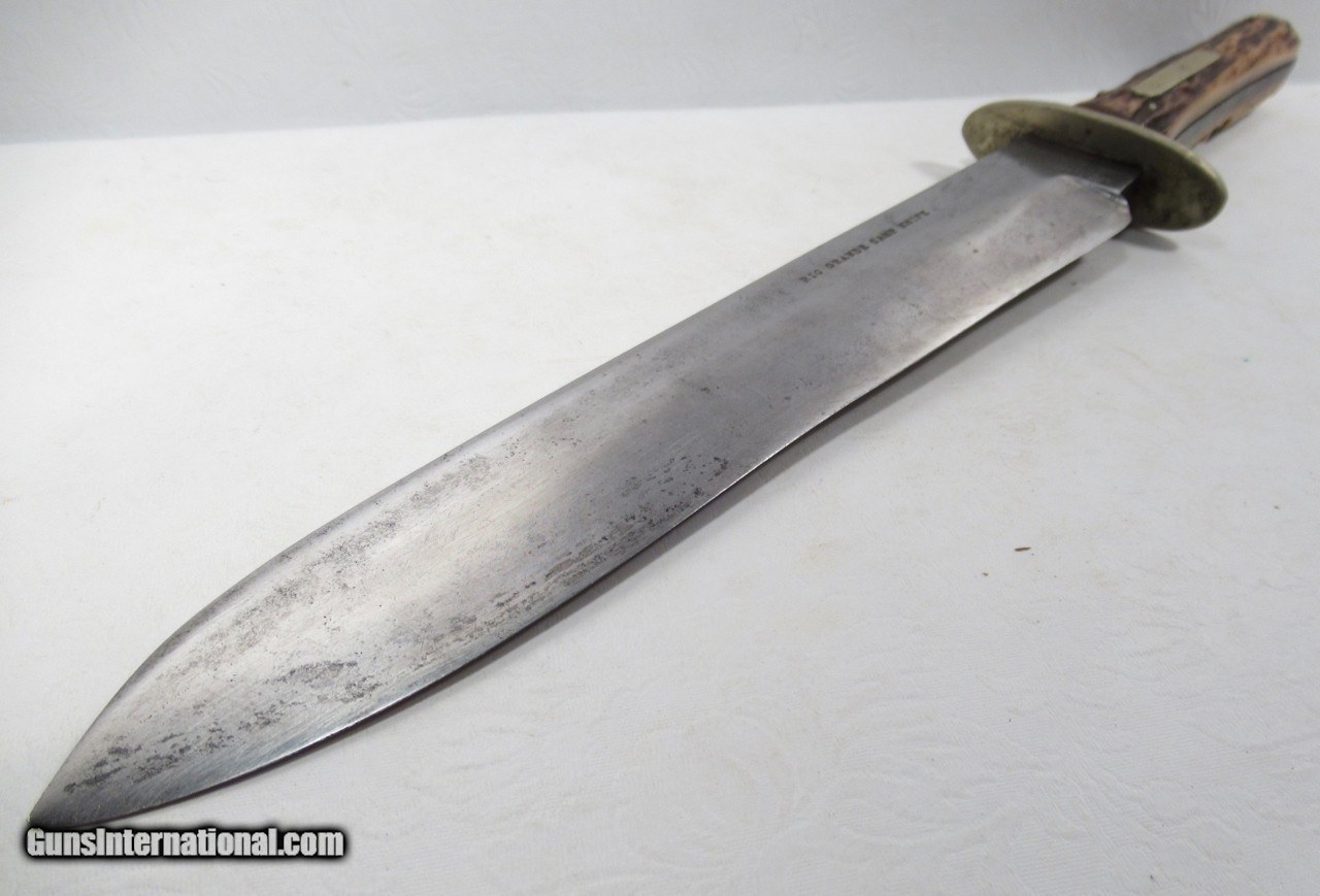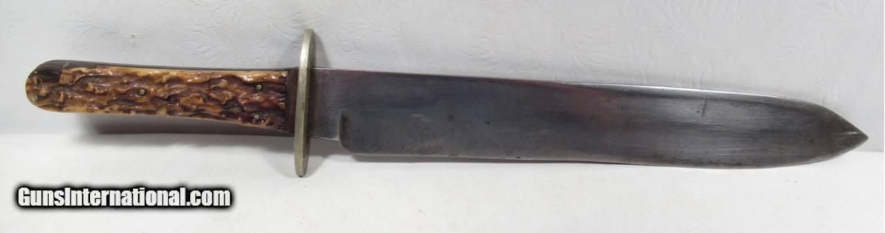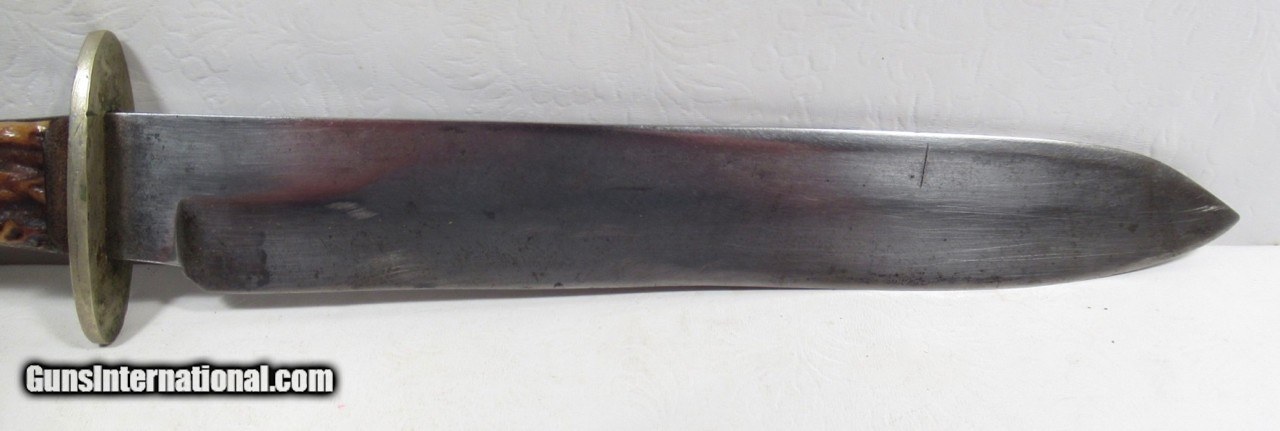 Description: William Jackson & Co. Bowie Knife; 10” Spear Point Blade; 15” L.O.A.; Stag Hilt; Marked “Rio Grande Camp Knife” on Obverse Blade; Circa 1850; See All Photos for Condition; No Texts. Call or Email Only; PERSONAL PROPERTY of Harold Wieser; Price: $3,475 + $45 S&H Via FedEx Express; Price includes insured shipping; return policy: three days inspection from the date the item is received; full refund of shipping both ways ONLY IF THE ITEM IS MISREPRESENTED. SOLD |