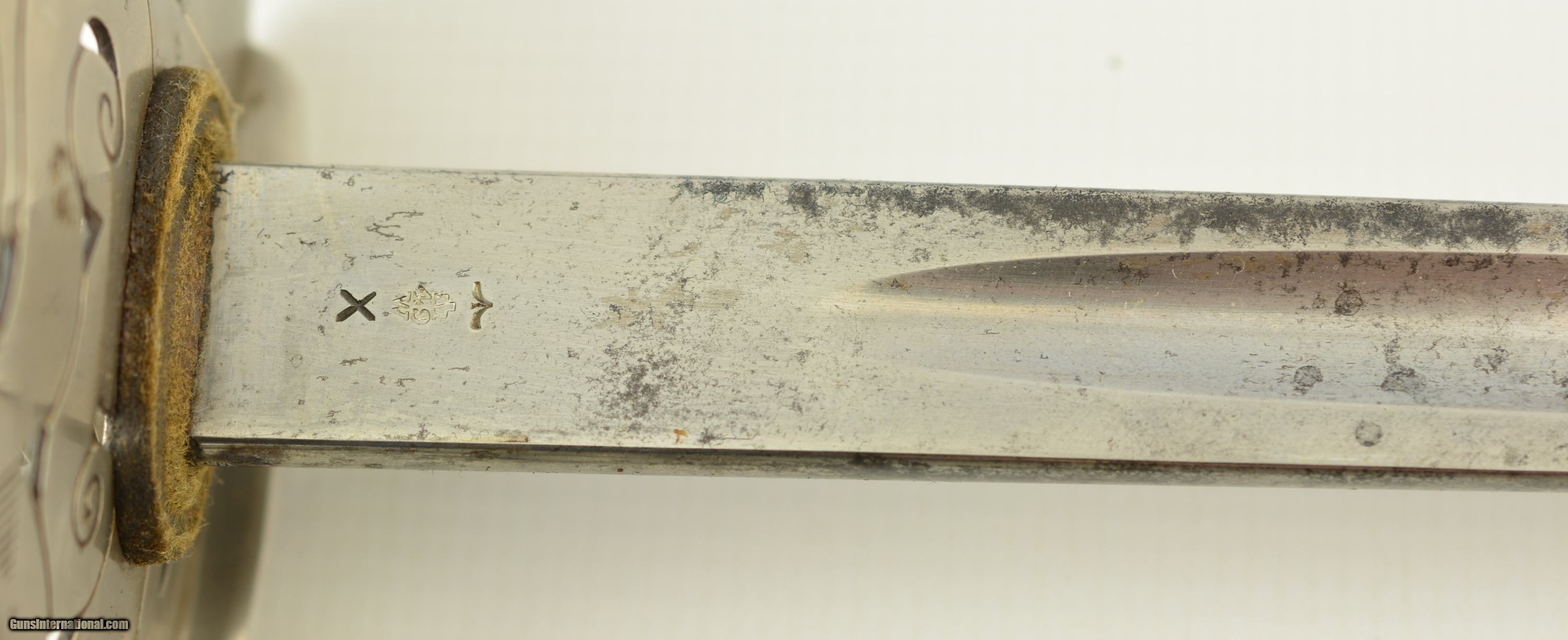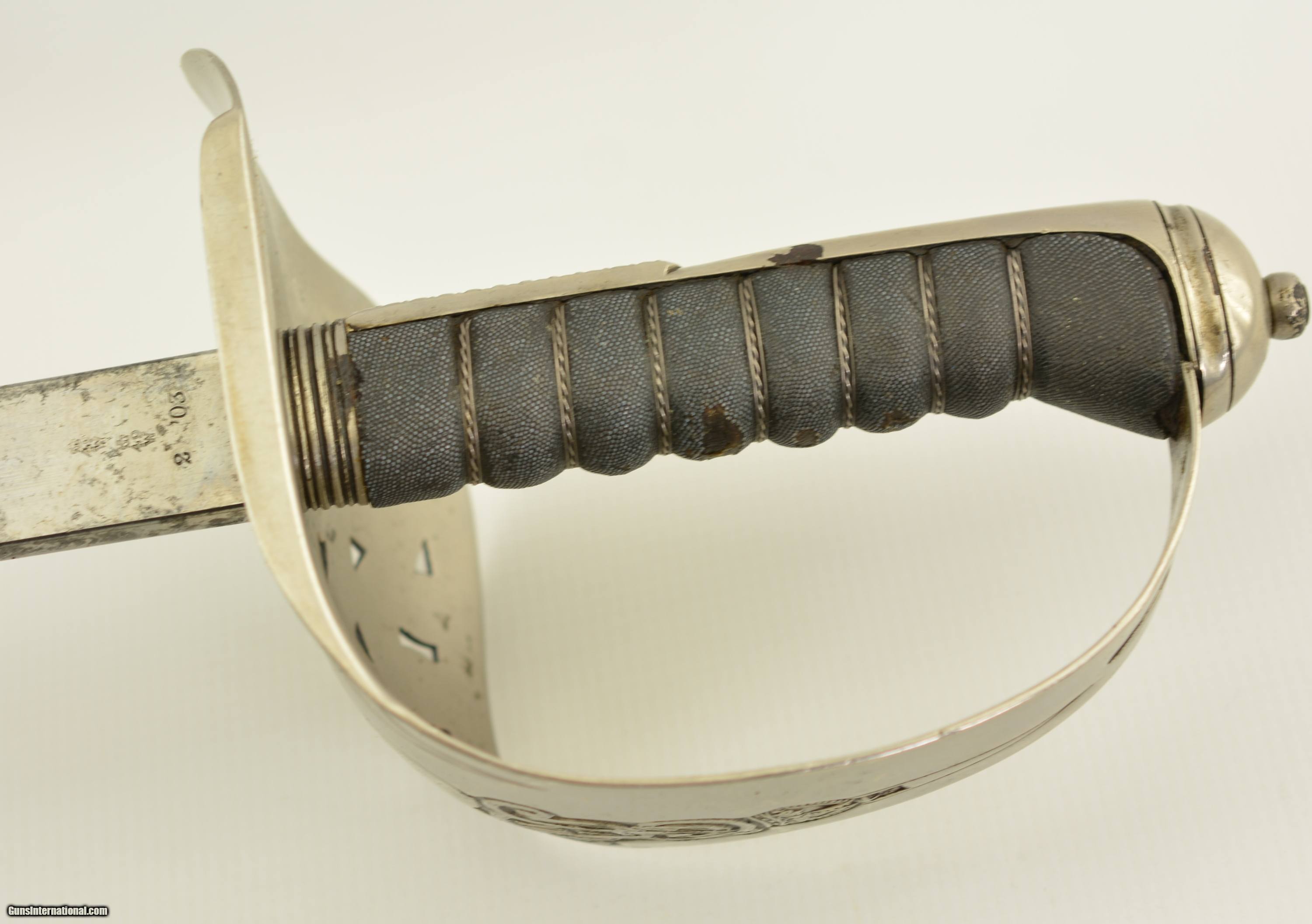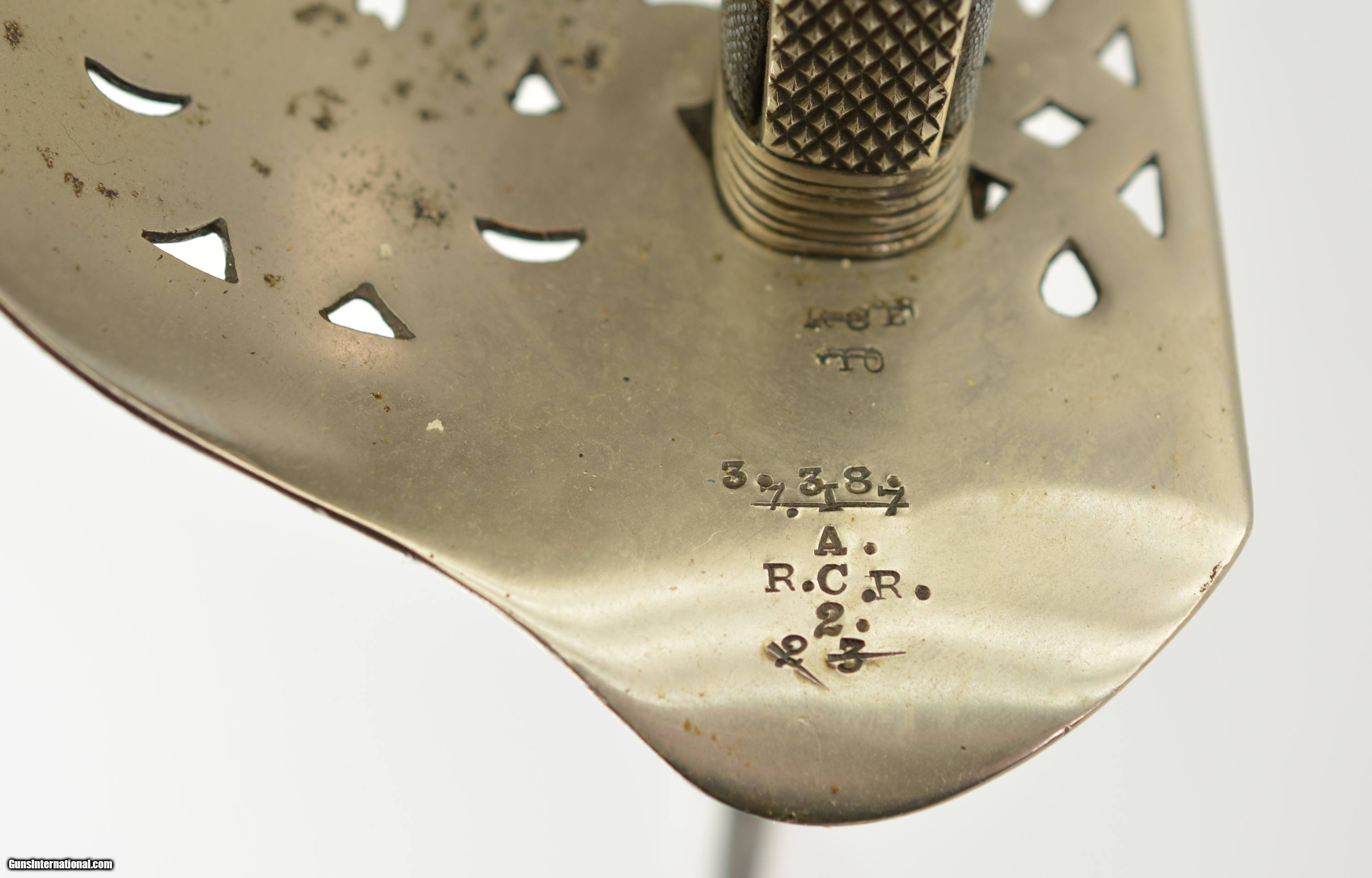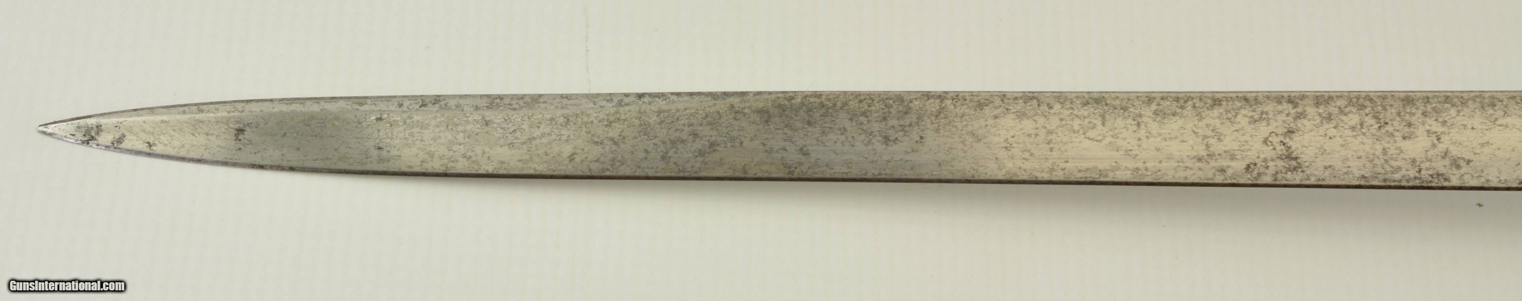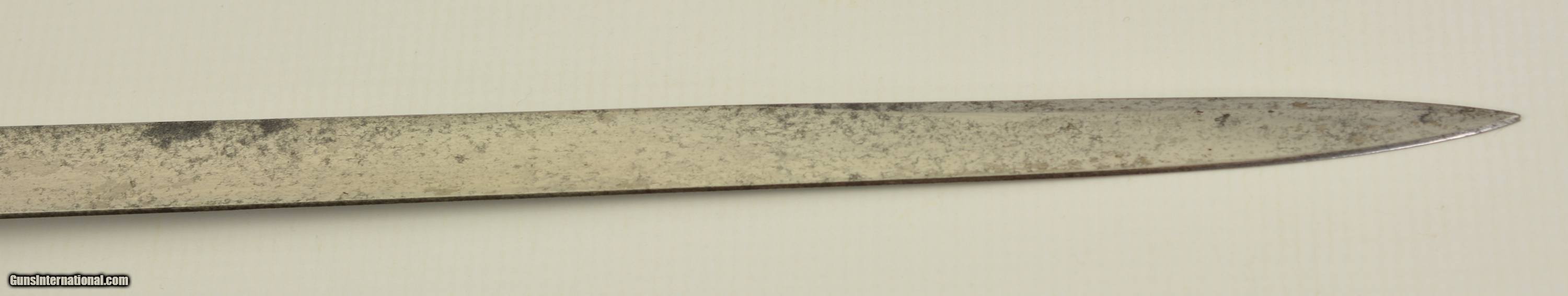 Description: This is an attractive sword that measures 38 3/4" overall with a 32 1/2" straight, single-edged blade having short, unstopped fullers. The steel has an overall bright gray patina with scattered spots of dark freckling on both sides. The ricasso has British military acceptance proofs on both sides, as well as a 2 ’03 date on the reverse. The hilt has a pierced, Edward VII cypher-marked guard, and has scattered spots of dark brown oxidation here and there. The interior of the guard has a series of crossed out unit markings along with a clear “A. / R.C.R. / 2" (Royal Canadian Regiment, 2nd Battalion). The scabbard patina matches the rest of the fittings, but does exhibit some dark plum-brown underlying metal where the nickel has flaked away, especially near the hanger rings and at the drag. This is a handsome, RCR-marked sword, and rates very good-near fine condition. SOLD Manufacturer: Canadian Model: Sword |