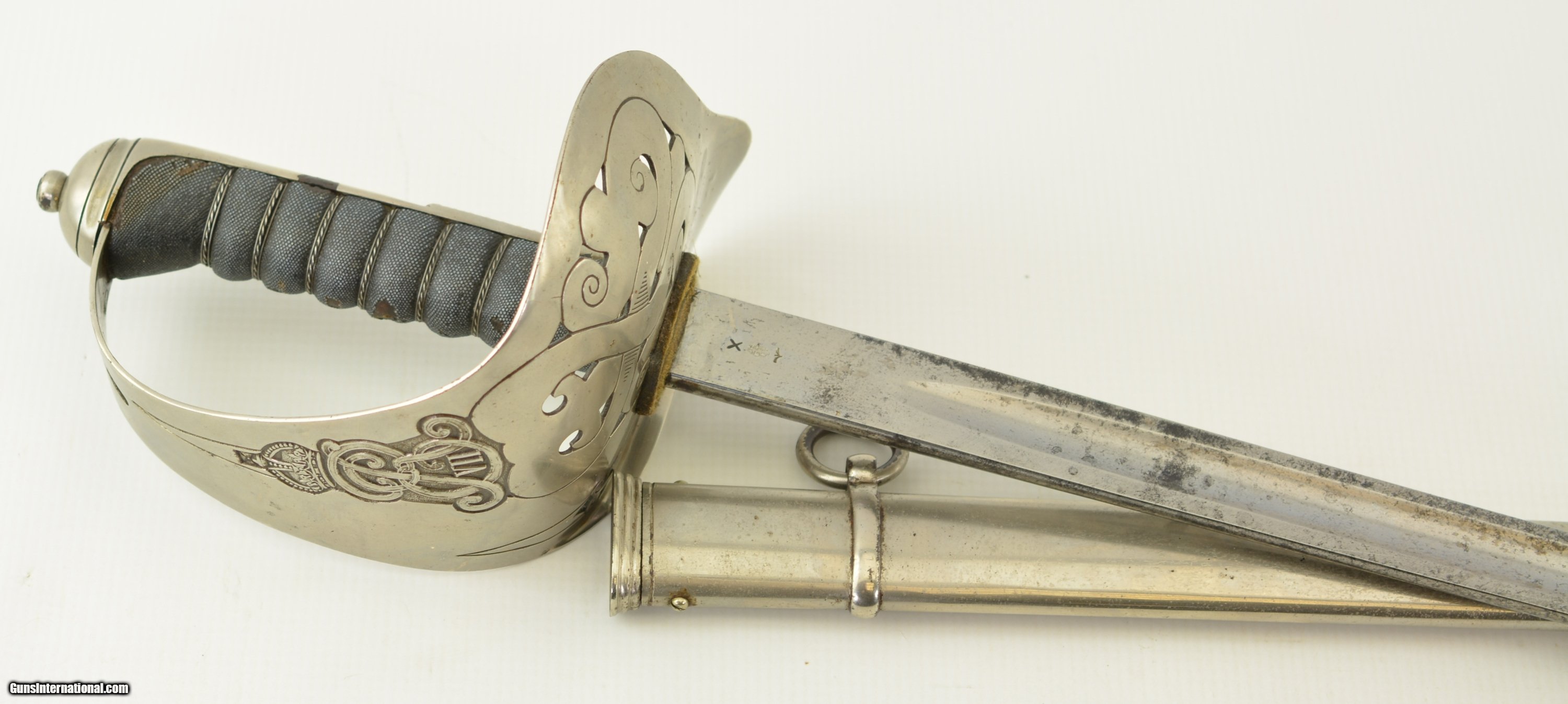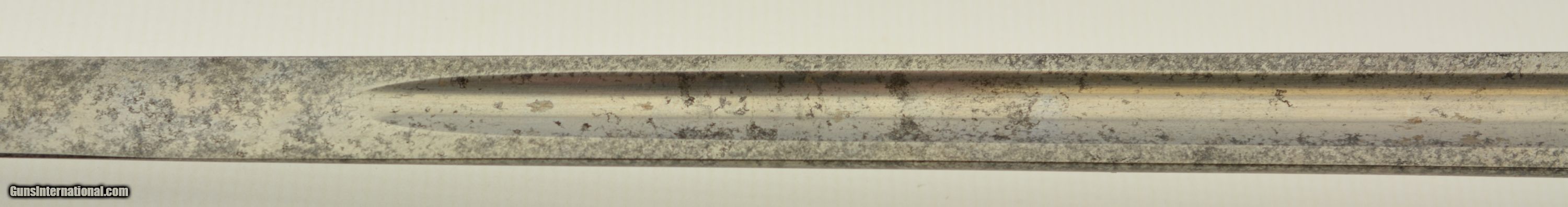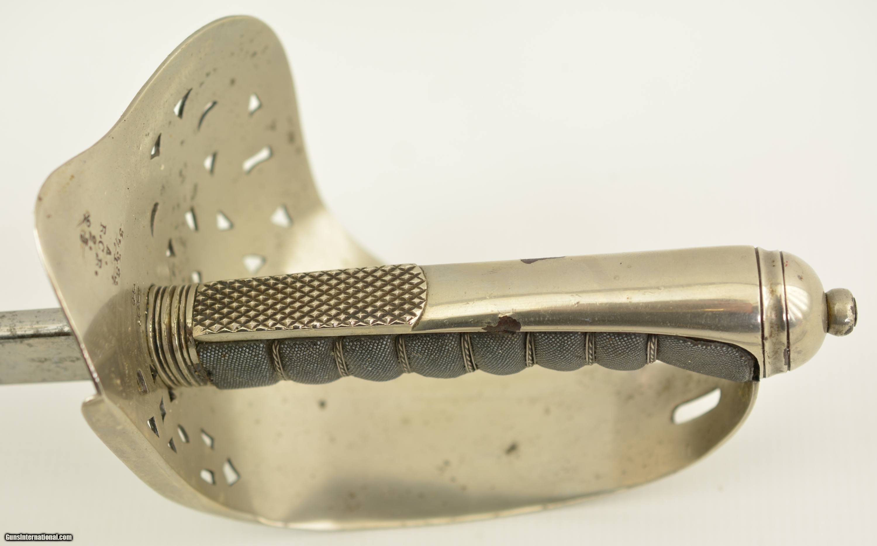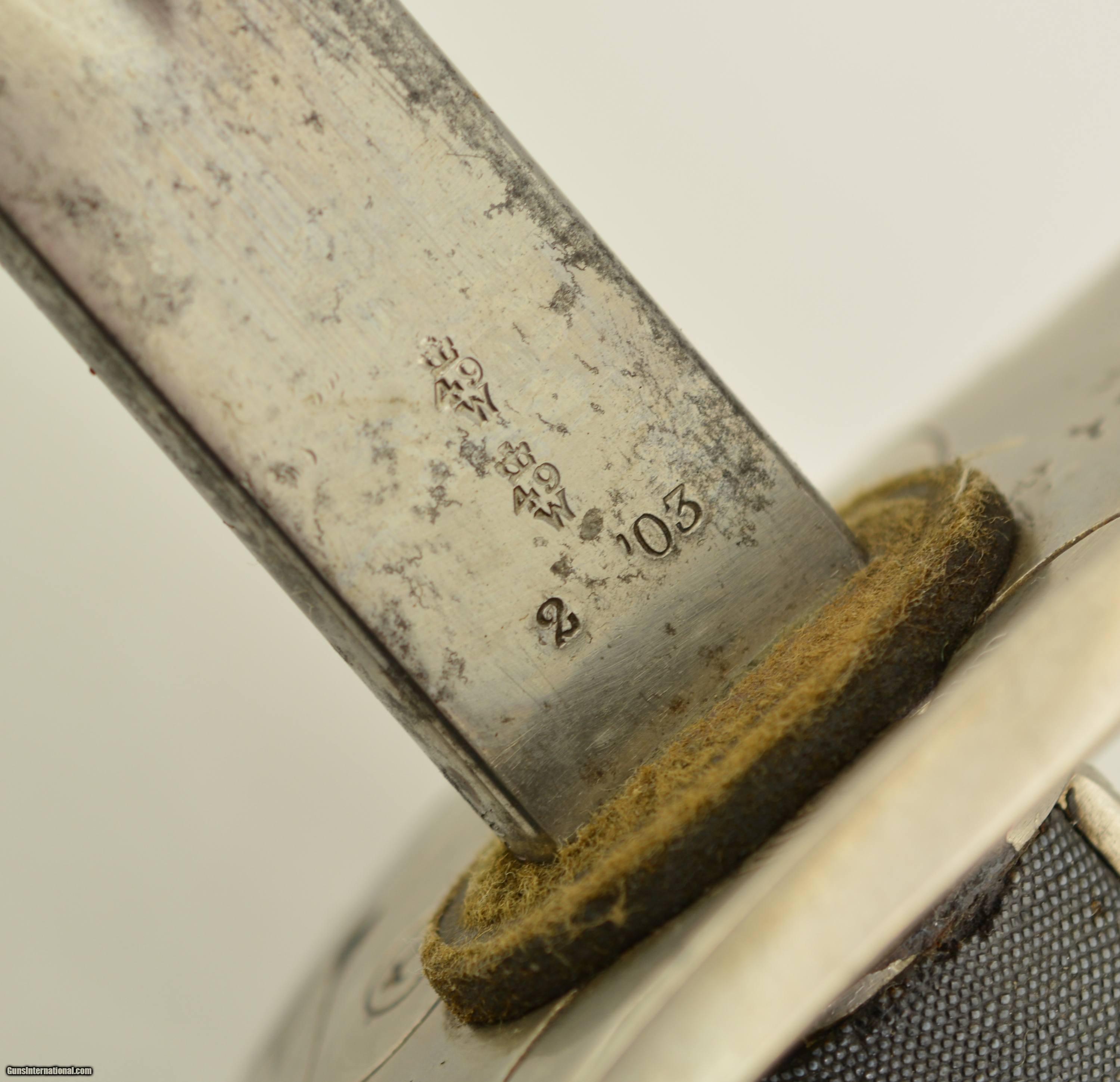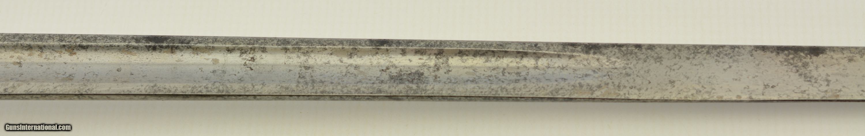 Description: This is an attractive sword that measures 38 3/4" overall with a 32 1/2" straight, single-edged blade having short, unstopped fullers. The steel has an overall bright gray patina with scattered spots of dark freckling on both sides. The ricasso has British military acceptance proofs on both sides, as well as a 2 ’03 date on the reverse. The hilt has a pierced, Edward VII cypher-marked guard, and has scattered spots of dark brown oxidation here and there. The interior of the guard has a series of crossed out unit markings along with a clear “A. / R.C.R. / 2" (Royal Canadian Regiment, 2nd Battalion). The scabbard patina matches the rest of the fittings, but does exhibit some dark plum-brown underlying metal where the nickel has flaked away, especially near the hanger rings and at the drag. This is a handsome, RCR-marked sword, and rates very good-near fine condition. SOLD Manufacturer: Canadian Model: Sword |