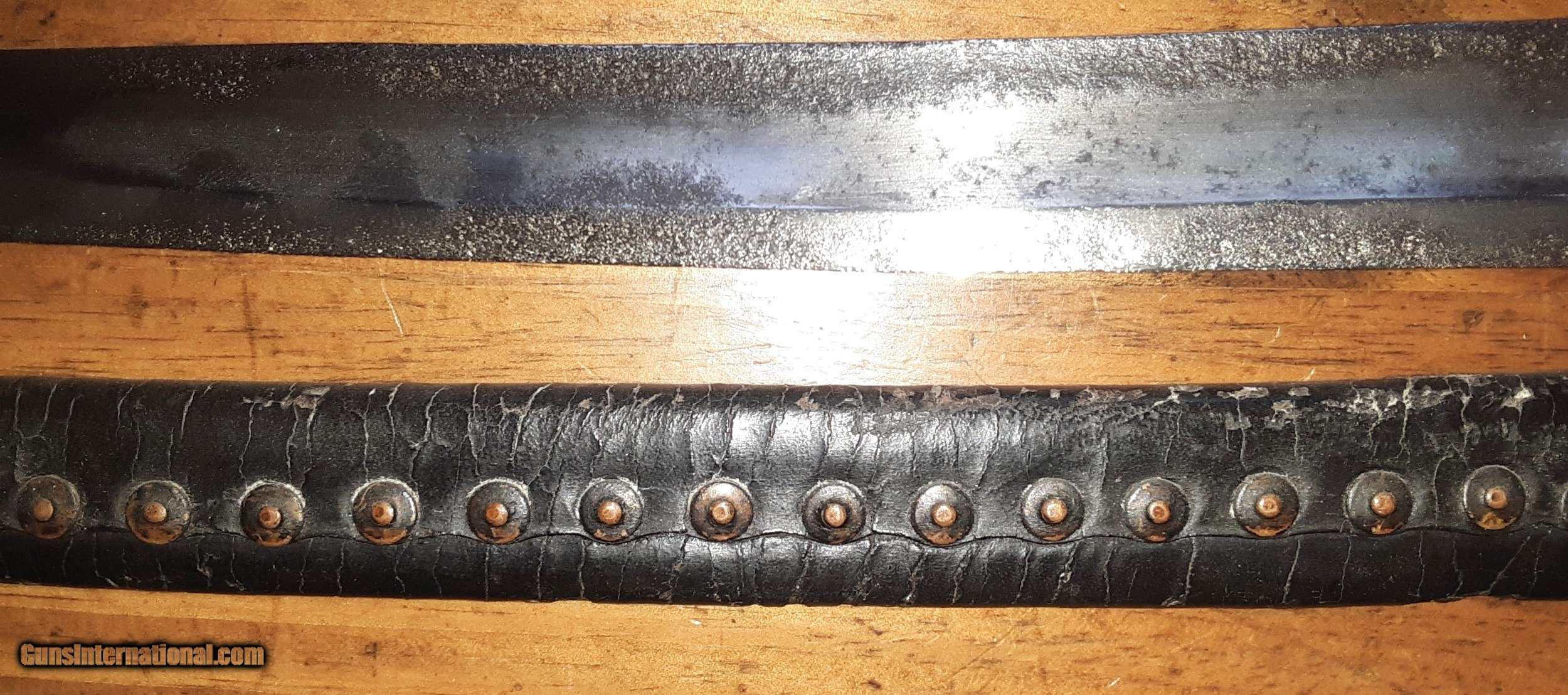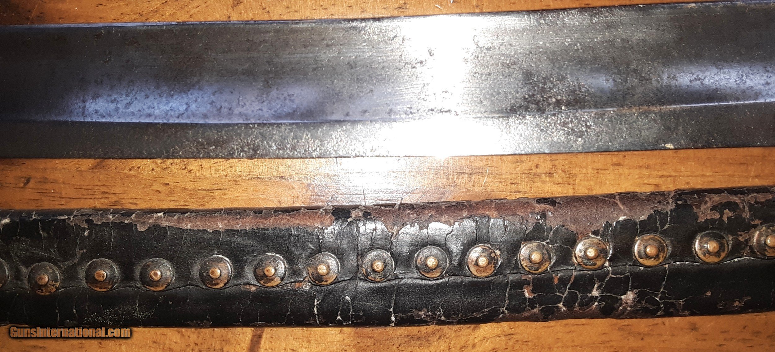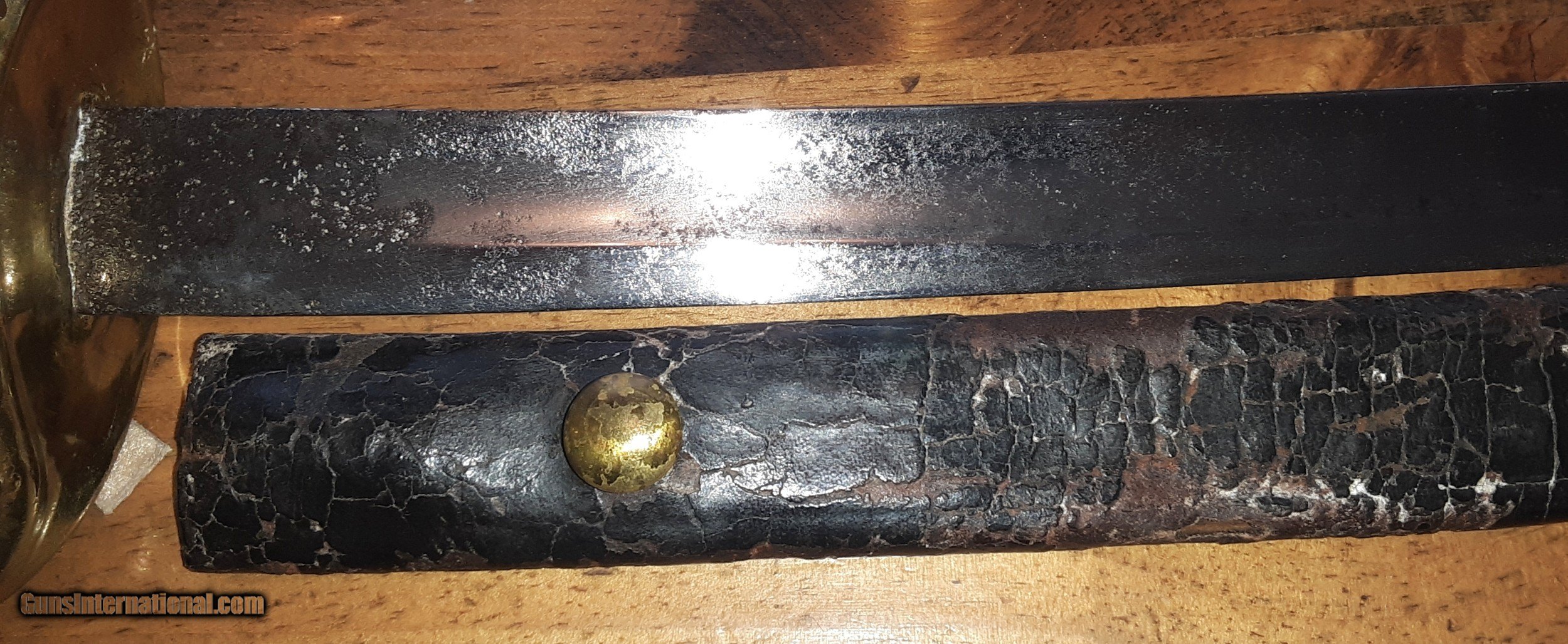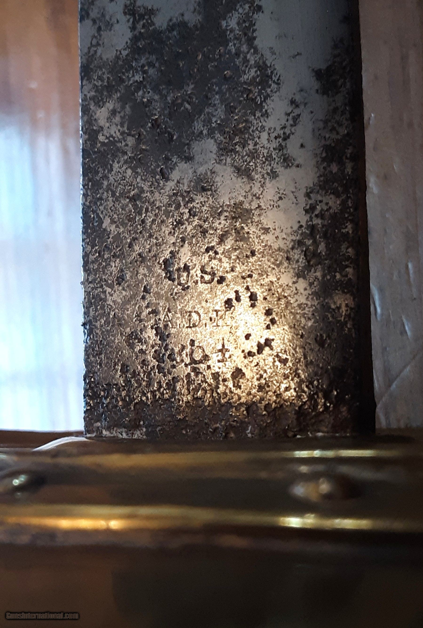 Description: Here is a sword very few collectors know about, never mind have in their collection. In January 1864 the Army placed an order with the Ames Manufacturing Company for 300 Model 1860 Navy Cutlasses. These cutlasses were delivered in February 1864. These cutlasses will not have the "USN", anchor, or production numbers stamped on the handguard that you typically find on the Navy contract cutlasses. The Army cutlasses will be dated 1864, and the blade ricasso and pommel tang will have the inspector initials "A.D.K." for Army inspector Andrew D. King. These Army Cutlasses were issued to the 3rd Battalion (Companies I, K, L, and M) of the 13th New York Heavy Artillery. This battalion initially served as a guard aboard vessels of war along the Atlantic coast, and in July 1864 transferred to the Army of the James, and as the "Naval Brigade" served on gunboats along the James River. It is rare to find one of these cutlasses with only a handful known to still exhist. Of the 4 that I have personally seen in over 30 years of collecting, this is the only one that had an original scabbard. The hilt of the cutlass is missing the wire (often intentionally removed due the corrosive nature of salt water on the brass wire) and the leather wrap. The blade does have areas of pitting scattered along the blade, particularly near the markings at the ricasso. But most of the Ames maker mark, date, and A.D.K. inspector initials are visible. Despite some flaking of the outer layer, the scabbard remains strong. There is one small hole in the upper third of the scabbard, on the blade edge side. The basket hilt is in beautiful condition with no dents, and the A.D.K. inspector initials are very clear on the tang. Despite its flaws, this is a very presentable example of a very rare sword, I think all the more special because we know to what regiment it was issued and where it served during the war. You can't know that about most of the unmarked swords in your collection. Please take a look at all the photos as they provide the best description. Shipping to the lower contiguous 48 states. Shipping cost $30.00. SOLD |