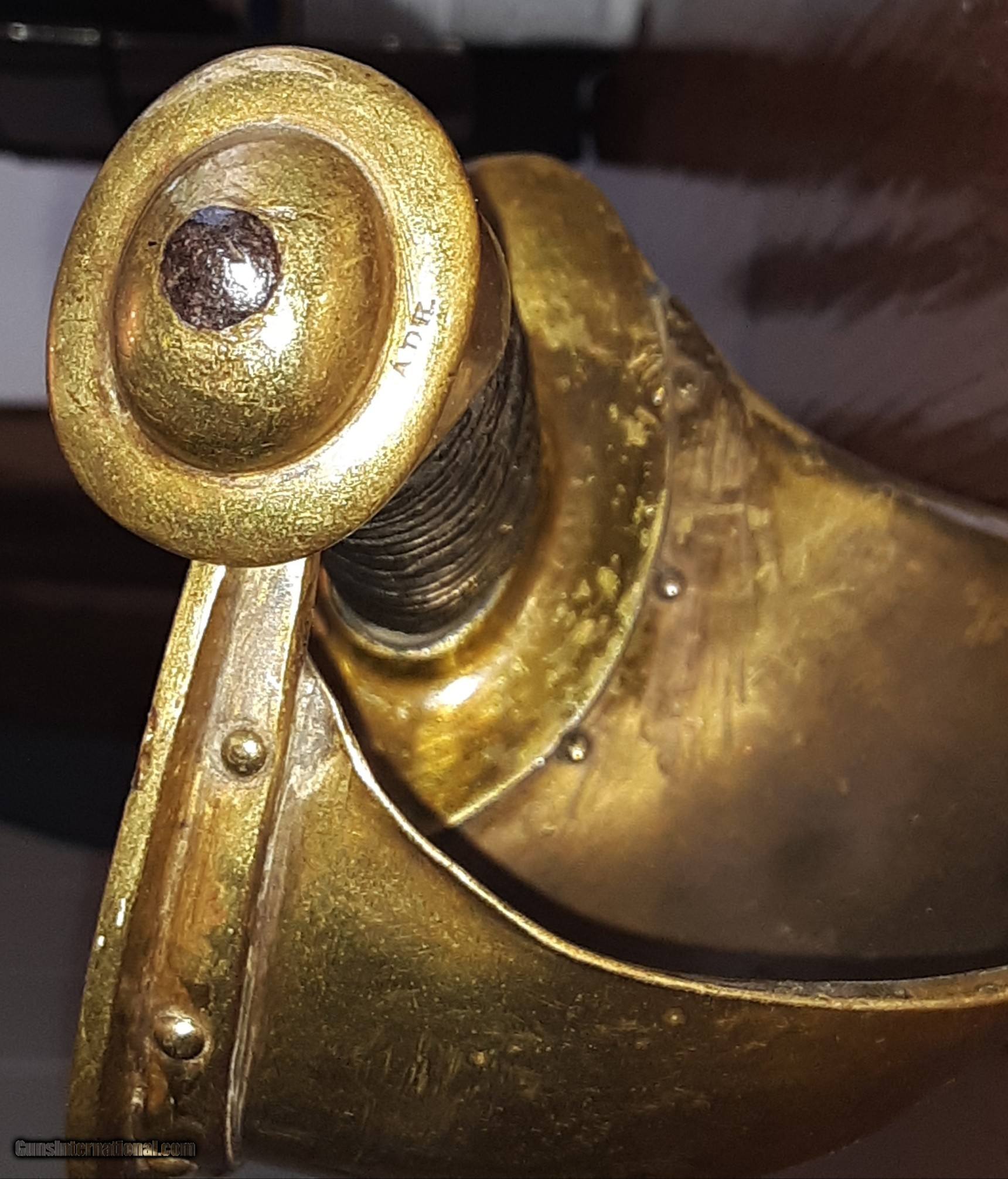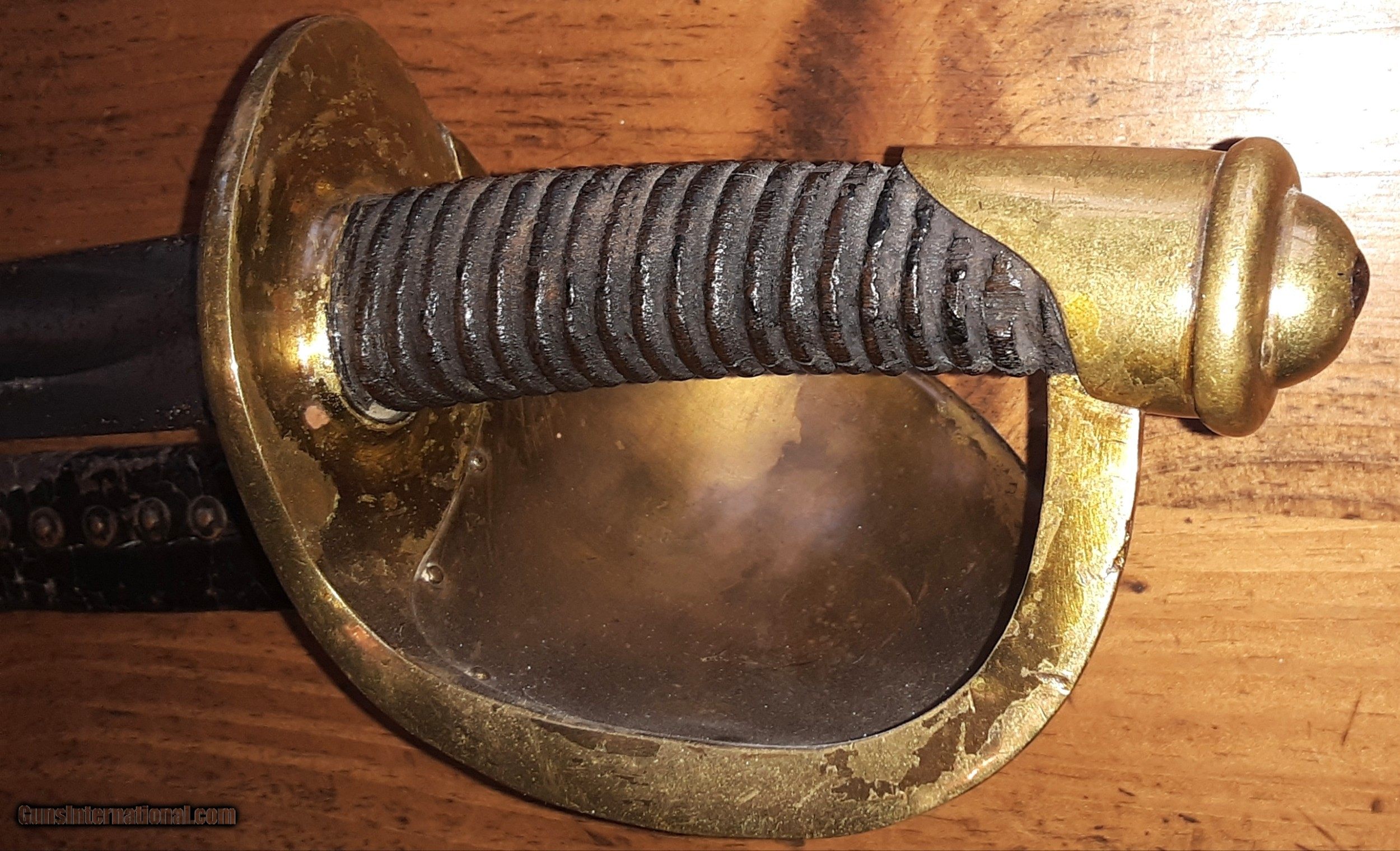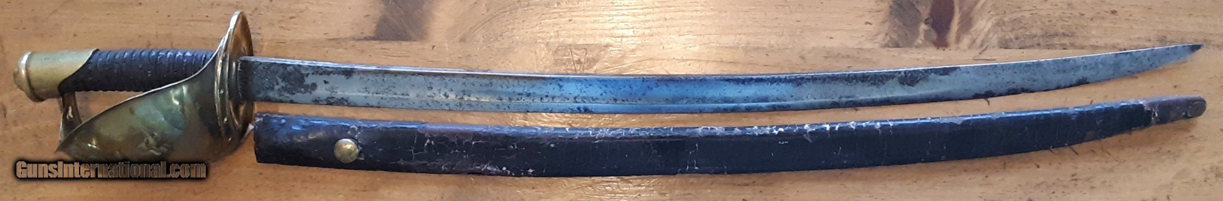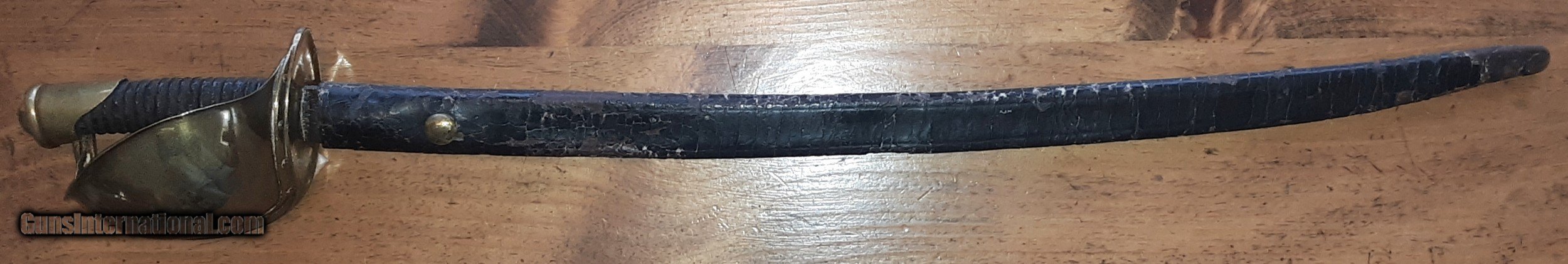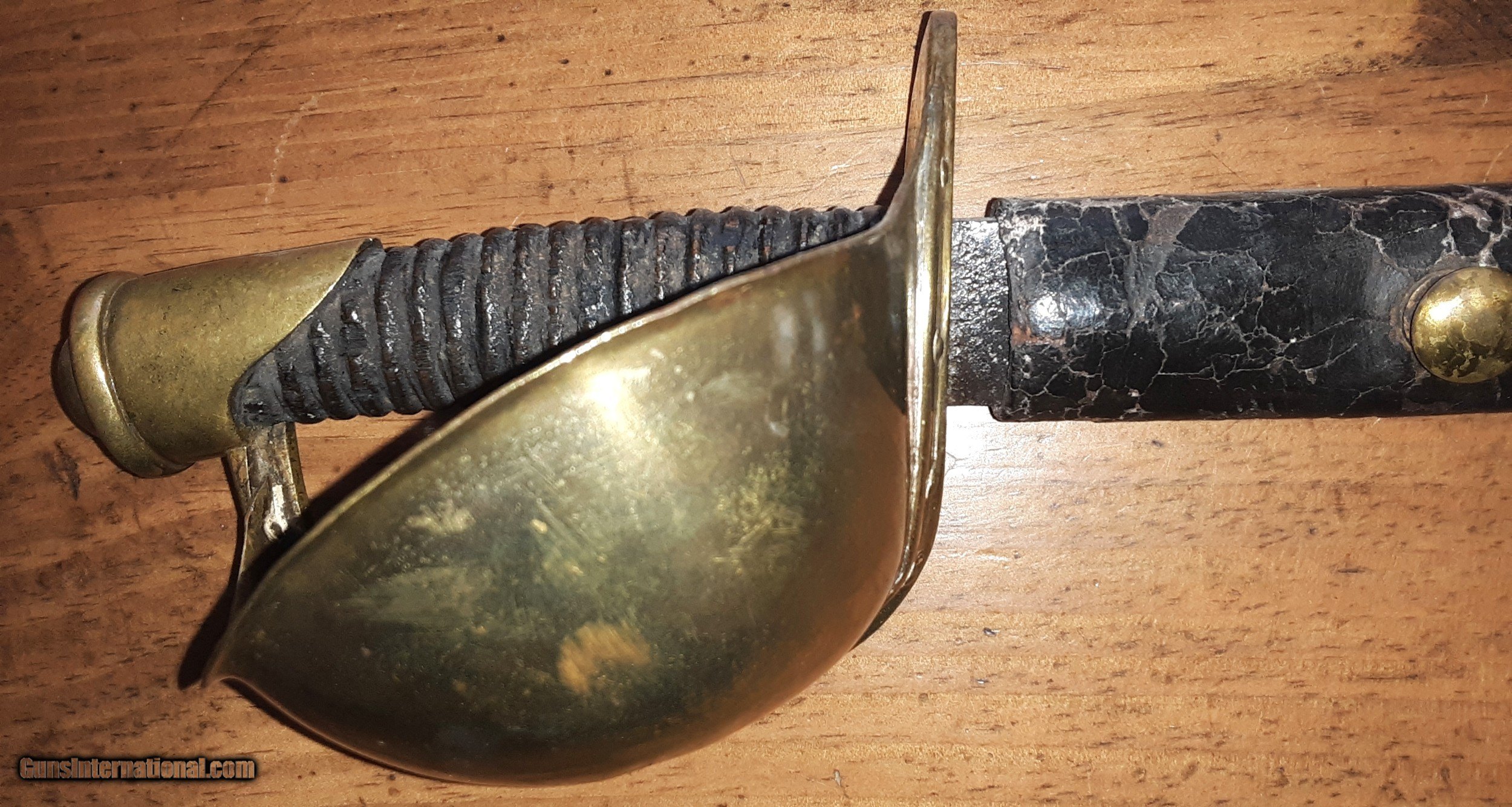 Description: Here is a sword very few collectors know about, never mind have in their collection. In January 1864 the Army placed an order with the Ames Manufacturing Company for 300 Model 1860 Navy Cutlasses. These cutlasses were delivered in February 1864. These cutlasses will not have the "USN", anchor, or production numbers stamped on the handguard that you typically find on the Navy contract cutlasses. The Army cutlasses will be dated 1864, and the blade ricasso and pommel tang will have the inspector initials "A.D.K." for Army inspector Andrew D. King. These Army Cutlasses were issued to the 3rd Battalion (Companies I, K, L, and M) of the 13th New York Heavy Artillery. This battalion initially served as a guard aboard vessels of war along the Atlantic coast, and in July 1864 transferred to the Army of the James, and as the "Naval Brigade" served on gunboats along the James River. It is rare to find one of these cutlasses with only a handful known to still exhist. Of the 4 that I have personally seen in over 30 years of collecting, this is the only one that had an original scabbard. The hilt of the cutlass is missing the wire (often intentionally removed due the corrosive nature of salt water on the brass wire) and the leather wrap. The blade does have areas of pitting scattered along the blade, particularly near the markings at the ricasso. But most of the Ames maker mark, date, and A.D.K. inspector initials are visible. Despite some flaking of the outer layer, the scabbard remains strong. There is one small hole in the upper third of the scabbard, on the blade edge side. The basket hilt is in beautiful condition with no dents, and the A.D.K. inspector initials are very clear on the tang. Despite its flaws, this is a very presentable example of a very rare sword, I think all the more special because we know to what regiment it was issued and where it served during the war. You can't know that about most of the unmarked swords in your collection. Please take a look at all the photos as they provide the best description. Shipping to the lower contiguous 48 states. Shipping cost $30.00. SOLD |