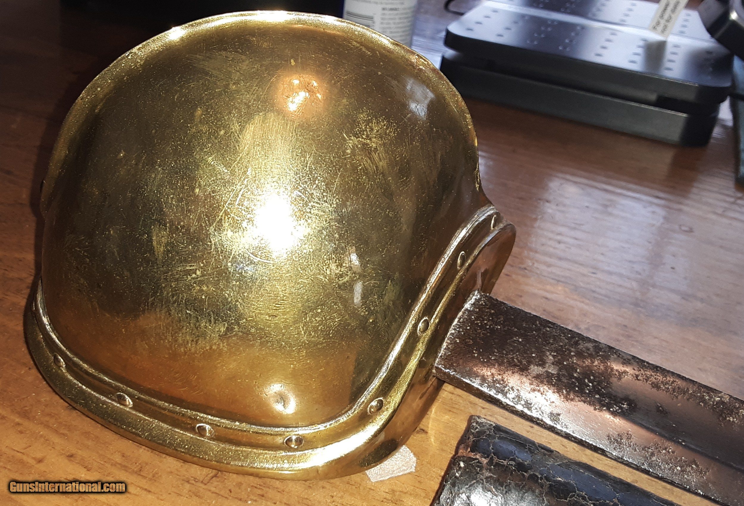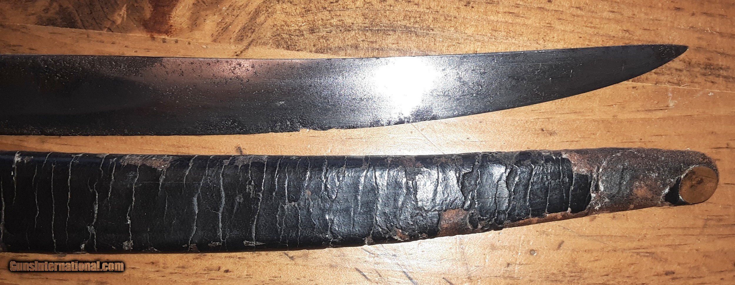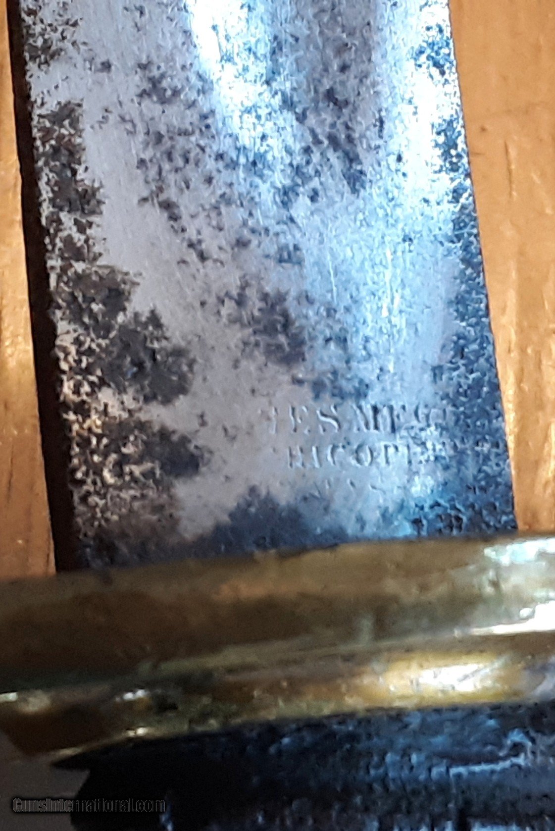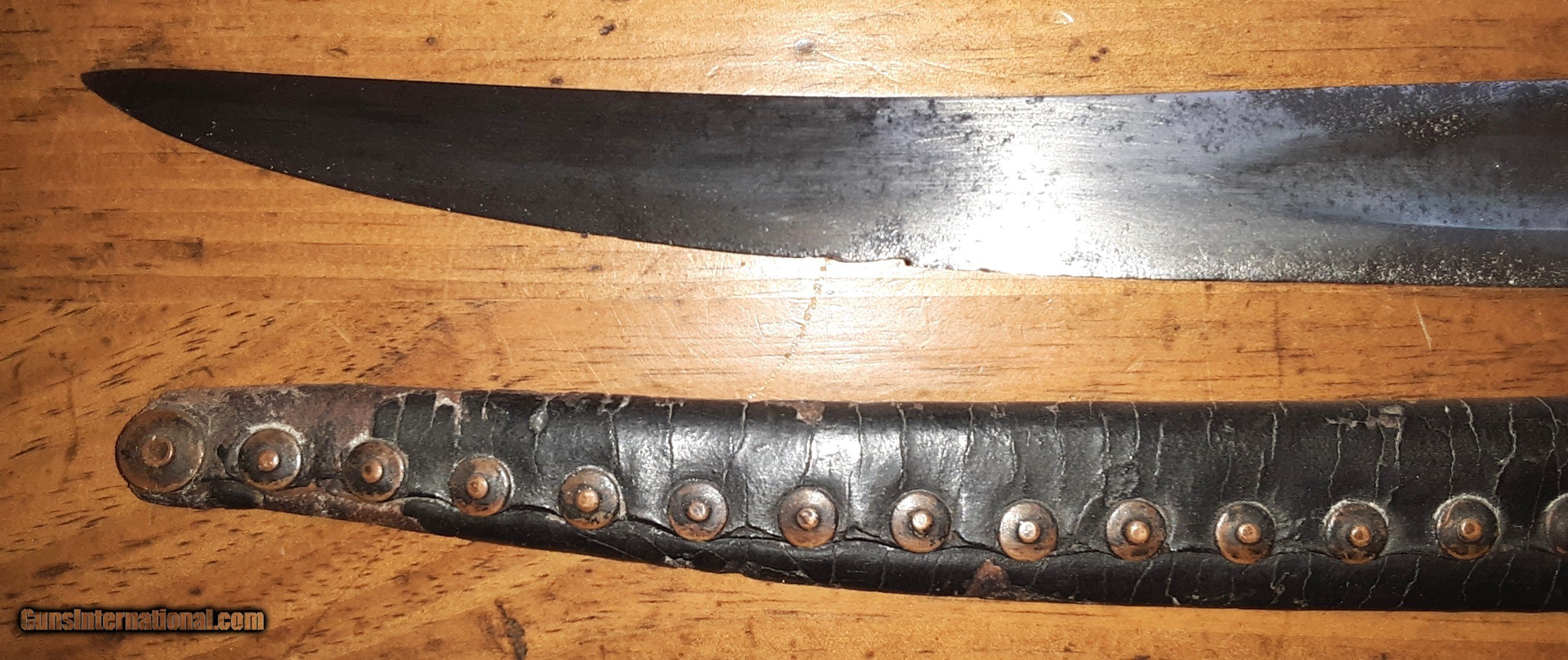 Description: Here is a sword very few collectors know about, never mind have in their collection. In January 1864 the Army placed an order with the Ames Manufacturing Company for 300 Model 1860 Navy Cutlasses. These cutlasses were delivered in February 1864. These cutlasses will not have the "USN", anchor, or production numbers stamped on the handguard that you typically find on the Navy contract cutlasses. The Army cutlasses will be dated 1864, and the blade ricasso and pommel tang will have the inspector initials "A.D.K." for Army inspector Andrew D. King. These Army Cutlasses were issued to the 3rd Battalion (Companies I, K, L, and M) of the 13th New York Heavy Artillery. This battalion initially served as a guard aboard vessels of war along the Atlantic coast, and in July 1864 transferred to the Army of the James, and as the "Naval Brigade" served on gunboats along the James River. It is rare to find one of these cutlasses with only a handful known to still exhist. Of the 4 that I have personally seen in over 30 years of collecting, this is the only one that had an original scabbard. The hilt of the cutlass is missing the wire (often intentionally removed due the corrosive nature of salt water on the brass wire) and the leather wrap. The blade does have areas of pitting scattered along the blade, particularly near the markings at the ricasso. But most of the Ames maker mark, date, and A.D.K. inspector initials are visible. Despite some flaking of the outer layer, the scabbard remains strong. There is one small hole in the upper third of the scabbard, on the blade edge side. The basket hilt is in beautiful condition with no dents, and the A.D.K. inspector initials are very clear on the tang. Despite its flaws, this is a very presentable example of a very rare sword, I think all the more special because we know to what regiment it was issued and where it served during the war. You can't know that about most of the unmarked swords in your collection. Please take a look at all the photos as they provide the best description. Shipping to the lower contiguous 48 states. Shipping cost $30.00. SOLD |