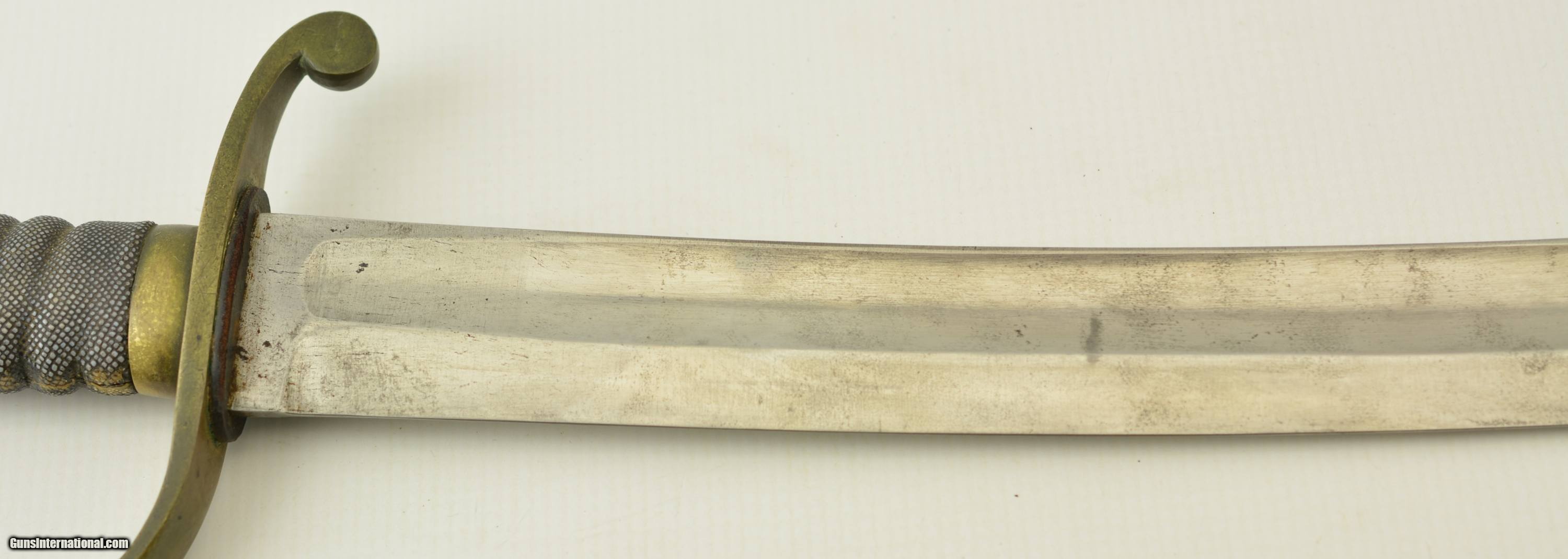Description: A Victorian era British police sword with no marks which is more often than not the usual case. The 24" curved blade has a 22 1/2" fuller and a 7" sharpened back edge. The grip is of fishskin with wire winding, (The wire is now missing). The guard, griping ring and pommel are brass as are the throat and tip of the leather scabbard. The sword has a button actuated catch that locks into the scabbard throat. The scabbard throat has a stud for a frog. Fine overall condition with the blade showing no nicks or pings with only the grip wire missing. Also included is a photocopy of two pages from the book "The Policeman's Lot", a 1985 English publication. Antique SOLD Manufacturer: British Model: Sword Serial Number: NSN |