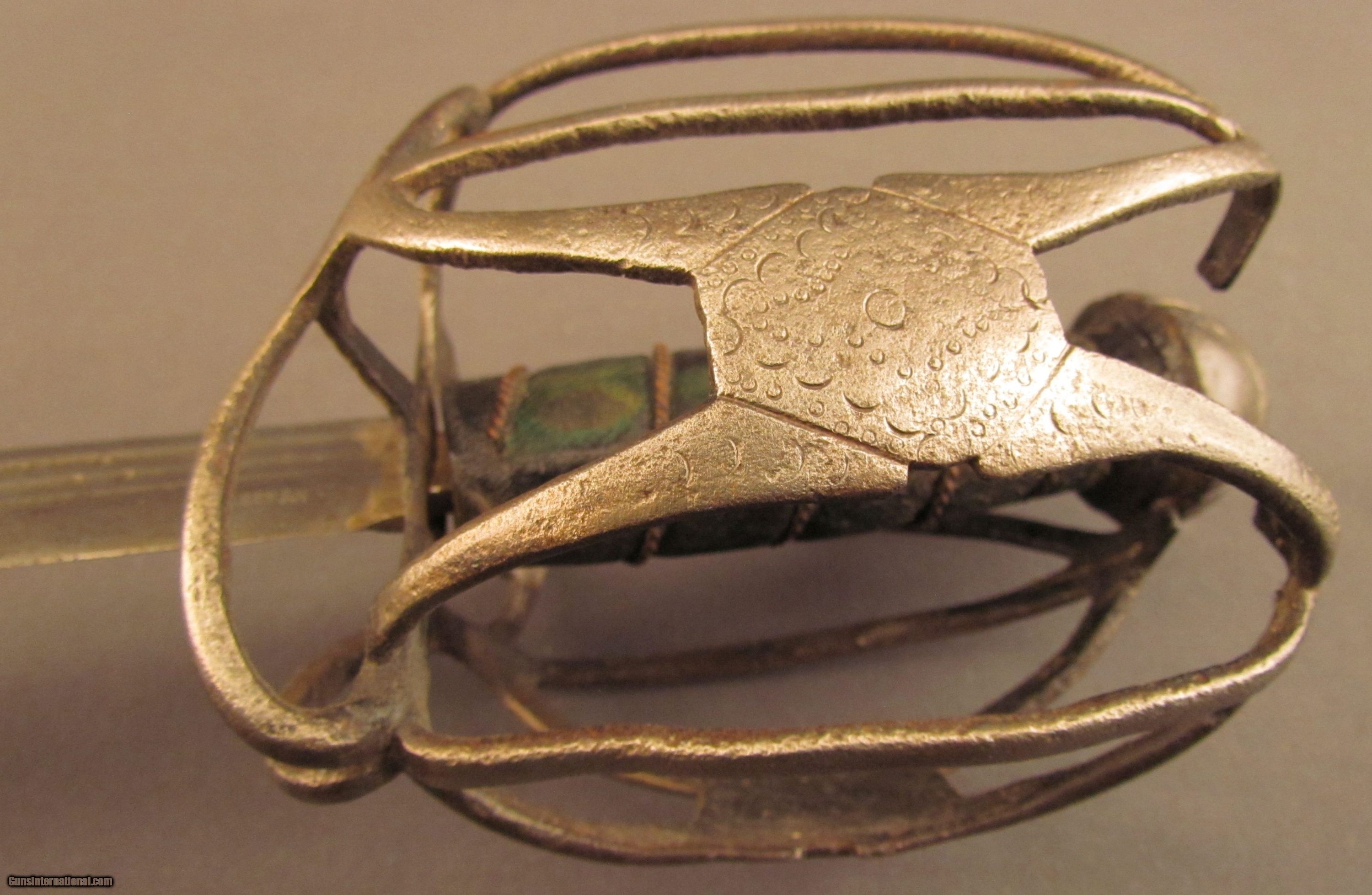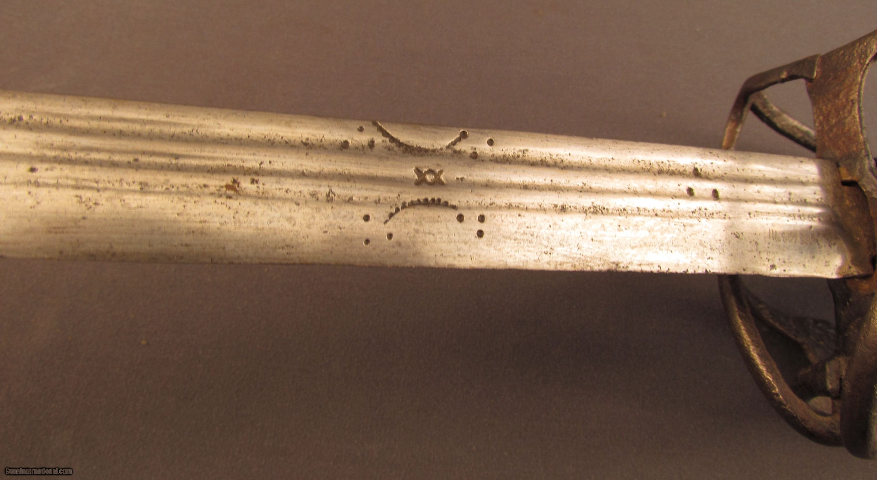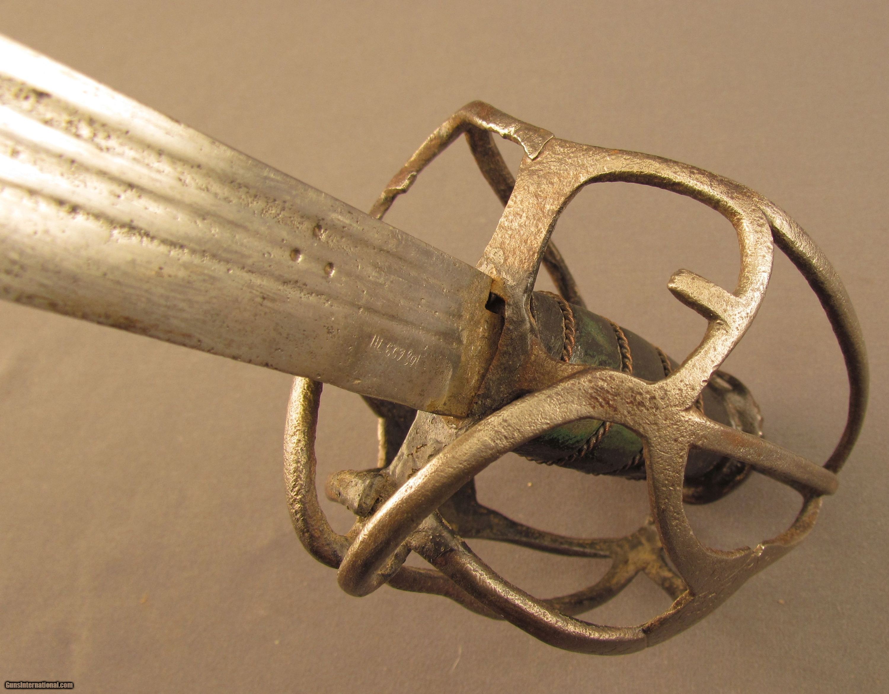 Description: This is a well balanced sword that has a typical early Scottish basket-hilt, more open in design and lightly constructed than later examples. The sword measures 36 3/4" overall with a 31 1/4" straight, double-edged blade having narrow triple fullers. The blade has an overall pewter gray patina that has dark spots of freckling along the entire length, as well as a series of nicks along the edges that run up to the, now rounded, tip. The reverse of the blade has a series of unidentified maker markings running along the forte, possibly German or Italian in origin, and an old collection inventory number is also engraved there in small numerals. The hilt has a loosely attached, full basket guard, but fashioned with thin bars that meet at lightly engraved octagonal panels on either side. There is no quillon, but the guard does have rudimentary finger loops, and the grip has been relined with later, 18th or early 19th century green-black leather with an intact coiled bullion wire wrap. The conical pommel has deeply incised decorations with an exposed tang rivet. An almost identical example of this sword type is illustrated in “Swords & Blades of the American Revolution" by George C. Neumann (plate #233.S). This example is in good-near very good condition and would make a wonderful addition to any collection. {Ref. “Swords & Blades of the American Revolution" by George C. Neumann; 1973} SOLD Manufacturer: Scottish Model: Sword |