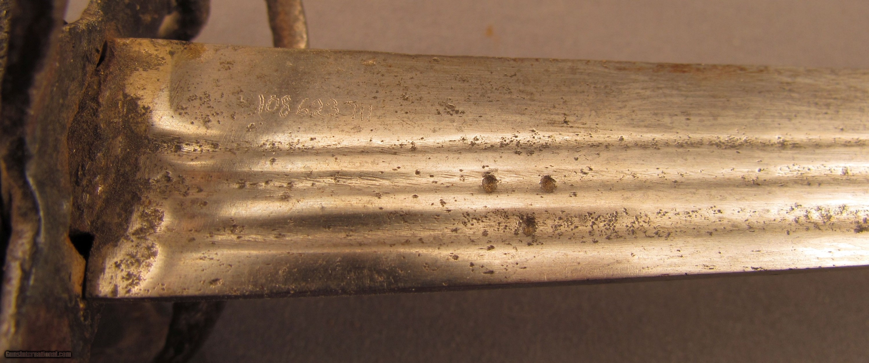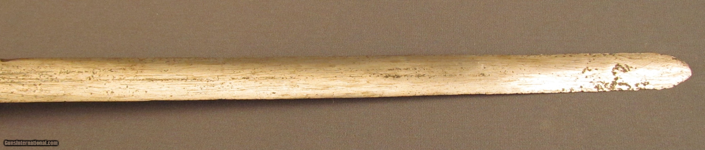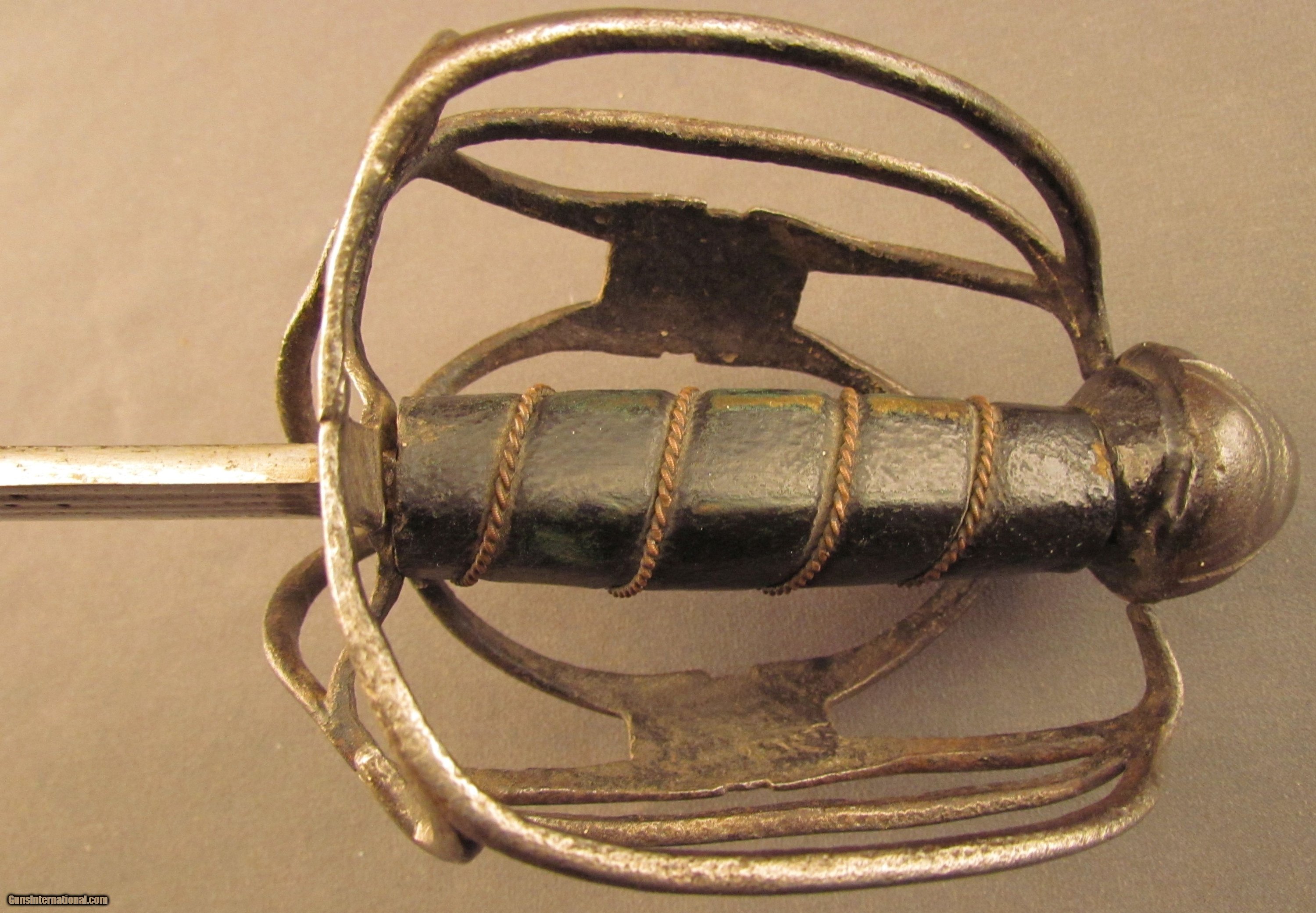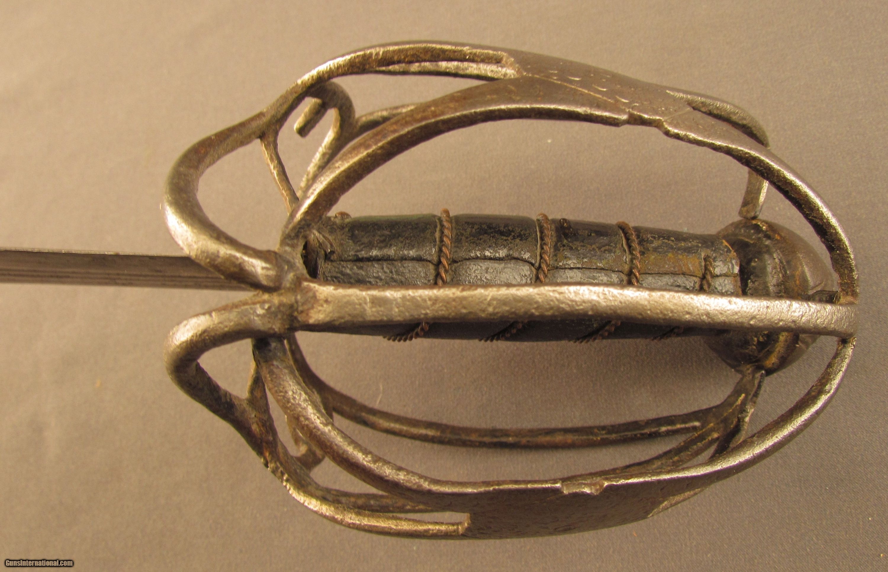 Description: This is a well balanced sword that has a typical early Scottish basket-hilt, more open in design and lightly constructed than later examples. The sword measures 36 3/4" overall with a 31 1/4" straight, double-edged blade having narrow triple fullers. The blade has an overall pewter gray patina that has dark spots of freckling along the entire length, as well as a series of nicks along the edges that run up to the, now rounded, tip. The reverse of the blade has a series of unidentified maker markings running along the forte, possibly German or Italian in origin, and an old collection inventory number is also engraved there in small numerals. The hilt has a loosely attached, full basket guard, but fashioned with thin bars that meet at lightly engraved octagonal panels on either side. There is no quillon, but the guard does have rudimentary finger loops, and the grip has been relined with later, 18th or early 19th century green-black leather with an intact coiled bullion wire wrap. The conical pommel has deeply incised decorations with an exposed tang rivet. An almost identical example of this sword type is illustrated in “Swords & Blades of the American Revolution" by George C. Neumann (plate #233.S). This example is in good-near very good condition and would make a wonderful addition to any collection. {Ref. “Swords & Blades of the American Revolution" by George C. Neumann; 1973} SOLD Manufacturer: Scottish Model: Sword |