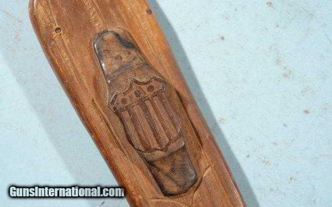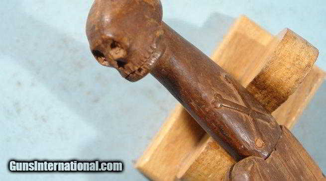 Description: SPANISH-AMERICAN WAR FOLK ART BOLO FROM THE PHILIPPINES CIRCA 1898-99. Bring back native Moro type bolo made for sale or gift to an American. 20” o/a with 14 ½” yataghan blade. Wood hilt with carved “Scull & Cross Bones” pommel and grip. Wood scabbard with wonderful carved American Federal “Stars and Stripes” shield belt loop and floral carving. Excellent condition. SOLD |