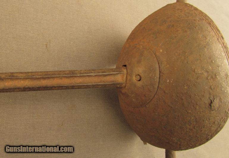 Description: This is a dug relic with a very unusual configuration that measures 23 7/8" overall with a 17 3/8" angular blade having short, triangular fullers on the forte and a long ricasso. The metal has turned to a rough brown patina throughout with spots of surface oxidation as well and there is a slight bend in the blade near the tip, which is missing perhaps the last fraction of an inch or so. The hilt has a heavily reinforced semi-spherical counterguard (with dents and a single area of damage on the obverse side where the metal has been punctured and flaked), very long quillons (originally straight but now with a slight backwards sweep), short three finger grip with a well worn but still discernible wooden grip piece, knucklebow, and disk-shaped pommel. This dagger would've been used in conjunction with a rapier as a parrying weapon in the left hand whilst fighting with the full sword in the right. Generally, left hand daggers had rather simple guards and this is one of the few was dug up in the southeastern United States and appears to be Spanish in origin, certainly the piece does have an Iberian aura around it, and is an interesting and unusual colonial weapon. The main gauche was an integral part of any well-heeled gentleman's accoutrements during the 16th and 17th centuries but its use as a weapon became less and less important as swords became lighter and faster to use until the introduction of smallswords and epees made them irrelevant. This is a great piece and would make a terrific addition to any collection. SOLD Manufacturer: Spanish Model: Sword |