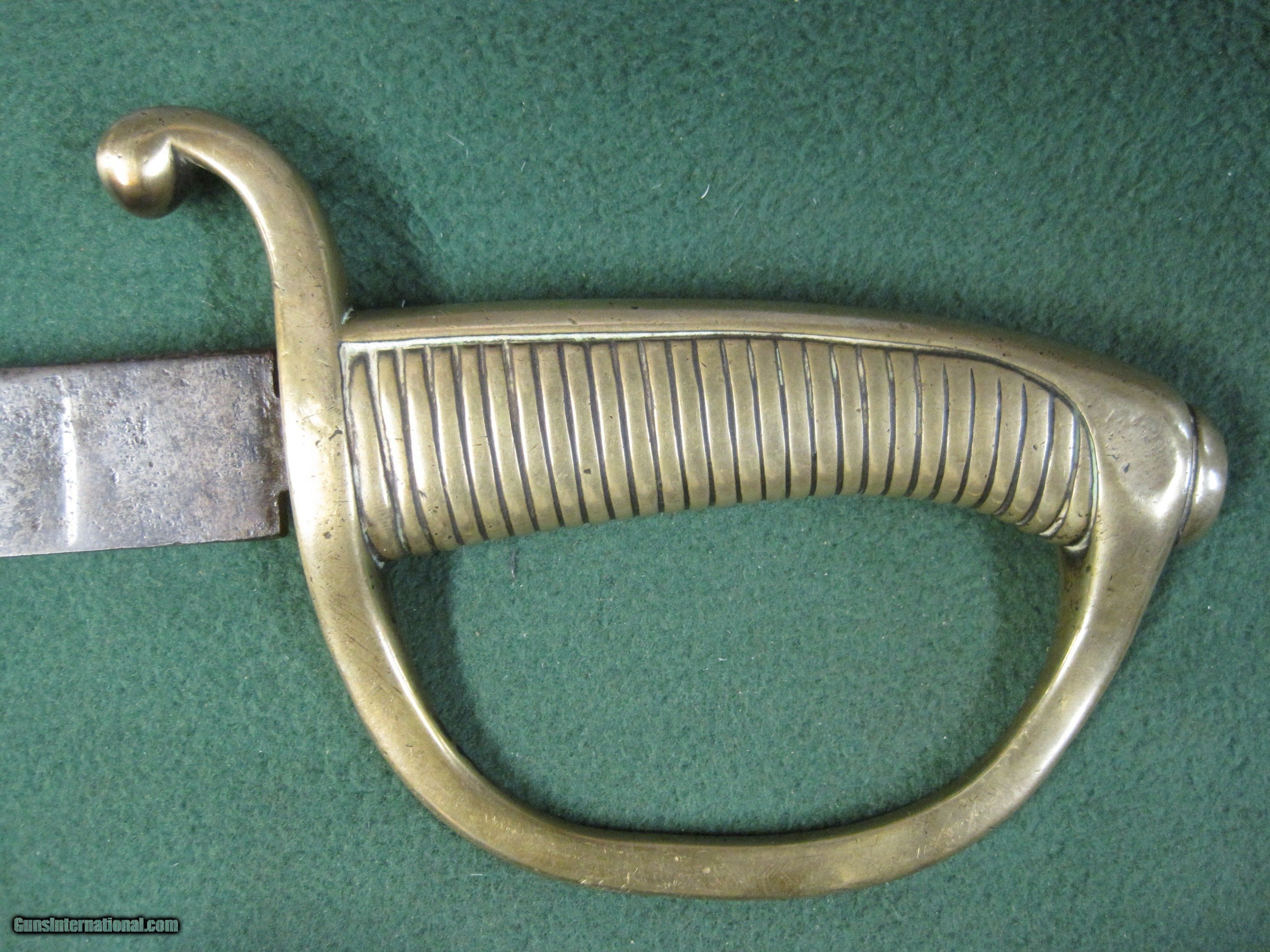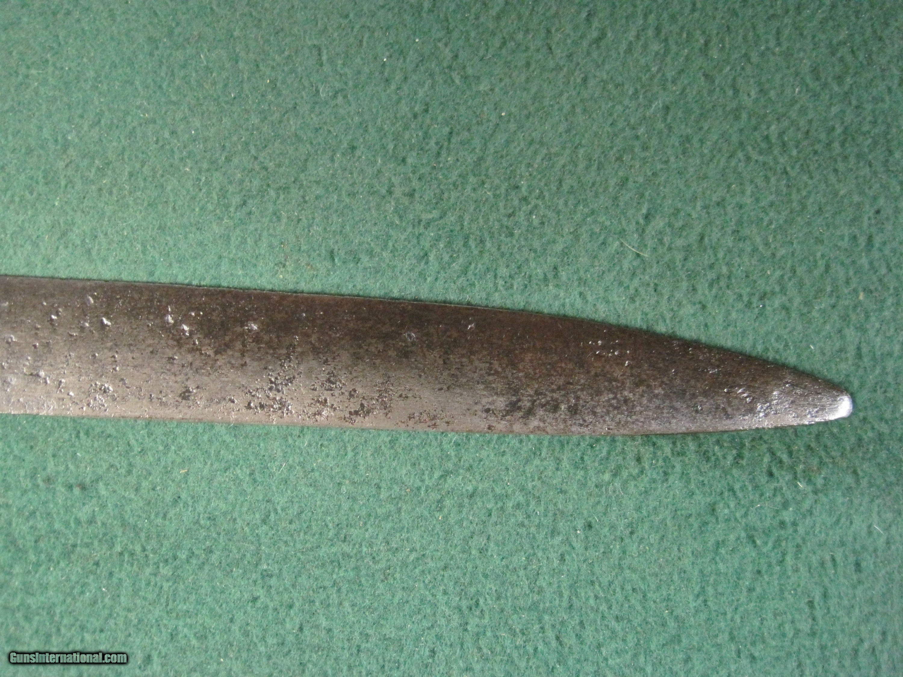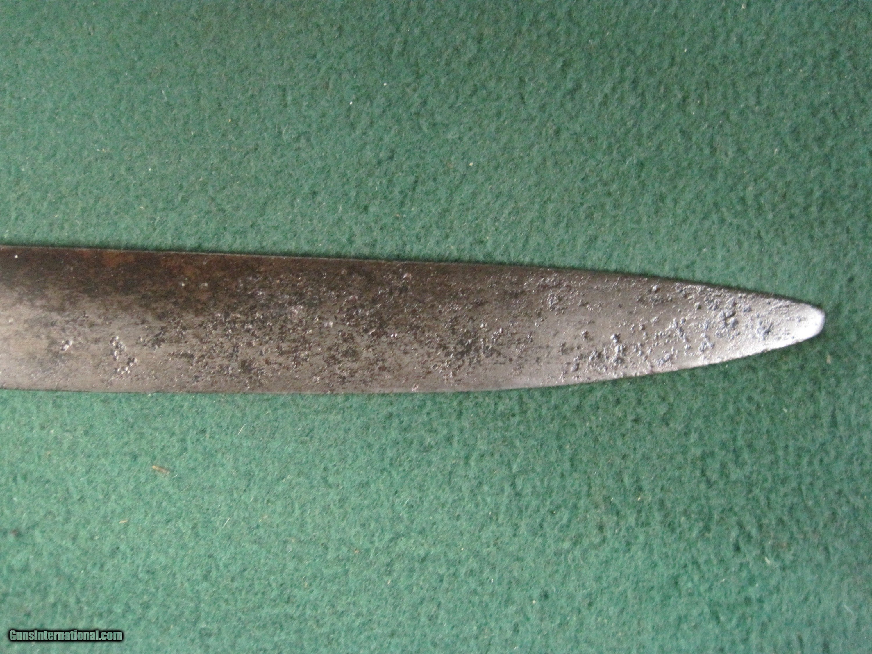 Description: Spanish Dated 1858 Infantry Briquette Short Sword Made in the French infantry hangar pattern of 1770. Cast one piece D guard hilt and grip into which fastened the blade tang. Steel blade 27.25" is plum color with pitting, some small nicks in the edge & a slight bend near the tip.. Etched in the side of the blade is the date 1858 or 1853". overall length 32.5". Tight and sound. Shipping $20 SOLD |