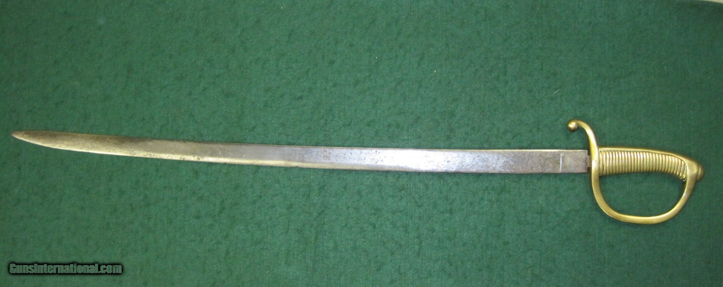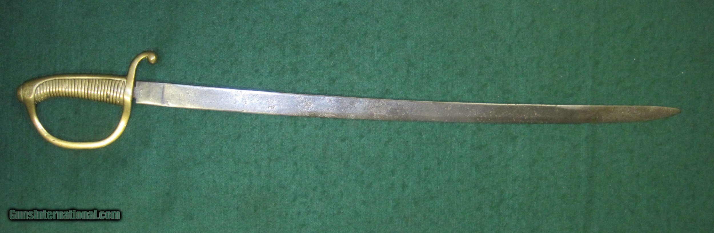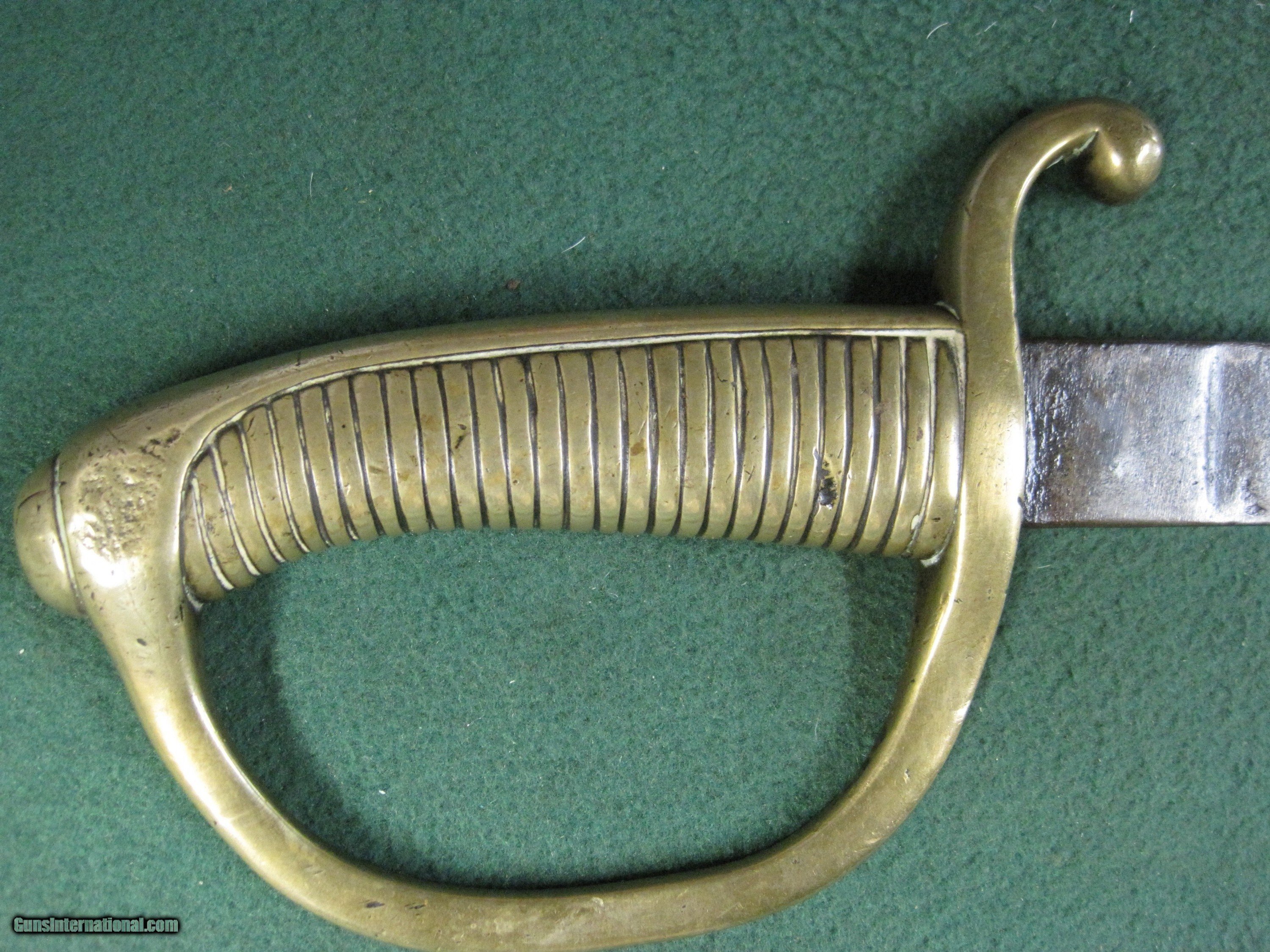 Description: Spanish Dated 1858 Infantry Briquette Short Sword Made in the French infantry hangar pattern of 1770. Cast one piece D guard hilt and grip into which fastened the blade tang. Steel blade 27.25" is plum color with pitting, some small nicks in the edge & a slight bend near the tip.. Etched in the side of the blade is the date 1858 or 1853". overall length 32.5". Tight and sound. Shipping $20 SOLD |