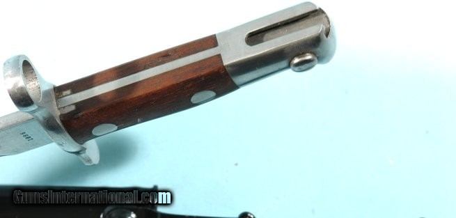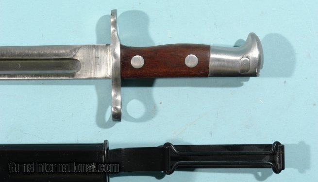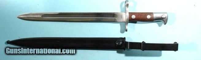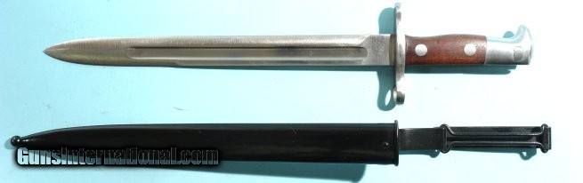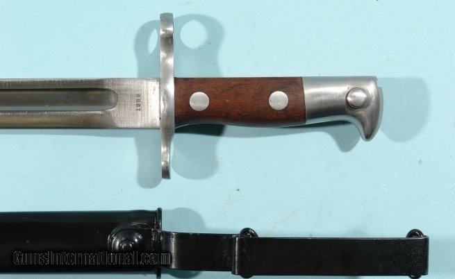 Description: SPRINGFIELD-KRAG MODEL 1892 BAYONET DATED 1896 W/SCABBARD. Very good overall with blade dated 1896 and stamped “US” on the ricasso. Blade and hilt nicely parade polished. Scabbard with black arsenal gloss finish. Nice looking original. Suitable for the Models 1892, 1894, 1896 and 1898. SOLD |