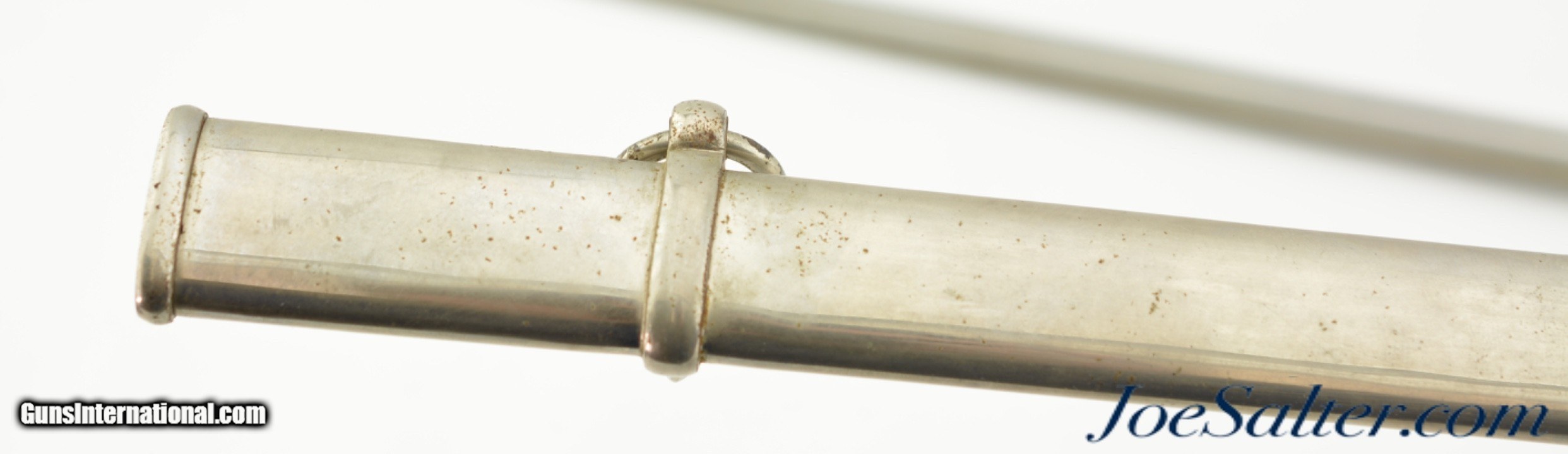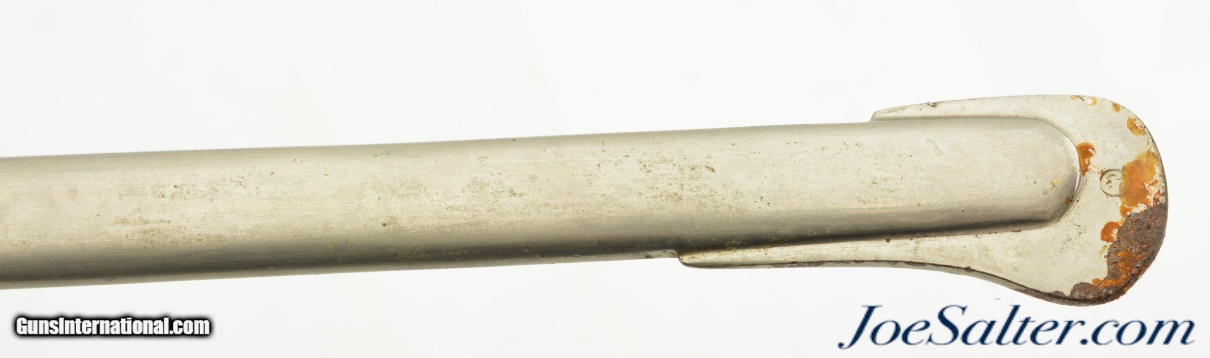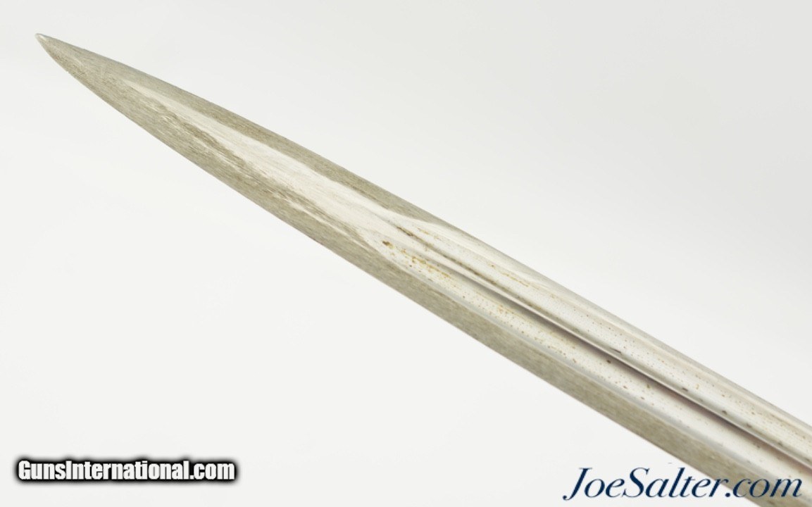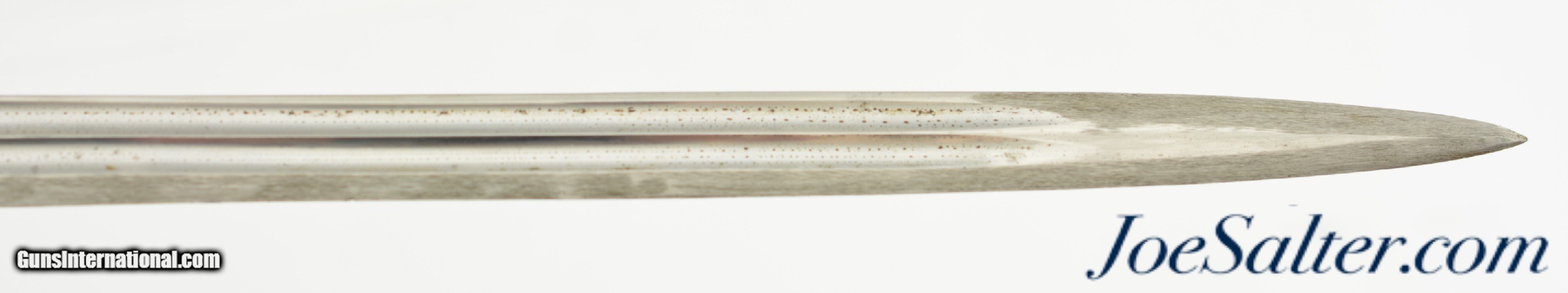 Description: This is a Swiss made sword the measures 39" overall, with a 33 1/4" straight, single-edged-blade having narrow double fullers and sharpened half way to the tip. The steel has and overall dull pewter gray patina with a few scattered spots of plum-brown freckling on both faces of the blade. The long ricasso is marked "FH" for FRIEDRICH HORSTER of Solingen, Prussia, with the retailers name of "Y Diebold Filo Yiurich" on the obverse, with the serial number (1900), and the Roman numeral III, Swiss Cross opposite. The hilt has a pierced steel guard with Swiss Cross and vine motif, a single forward-swept quillon, and dove head pommel with thumbprint backstrap. The shagreen grip is in very good condition and exhibits minor surface wear, while the braided wire wrap is intact. The guard also features a leather finger loop fastened with a regulation nut. The steel scabbard is in very good condition with some scattered areas of mild surface oxidation, and minor scratches along it's length. The sword rate very good-fine condition over-all. Price: $395.00 Contact Seller |