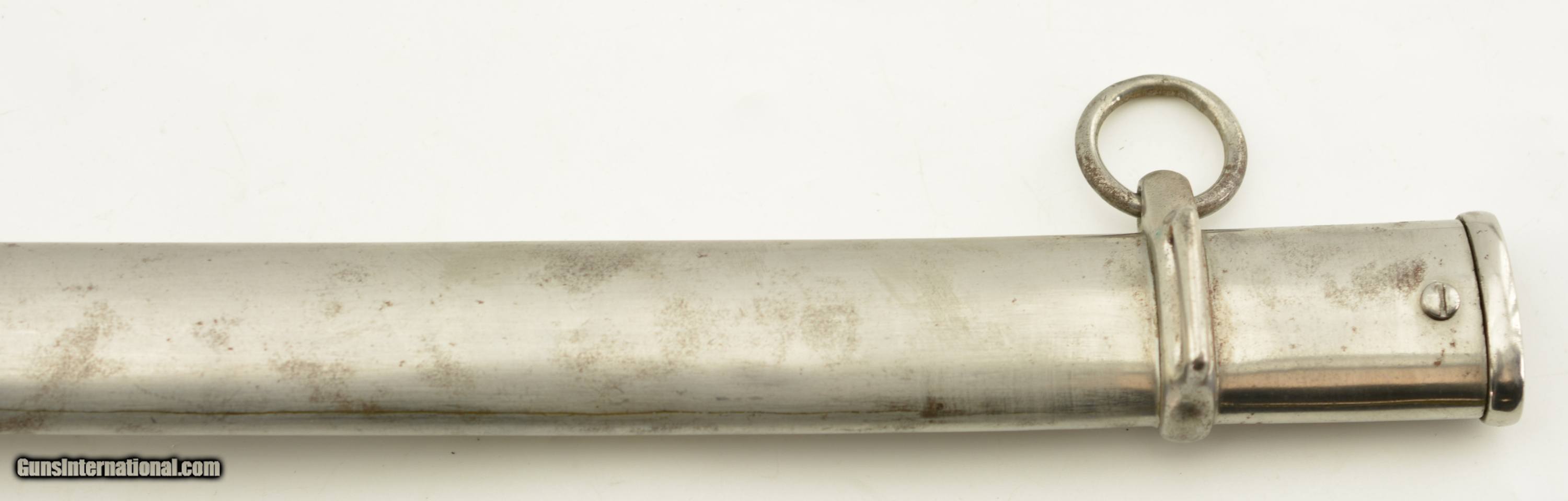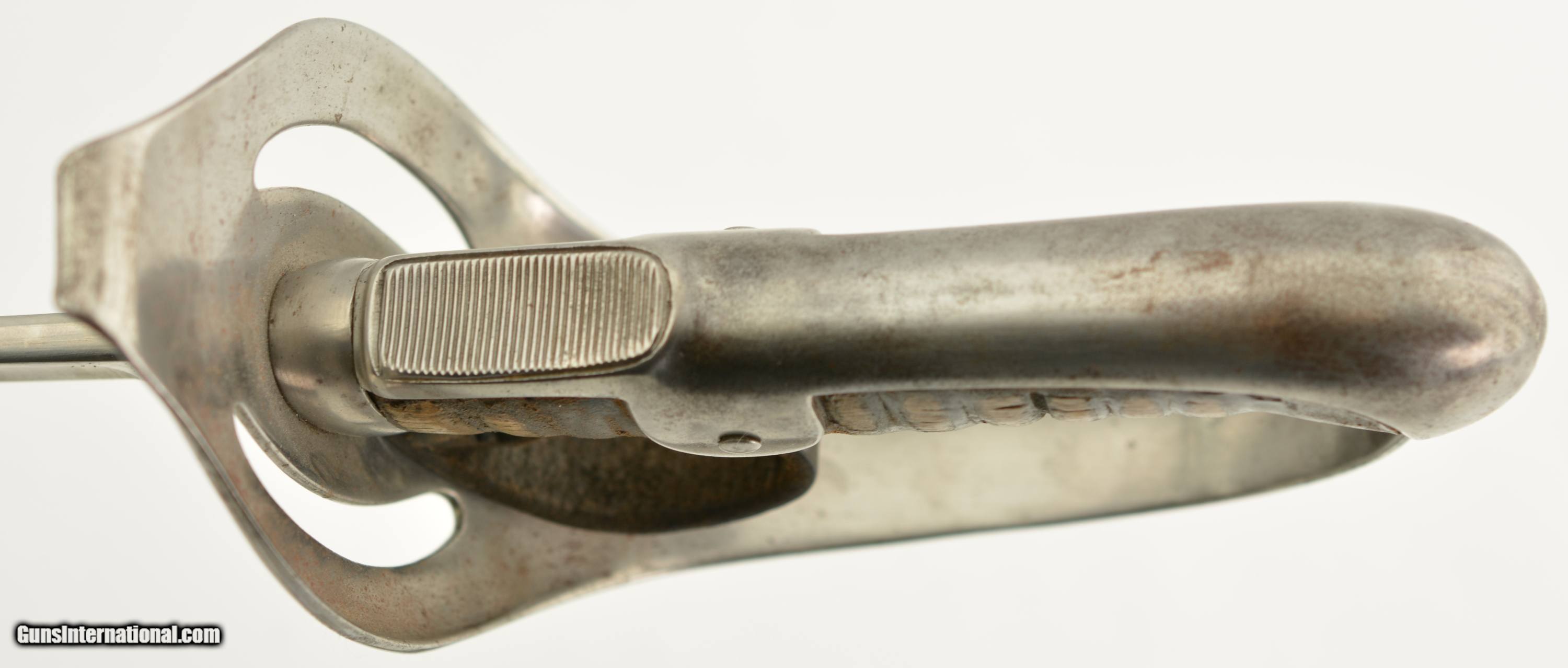 Description: This is a handsome sword that measures 38" overall, with a 31 3/4" curved, single-edged blade having single fullers. The steel has an overall bright pewter gray patina with a few small spots of plum-brown freckling starting to appear, and a few nicks along the edge of the foible. The ricasso is marked "E&F HÖRSTER / SOLINGEN" on the obverse, with the serial number (3676) and date (1901) opposite. The hilt has a pierced steel guard with single forward-swept quillon, leather finger loop, and dove head pommel with thumbprint backstrap. The wooden grip retains traces of the original leather here and there, but the wire wrap is no longer present. The steel scabbard is in good shape, with some scattered specks of dark freckling, and some dents along the body. The sword rates good-very good condition overall. SOLD Manufacturer: Swiss Model: Saber |
