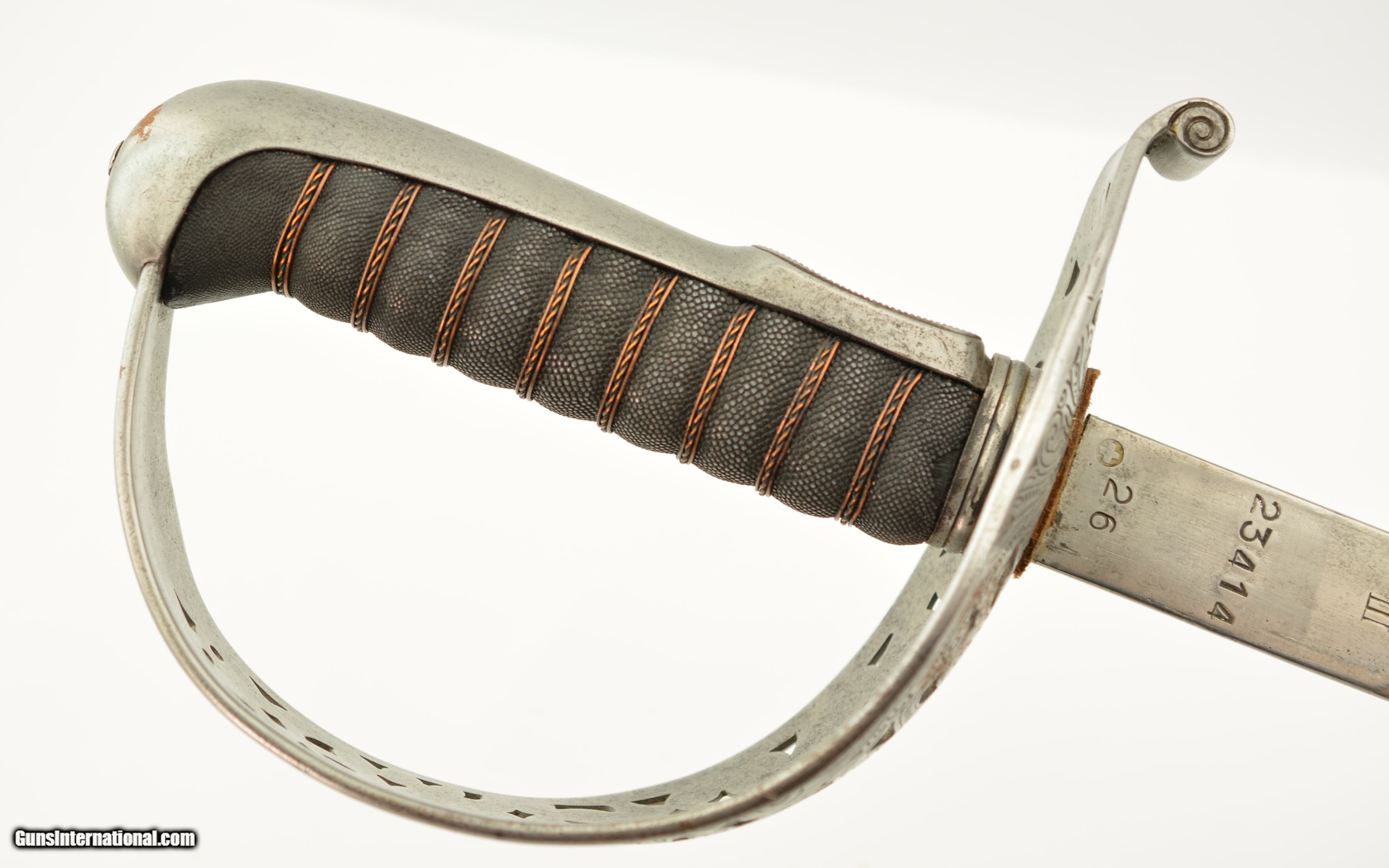 Description: This is a handsome sword that measures 39 7/8" overall, with a 34" straight, single-edged blade having narrow double fullers. The steel has an overall dull pewter gray patina with spots of plum-brown freckling starting to appear, and a small amount of reshaping at the very tip. The long ricasso is marked "WAFFENFABRICK / NEUHAUSEN" on the obverse, with the serial number (23414) and Roman numeral III opposite. The hilt has a pierced steel guard with Swiss Cross and vine motif, a single forward-swept quillon, and dove head pommel with thumbprint backstrap. The shagreen grip is in very good shape and exhibits minor surface wear, while the braided wire wrap is intact. The steel scabbard is also in fine shape, with some scattered specks of dark freckling, and a few minor dents near the drag. The sword rates fine condition overall. SOLD Manufacturer: Swiss Model: Sword |