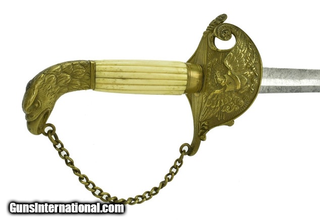 U.S. Eagles Head Officers Sword. Circa 1840s. Blade is 27” with foliate motif. Ricasso is marked W.H.H. & J. on one side and Philadelphia on other. Eagles head pommel. Ivory grip. Single chain knuckle guard from Eagle head to quillion. Counter guard has a federal Eagle. Scabbard is very good with a few minor dents, and is stamped Horstmann.