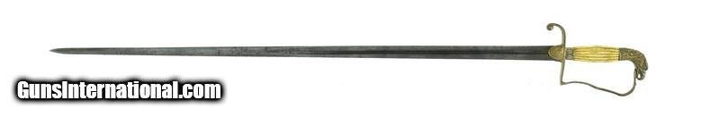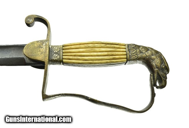 Description: U.S. Eagles Head Officers Sword. Circa 1810’s-1830’s. Blade is approximately 28” and overall length is approximately 34”. Blade has modest foliate patterns and panoply of arms. Langet has a federal eagle. Grip is ivory, no chips or cracks. Good overall condition. An early piece of American history. SOLD |
