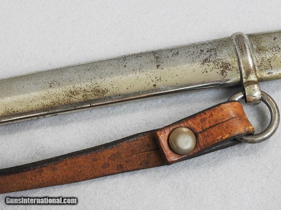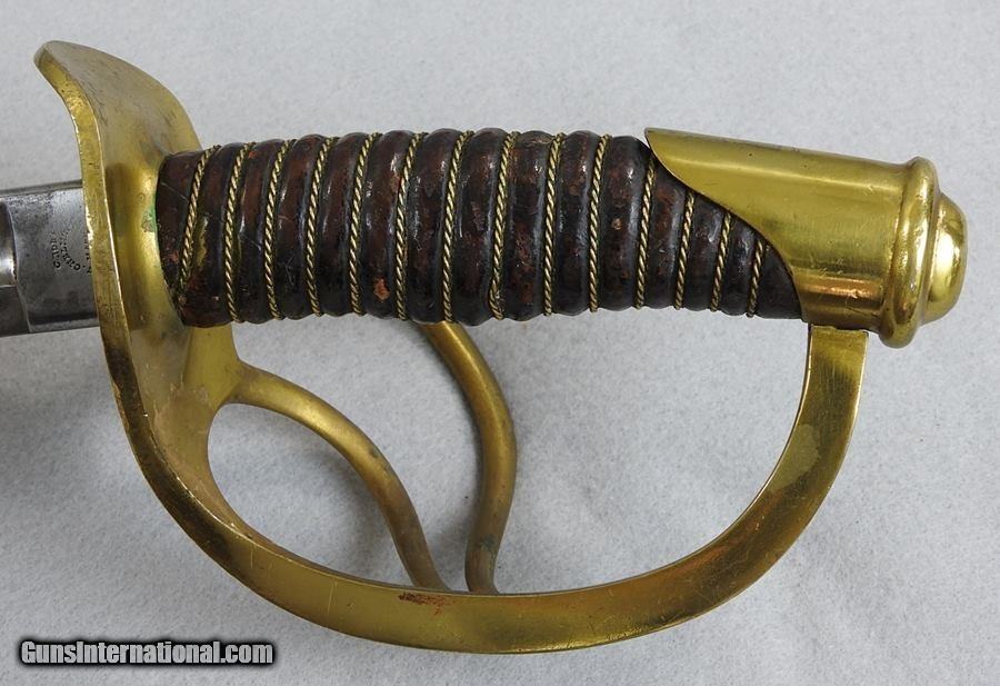 Description: This is a very nice Civil War U.S. Model 1860 Calvary Saber by C Roby and is dated 1864 with crisp markings. The wire and leather grip are very good condition and blade is very fine. There are no dents or damage to the scabbard. The very good condition blade is 35” long and is 41” overall in length. The leather grip is very good condition. One of the leather hangers appears to be original and the other strap looks to be replaced. Both of the brass hooks are original. I would consider trades for pre 1899 ANTIQUE PISTOLS and rifles on any of my items.. WHAT DO YOU HAVE TO TRADE? Ask about our 30-90 day lay-away program. We accept Bank Check, Money order, Personal checks or wire transfer. SOLD |