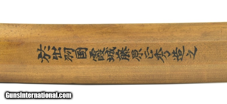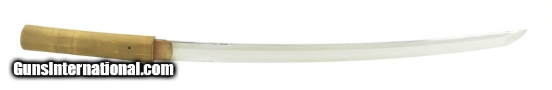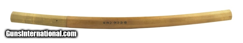 Ubu Wakizashi This is an ubu wakizashi in polish, that is inscribed: Oite Dewa Kuni – Fujiwara Masa Hide Tsukuru Kore. The reverse is inscribed: An-Ei Ruko Nen Hachi Gatsu Jitsu. This translates to Masa Hide forged this blade in Dewa province in August of 1776. The hada is a wide, shallow notare (wave) with a very long turn back. It comes in shirasaya with Saya Gaki and copper habaki.