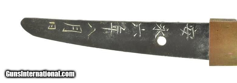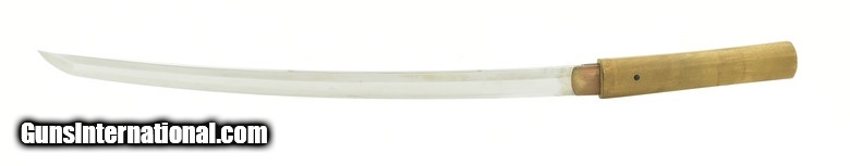 Description: Ubu Wakizashi This is an ubu wakizashi in polish, that is inscribed: Oite Dewa Kuni – Fujiwara Masa Hide Tsukuru Kore. The reverse is inscribed: An-Ei Ruko Nen Hachi Gatsu Jitsu. This translates to Masa Hide forged this blade in Dewa province in August of 1776. The hada is a wide, shallow notare (wave) with a very long turn back. It comes in shirasaya with Saya Gaki and copper habaki. SOLD |