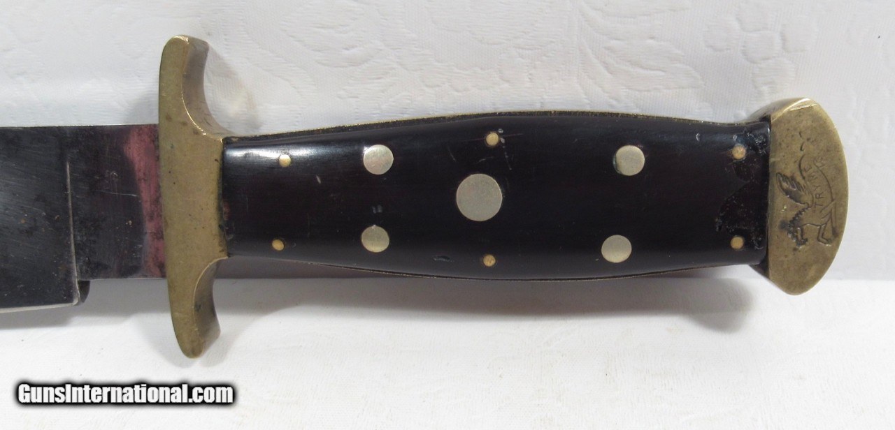 Description: Unmarked Bowie Knife with 8” Clip-Point Blade; The Legends “Try Me” and “Of The Best Quality” are Present; Brass Guard and Pommel with Brass Straps on Sides of Hilt; L.O.A. is 13 ½”; Original Sheffield Style Paper Sheath; Possibly made by E. Barnes, J. Lingard, S.C. Wragg or Corsan, Denton & Burdekin; Circa 1845 – 1855; See All Photos for Condition; No Texts. Call or Email Only; PERSONAL PROPERTY of Harold Wieser; Price: $3,475 + $45 S&H Via FedEx Express; Price includes insured shipping; return policy: three days inspection from the date the item is received; full refund of shipping both ways ONLY IF THE ITEM IS MISREPRESENTED. SOLD |