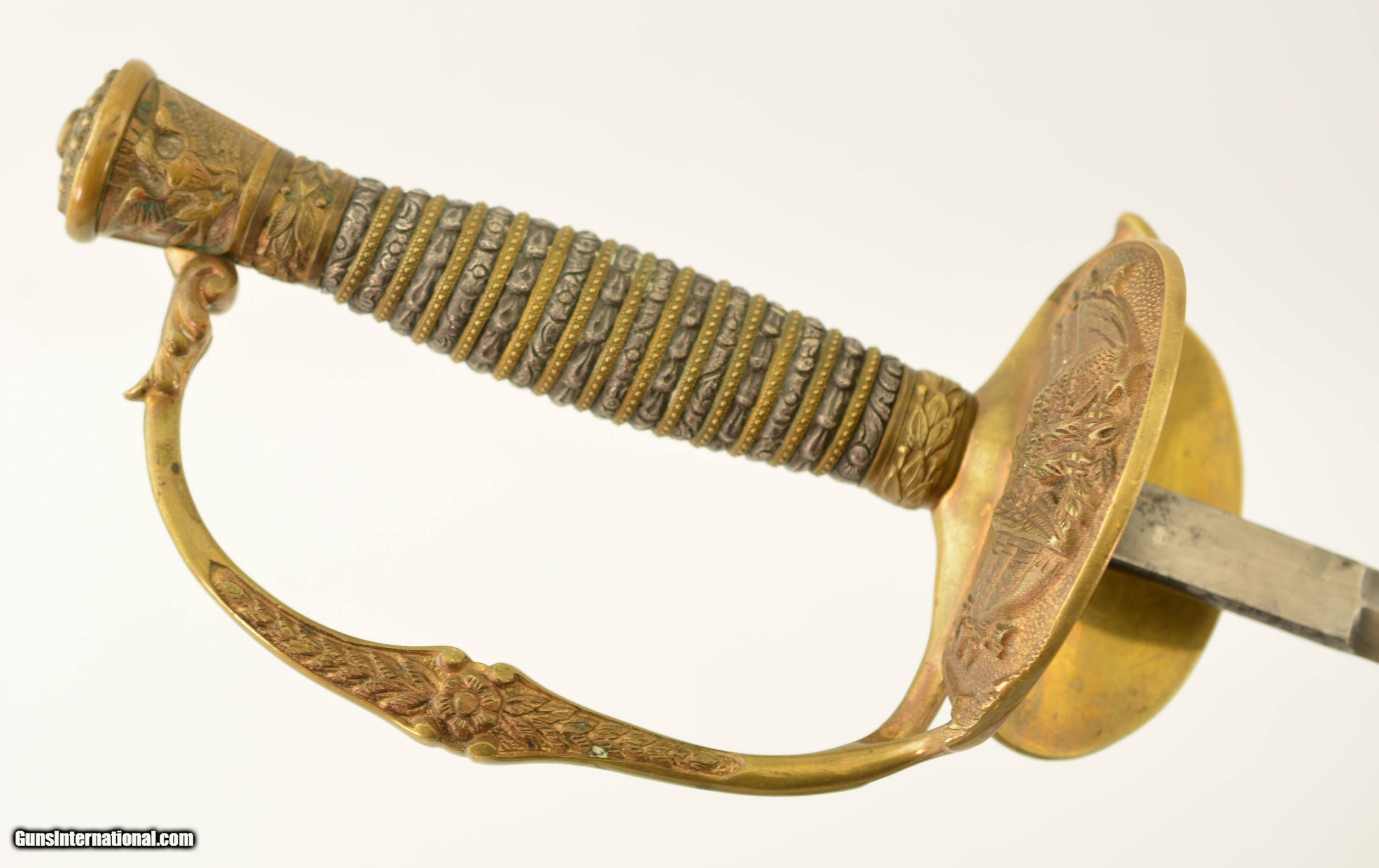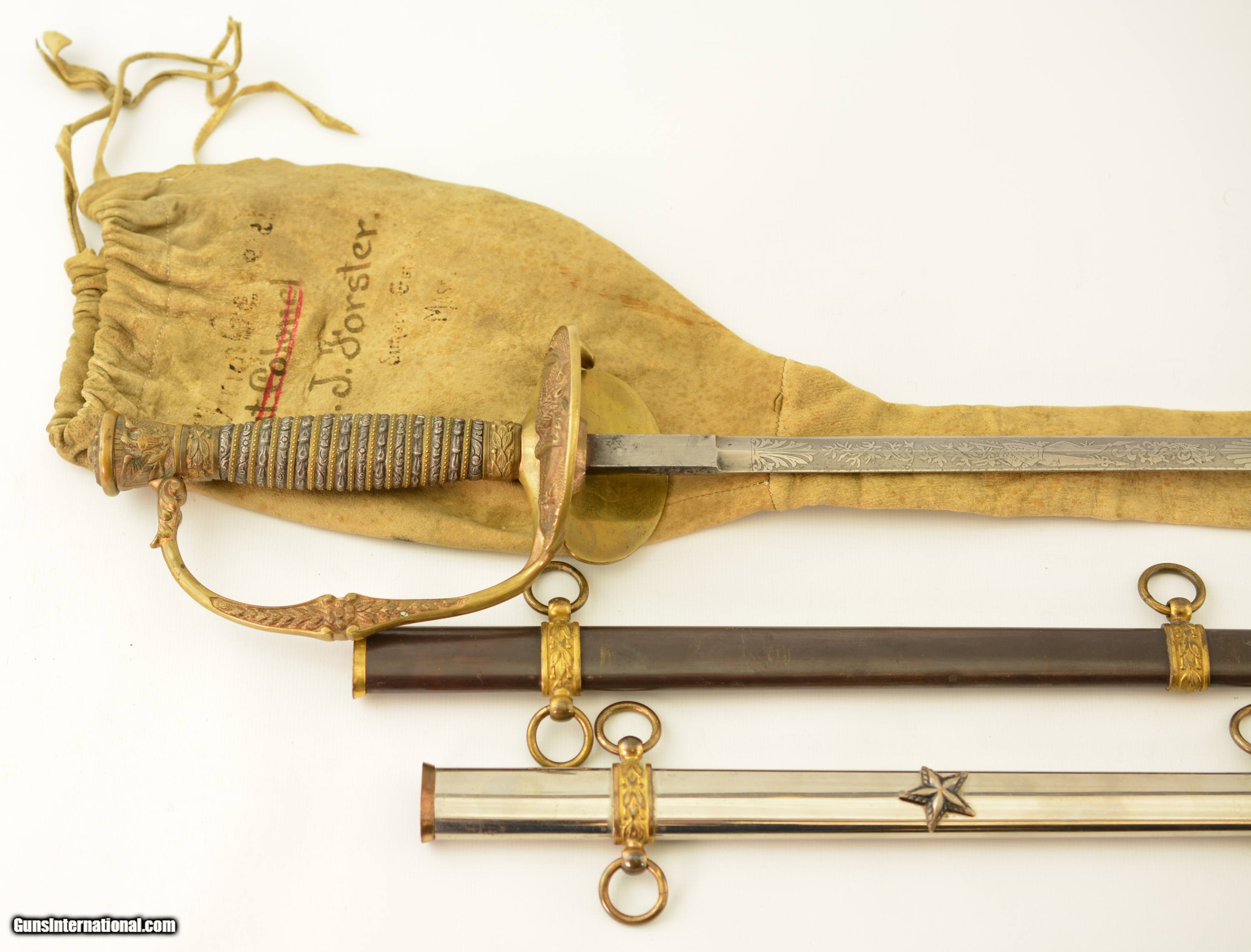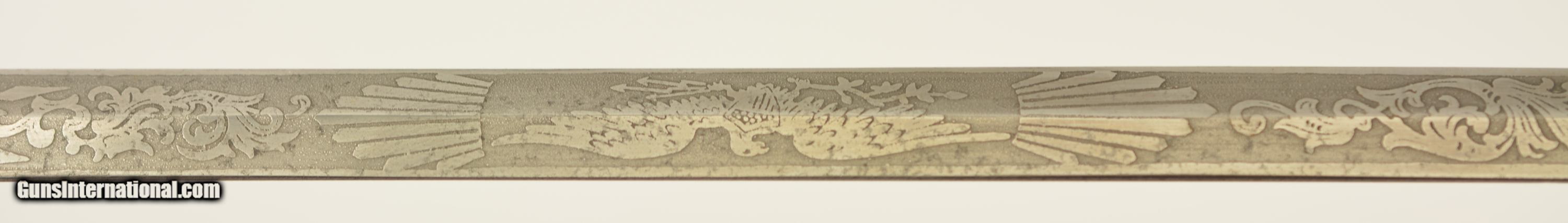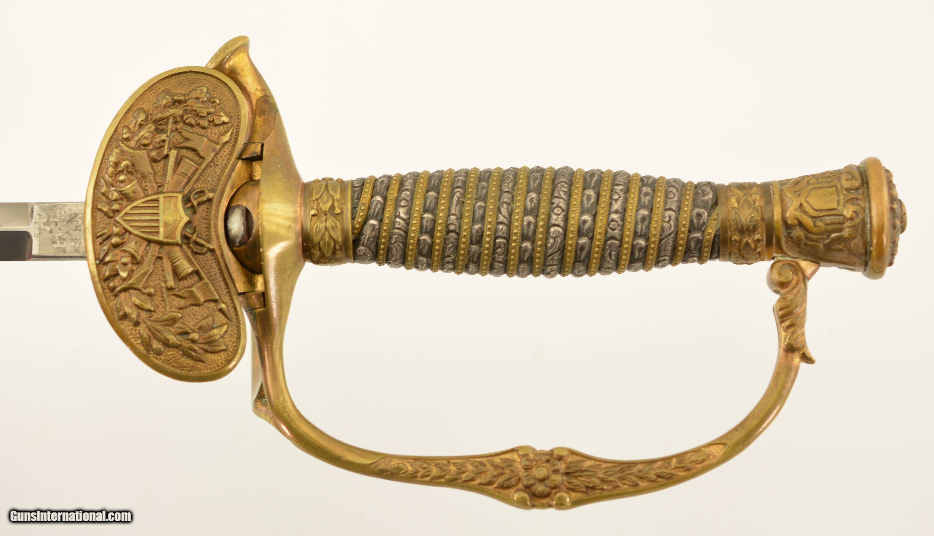 Description: This is a high grade, 1860 Staff & Field type sword that was made to conform to the 1872 regulations for the Springfield General Officer Sword, albeit with a different grip. The sword measures 36 1/2' overall, with a 30' diamond-shaped blade marked 'G.M. Simmons & Co. / Boston Mass.' on the ricasso obverse. The blade is still bright, and has etched panels depicting foliate scroll and panoplies of arms, centered by a Federal Eagle on the reverse and "U.S." on the obverse. Some barely visible scabbard marks can be seen on the faces of the foible and specks of gray patina are present near the tip and over the maker's mark, otherwise the blade has few blemishes. The hilt is cast brass in gilt relief with a folding counterguard (the detent does not function, but the guard stays put in either position), and a silver grip with gilt band wrap. The sword is accompanied by two scabbards (this also conforms to the 1872 General Officers Sword regulation): the first is the dress nickel-plated scabbard with a single Brigadier General's silvered chased bronze star; while the second is service-browned for field use. Both have standard 1860 S&F gilt brass mounts, which differ from the mounts used n Springfield Armory-made examples. Also included is one buff kidskin cover marked 'Brig. General / Lieut. Colonel (struck through) / E.J. Forster. / Surgeon General / Mass' on the front face. The cover is in good condition overall, but the last few inches of the tip have been lost and the surface shows light age yellowing, a few small perforations and occasional stains. The lettering is a bit faded but remains legible. Contact wear at the side is perfectly consistent with this sword. Edward Jacob Forster 'enlisted in the 26th Unattached Infantry Company, Mass. Volunteer Militia in Sep 1864; discharged in Oct 1866. He did not serve on active duty during the Civil War. He received his MD from Harvard in 1868 and was commissioned as surgeon with the rank of major, 5th Infantry in 1871. Discharged in 1892. Commissioned as Lieutenant Colonel in 1894 and assigned as medical director, 1st Brigade, appointed Surgeon General with rank of brigadier general by Gov. Frederic T. Greenhalge on 23 Apr 1895. Died in office 15 May 1896.' Presented with this lot is a dossier of research pertaining to the General, including the above statement, excerpts from period publications such as Adjutant General's annual reports, and obituaries for Dr. Forster, an excerpt from A History of the Massachusetts Medical Society 1781-1922 by Walter L. Burrage, A.M., M.D., and a 25-page printout of The Pedigree and Descendants of Jacob Forster, Sen. of Charlestown, Mass. by Dr. Edward J. Forster himself. This excellent, identified Massachusetts General's sword is in fine-near excellent condition, and would make a wonderful addition to any collection. SOLD Manufacturer: US Military Model: Sword |