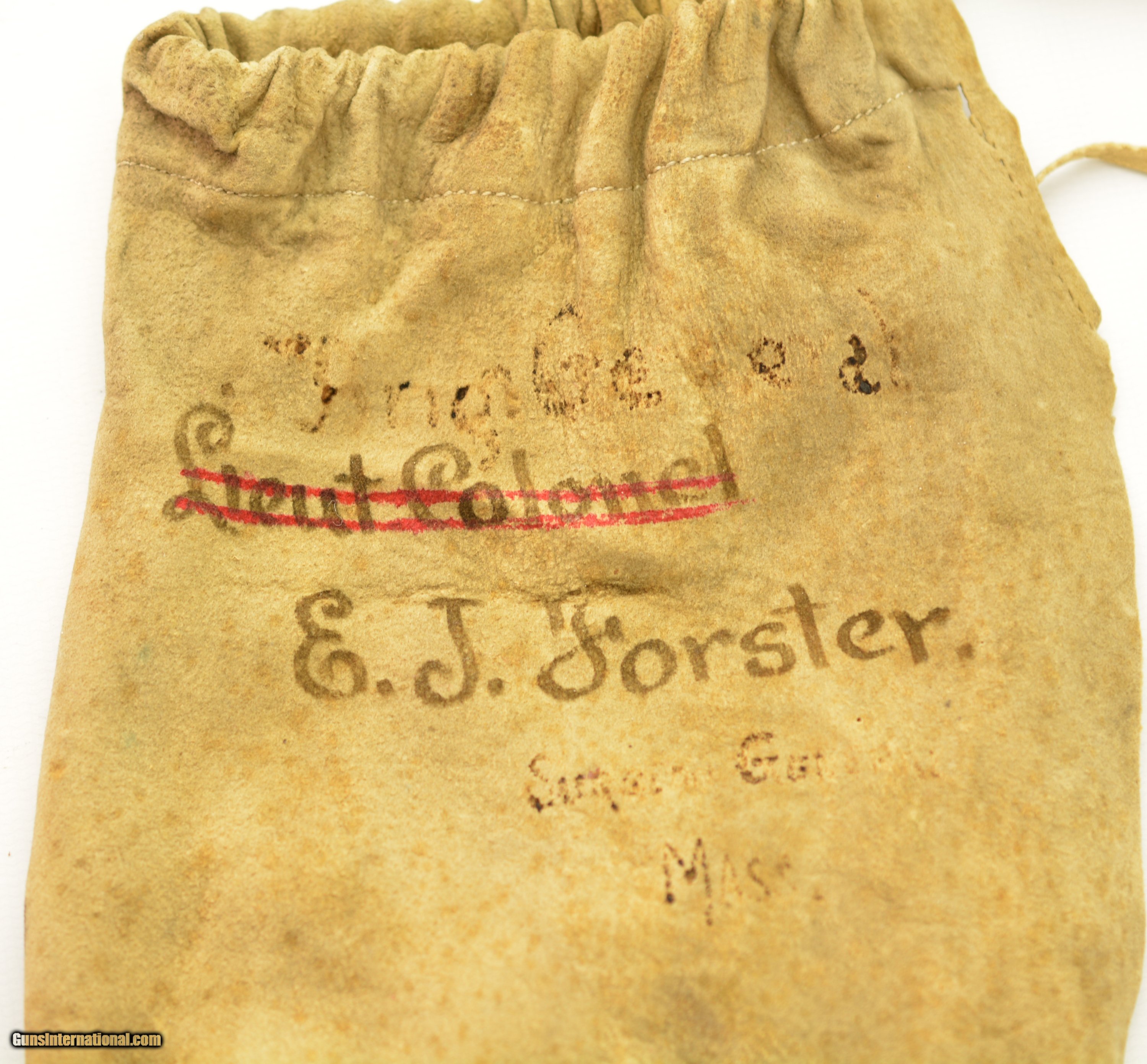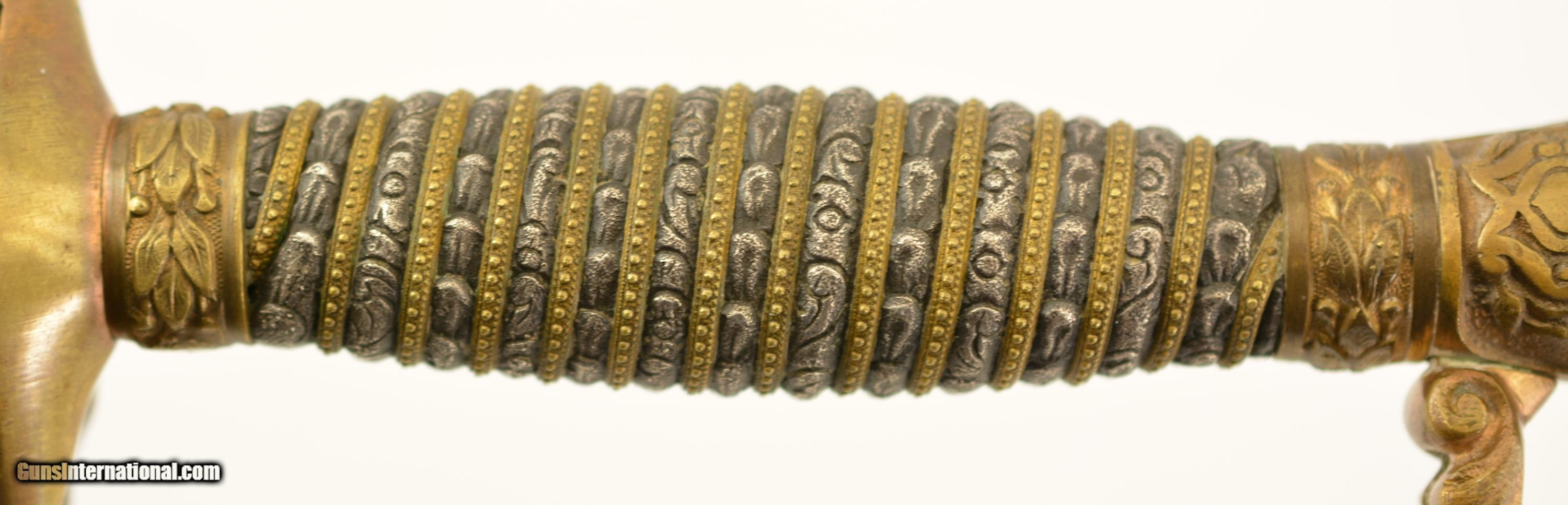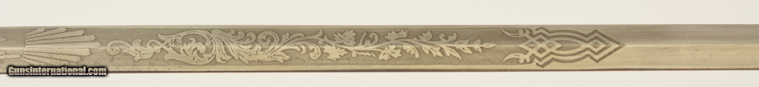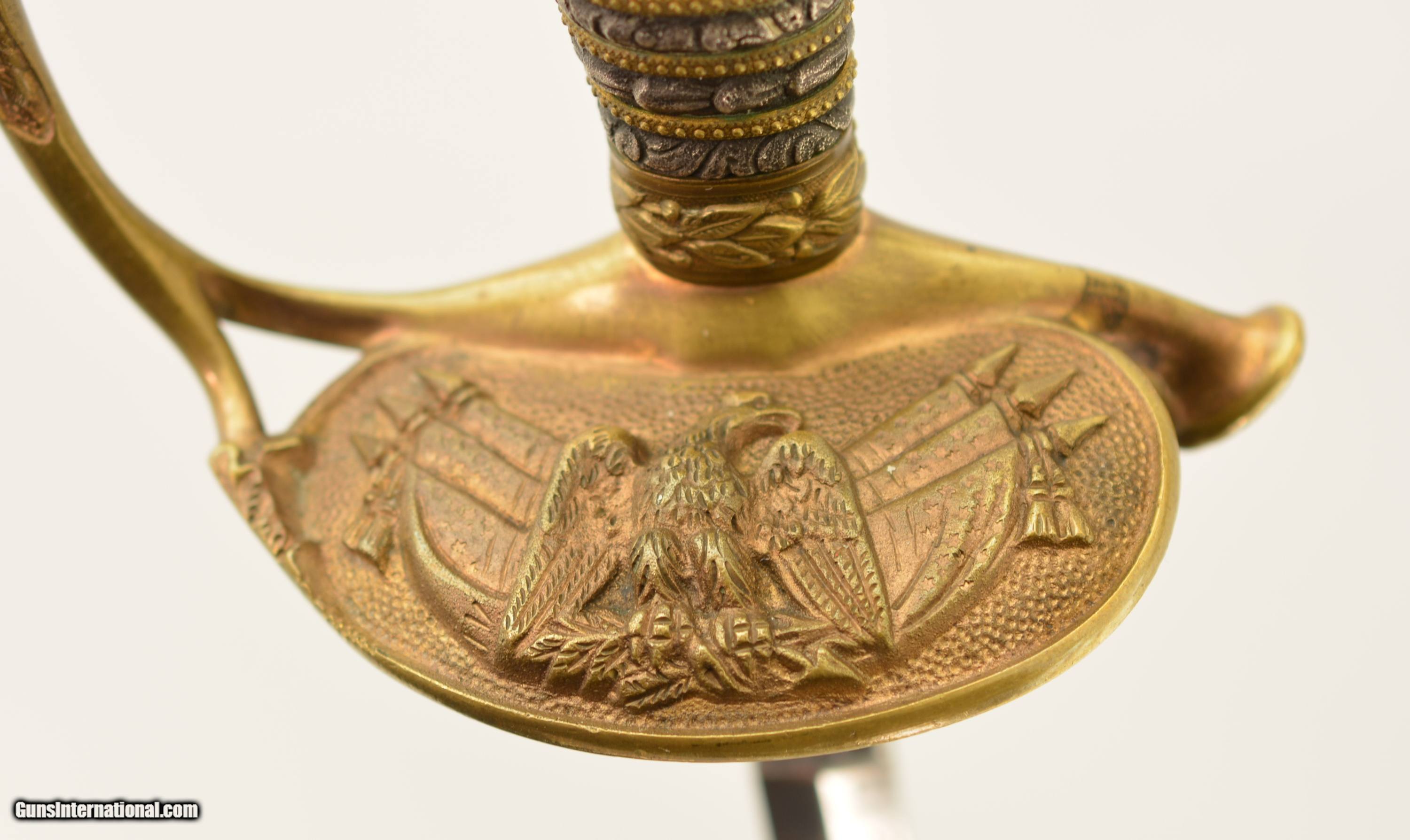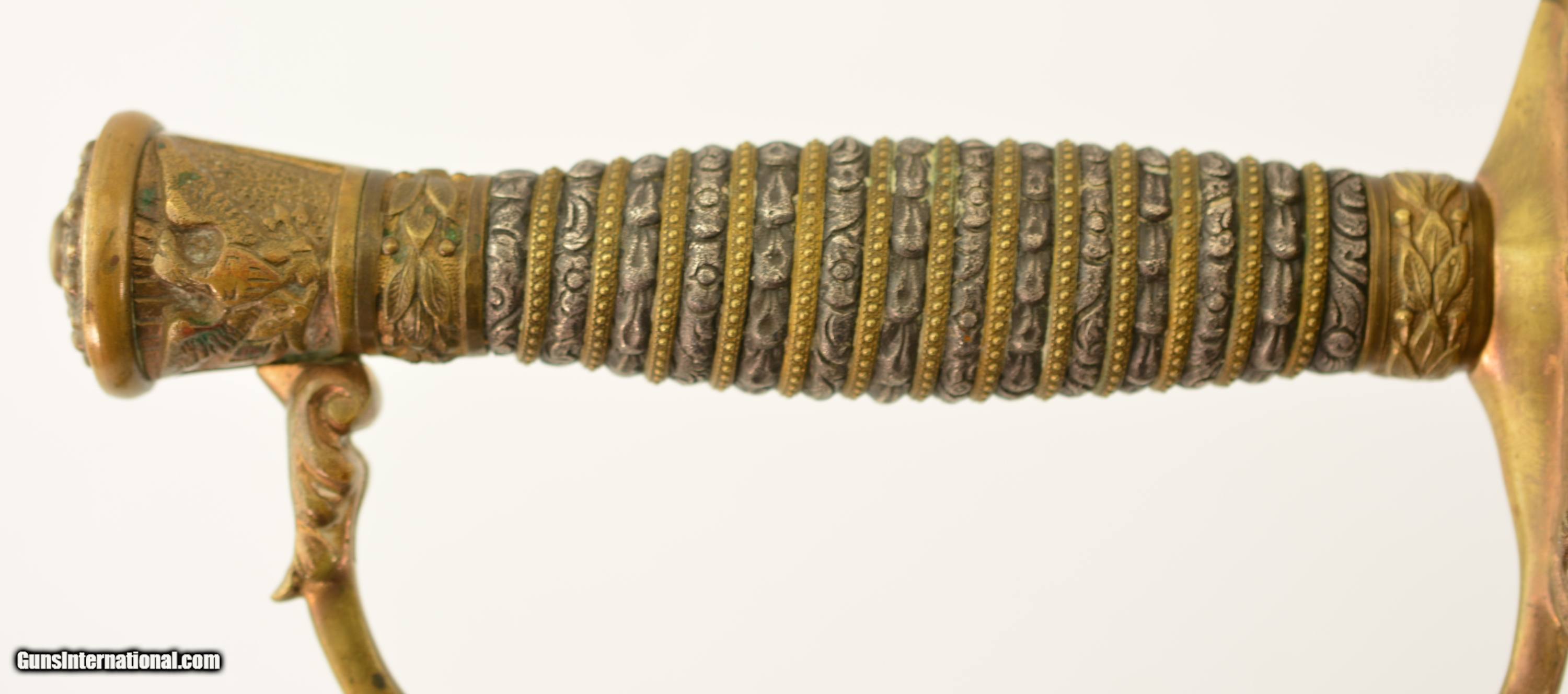 Description: This is a high grade, 1860 Staff & Field type sword that was made to conform to the 1872 regulations for the Springfield General Officer Sword, albeit with a different grip. The sword measures 36 1/2' overall, with a 30' diamond-shaped blade marked 'G.M. Simmons & Co. / Boston Mass.' on the ricasso obverse. The blade is still bright, and has etched panels depicting foliate scroll and panoplies of arms, centered by a Federal Eagle on the reverse and "U.S." on the obverse. Some barely visible scabbard marks can be seen on the faces of the foible and specks of gray patina are present near the tip and over the maker's mark, otherwise the blade has few blemishes. The hilt is cast brass in gilt relief with a folding counterguard (the detent does not function, but the guard stays put in either position), and a silver grip with gilt band wrap. The sword is accompanied by two scabbards (this also conforms to the 1872 General Officers Sword regulation): the first is the dress nickel-plated scabbard with a single Brigadier General's silvered chased bronze star; while the second is service-browned for field use. Both have standard 1860 S&F gilt brass mounts, which differ from the mounts used n Springfield Armory-made examples. Also included is one buff kidskin cover marked 'Brig. General / Lieut. Colonel (struck through) / E.J. Forster. / Surgeon General / Mass' on the front face. The cover is in good condition overall, but the last few inches of the tip have been lost and the surface shows light age yellowing, a few small perforations and occasional stains. The lettering is a bit faded but remains legible. Contact wear at the side is perfectly consistent with this sword. Edward Jacob Forster 'enlisted in the 26th Unattached Infantry Company, Mass. Volunteer Militia in Sep 1864; discharged in Oct 1866. He did not serve on active duty during the Civil War. He received his MD from Harvard in 1868 and was commissioned as surgeon with the rank of major, 5th Infantry in 1871. Discharged in 1892. Commissioned as Lieutenant Colonel in 1894 and assigned as medical director, 1st Brigade, appointed Surgeon General with rank of brigadier general by Gov. Frederic T. Greenhalge on 23 Apr 1895. Died in office 15 May 1896.' Presented with this lot is a dossier of research pertaining to the General, including the above statement, excerpts from period publications such as Adjutant General's annual reports, and obituaries for Dr. Forster, an excerpt from A History of the Massachusetts Medical Society 1781-1922 by Walter L. Burrage, A.M., M.D., and a 25-page printout of The Pedigree and Descendants of Jacob Forster, Sen. of Charlestown, Mass. by Dr. Edward J. Forster himself. This excellent, identified Massachusetts General's sword is in fine-near excellent condition, and would make a wonderful addition to any collection. SOLD Manufacturer: US Military Model: Sword |