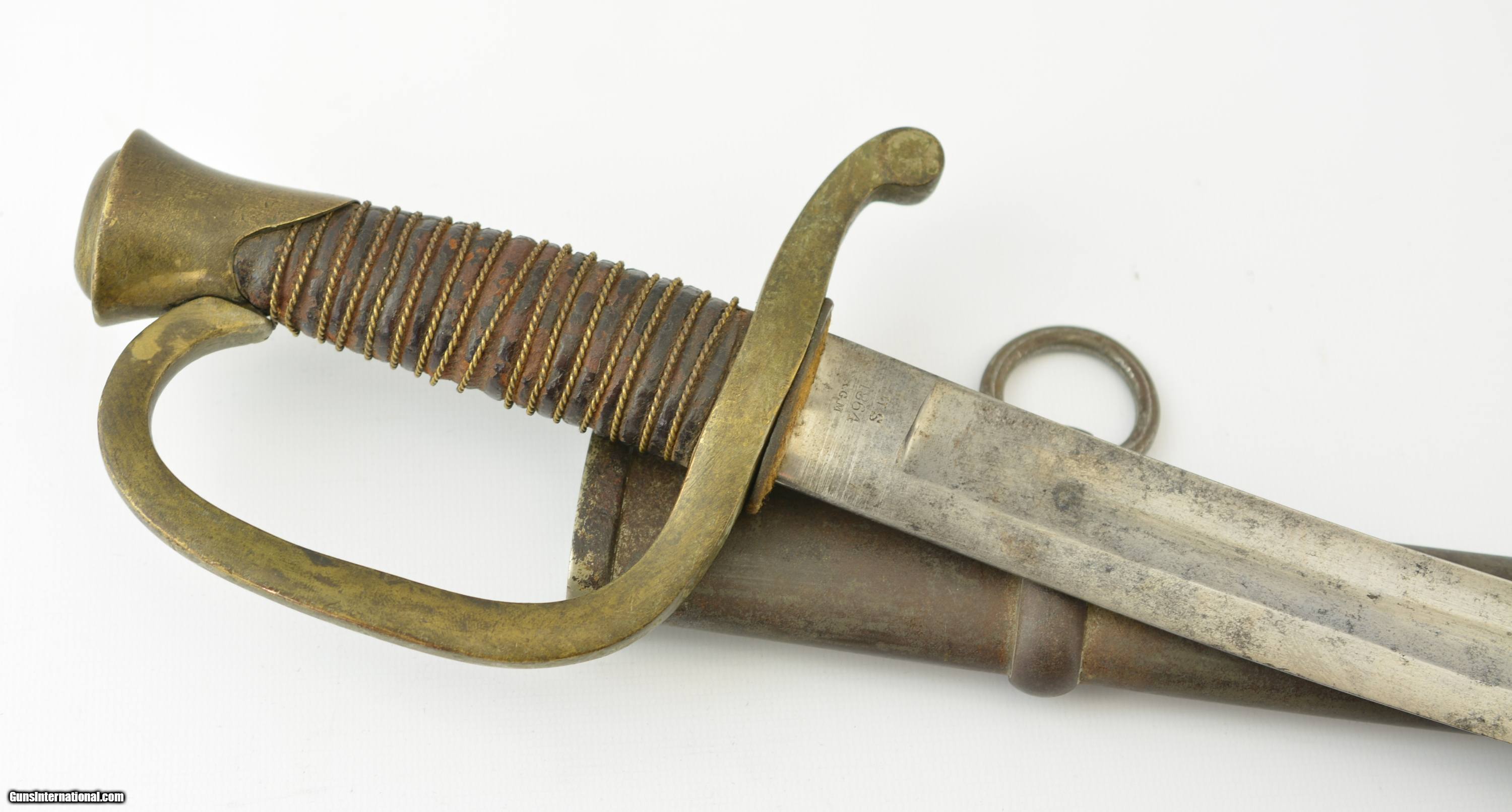 Description: This sword measures 37 7/8" overall with a 32 1/4" curved, single-edged blade having wide single fullers. The steel has an overall mottled gray patina with spots of dark freckling scattered evenly along both sides. The ricasso is marked, “US/1864/A.G.M." on the obverse, and “C. ROBY/CHELMSFORD/MASS" on the reverse. The hilt has a darkly tarnished brass “D" guard with single forward swept quillon, a very good leather grip with loose, but intact braided wire wrap, and Phrygian helmet pommel with “52" rack number stamp. The metal scabbard has an overall freckled brown patina mixing with small spots of gray, but is otherwise in fine shape with no dents along the body. The hanger rings exhibit some very mild wear, but there is hardly any deformation of the drag tip. This is a very good example of a war dated 1840 Artillery, by a desirable maker, and would make a nice representative example for a collection SOLD Manufacturer: US Military Model: Sword |