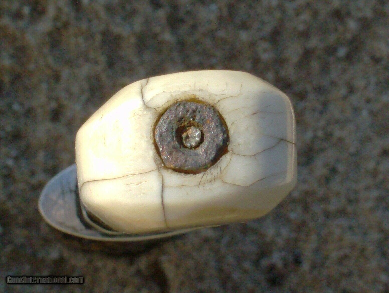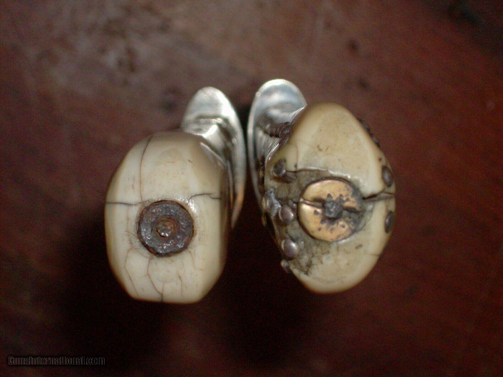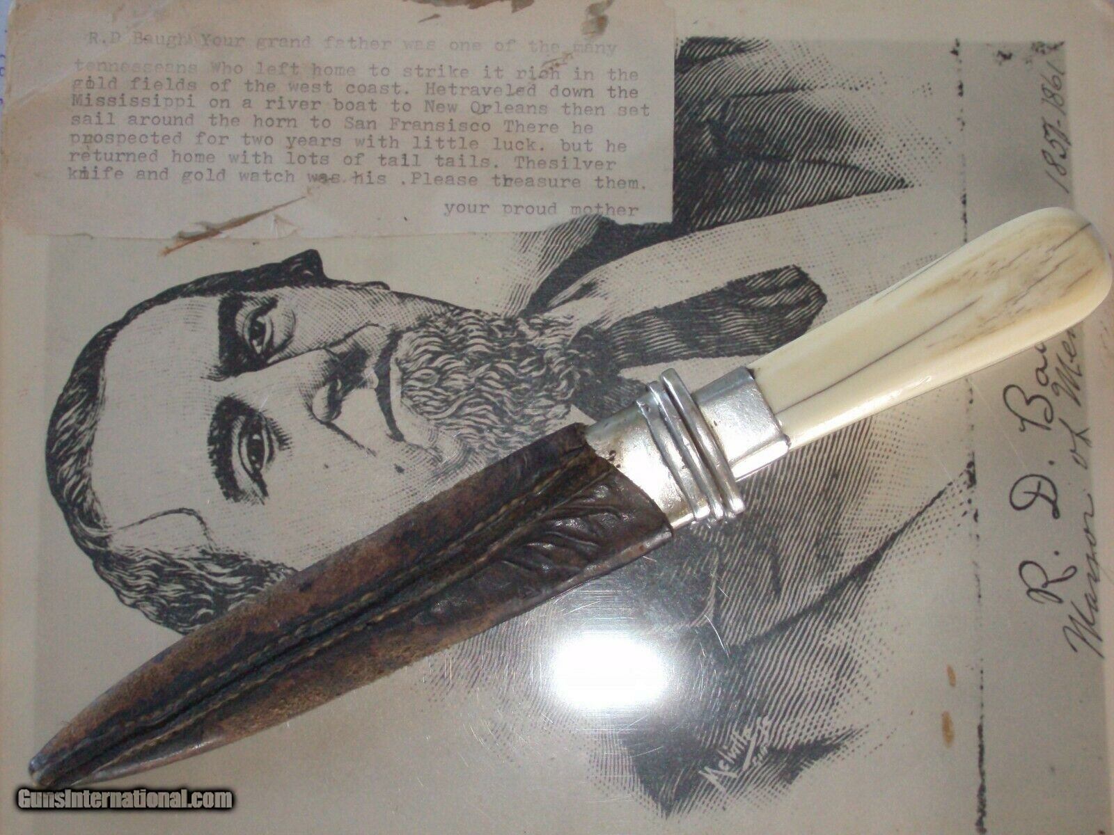 Description: Rare early, American made, San Francisco made silver mounted dirk knife, locally used walrus Ivory handle. This rare knife comes with provenance that states it belonged to a gold seeker who went west to find gold during the gold rush. Knife is 10" long. Original silver sheath with very old, period leather oversheath. No makers mark but does have a small "S.F. CAL." stamped on the silver band around the tang. The stamp is very small. It had to be photographed using a macro lense. Letters are not much larger than 1/32 of an inch. Probably a jewelers stamp. This great stamp and provenance renders the knife an inescapable part of the California gold rush. Very early for a S.F. knife. Possibly the earliest one known. Condition is very good. Hairline stress cracks to ivory. Flush mounted locking nut on end has rust. Sheath is solid. Thick heavy leather, handtooled and handstitched, shows nice wear from being carried. Provenance names R.D. Baugh as the gold seeker from Tenn. He later became mayor of Memphis from 1857-1861 then fought in the Civil War under Nathan Bedford Forrest. SOLD |