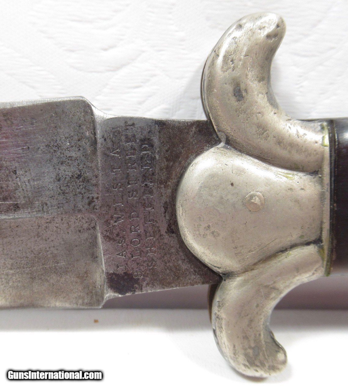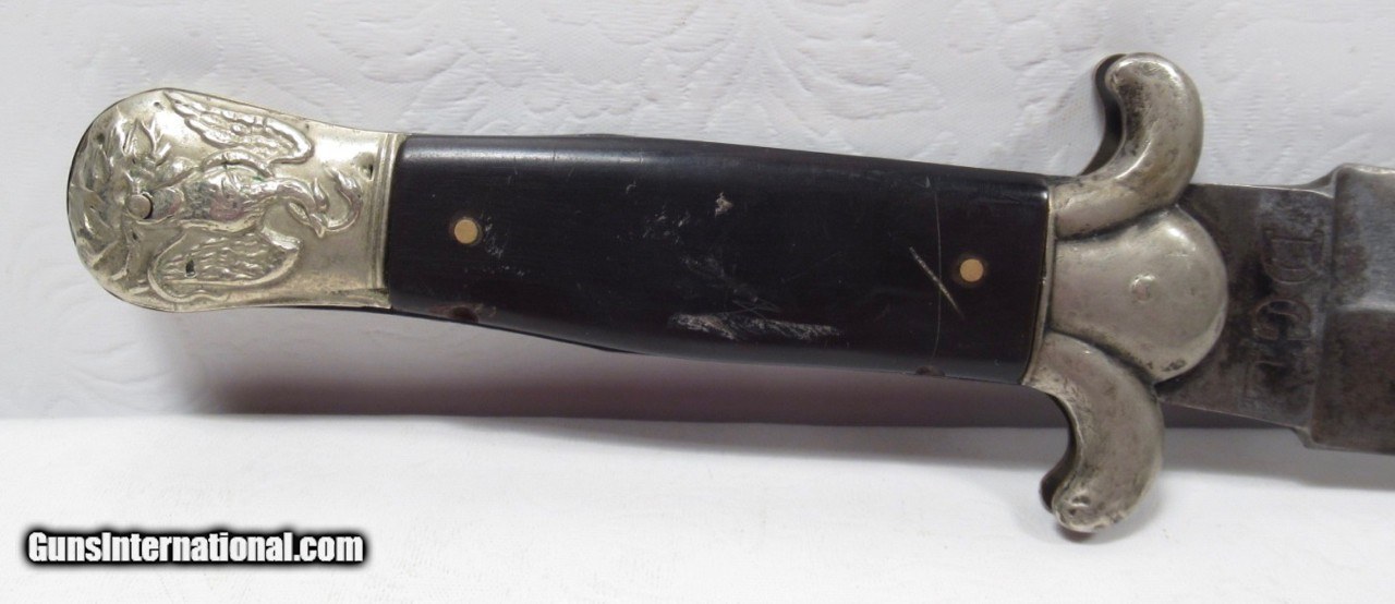 Description: SALE PENDING---Spear Point Bowie Marked “JAS WESTA, 21 Lord St., Sheffield”; 8” Double Edge Spear Point Blade; 13” Over All; 2 Piece Guard, Horn Scales on Hilt, Mexican Eagle and Snake Pommel; “DCL” Marked on Reverse Ricasso; Confederate Type Tin Sheath Made to Fit; believed to be Circa 1850-1860; Note, there is no James Westa Found in England; See Research Notes; LIQUIDATING PERSONAL COLLECTION; Price: $2,500 Shipped; Price includes insured shipping; return policy: three days inspection from the date the items received; full refund of shipping both ways ONLY IF THE ITEM IS MISREPRESENTED SOLD |