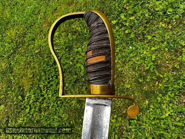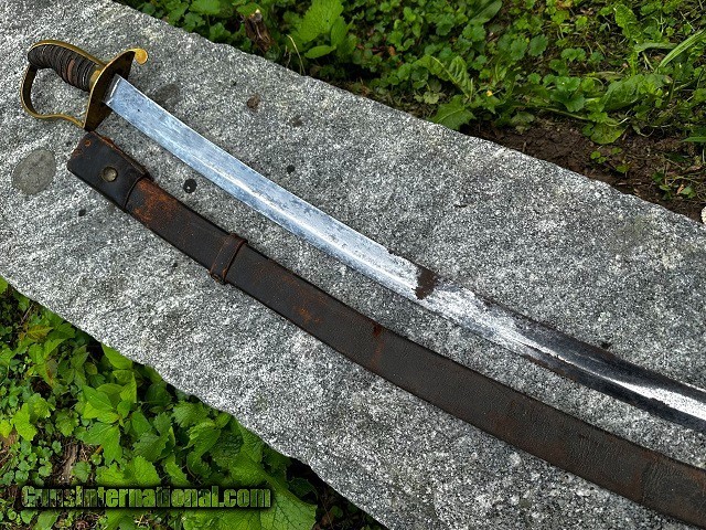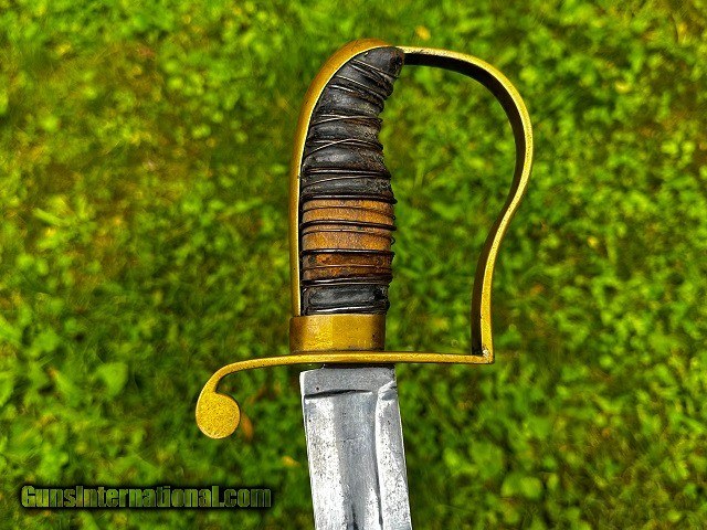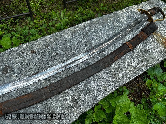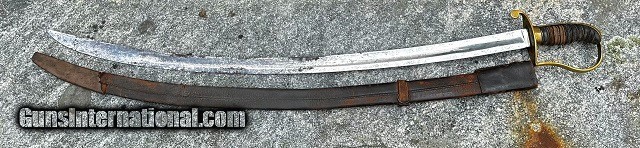 Description: Large War of 1812 Era American Militia Light Artillery or Dragoon Horseman's Saber with Original Sheath, mfg. circa 1800-1825. This is a very good early American militia horseman's saber which conforms to the type carried by light artillerymen although it's length is more along the lines of a light dragoon saber. The sword measures 41 1/16" overall with a 36 1/4" curved blade. There are no visible markings. The blade retains a bright luster overall with some very light surface rust spots forming which I'm sure would remove with careful proper cleaning. Good clean edge with a few small marks from opposing blades. Brass hilt has a lovely mellow patina. Original wire wrapped leather bound wood grip is solid in hand with some loss to the leather and looseness of the wire wrapping. The sword is very light at just 1 lb 14 oz and incredibly well balanced. The original leather scabbard is complete and in fair condition considering it's age with the exception of the brass chape or tip which has become unattached, the leather having ripped just beyond it's edge. It's fortunate the scabbard has survived at all. A very attractive and impressive early American saber! Provenance: Recently found in the attic of a very old colonial home in Canterbury, Connecticut. Jeremiah Johnson Trading sells antique arms manufactured prior to 1899 and muzzleloading blackpowder reproductions only. For the purpose of these conditions the term "antique arms" will also include muzzleloading blackpowder reproductions. Buyers must be 21 years of age or older and have no felony convictions to purchase antique arms. Antique arms do not require Federal licensing and may be shipped directly to the buyer with the following exceptions. No antique arms will be shipped to Washington D. C. or any of the five boroughs of New York City (or residents thereof). Some restrictions may apply to antique firearms shipped to California and will be noted in the item description if applicable. Any antique arms shipped to New Jersey must ship to a licensed FFL holder, no exceptions. Any muzzleloading blackpowder reproduction rifle, shotgun, or handgun shipped to Illinois must ship to an FFL holder. Items containing antique ivory will not be sold or shipped to residents of California, Hawaii, Illinois, Nevada, New Hampshire, New Jersey, New York, Oregon, or Washington. Antique muzzleloaders and antiques which fire obsolete cartridges may be shipped internationally however it is the responsibility of the buyer to know and abide by their local laws and provide proof that the antique arm is legal to receive and own. Payment can be made by money order, banker's check, personal check, credit card (no additional fees), or bank wire. Please allow 7-10 business days for clearance on personal checks. If paying by credit card please call us directly to process your order. Items are professionally packed and shipped USPS Priority Mail with insurance coverage for the sale price and signature required for delivery. Items valued over $5,000.00 are shipped Registered Mail. Buyer pays actual shipping costs with no added charge for packing materials or handling. We describe items accurately and thoroughly. If an item has been misrepresented or significant defect overlooked you may return it for a full refund (minus return shipping costs) within 3 days of having received it. This timeframe begins once the package is delivered by the carrier. Buyer's remorse or concerns over issues noted in the description and/or pictures is not a valid excuse for return. Returned items must be received in the same condition as originally shipped - cleaning, disassembly, alteration, or damage of any kind will void inspection privileges. Occasionally a post-1898 firearm from my personal collection may be sold under this account and any such transaction is a personal sale in no way affiliated with Jeremiah Johnson Trading. Any such arm will be shipped to a licensed FFL or C&R holder in accordance with Federal law. All antique arms are sold as collector's items and are not warranted safe for shooting. Please consult a competent gunsmith prior to shooting any firearm. SOLD |