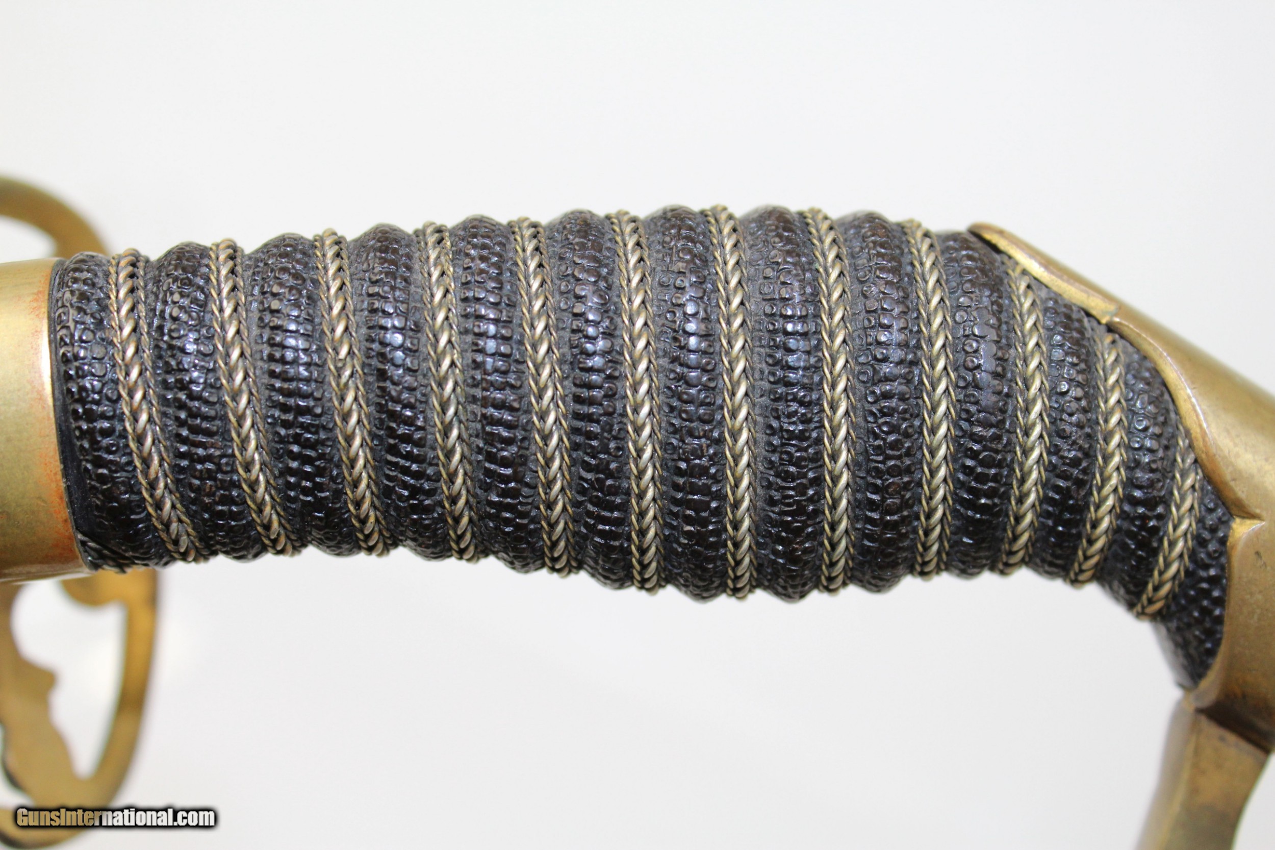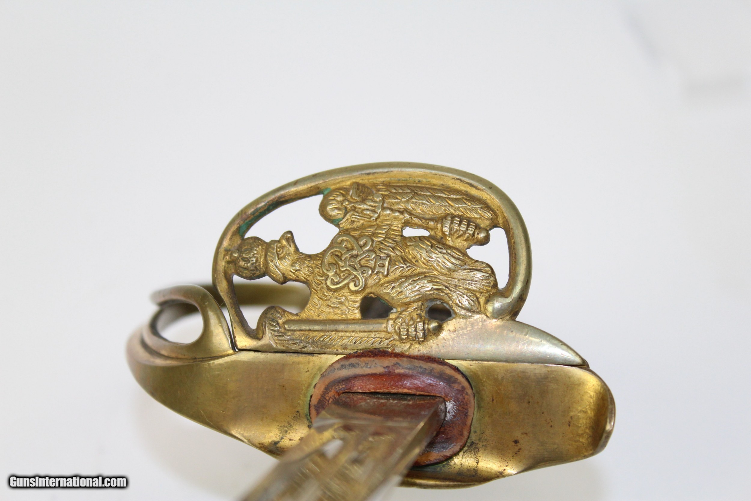 Description: WKC GERMAN Antique M1889 Infantry Officer’s Sword Degen Made Circa 1891 w Kaiser Wilhem II’s Crest Here we present an antique German Model 1889 Infantry Officer’s Degen, made circa 1891by Weyersberg, Kirschbaum & Cie of Solingen, Germany. This sword would have seen use up through World War I. This style of sword is characterized by the partially angled grip and straight blade. The blade is double fullered. The guard folds on a hinge for storage. The black Japanned scabbard has the double ring mounts, placing it in the earlier production before they went with a single mount. The ricasso is marked “W.K.&C” along with their trademarks. The guard features an ornate German eagle design with a crown, scepter and sword. The Roman numeral “II” appears on both the eagle and the emblem on the grip for Kaiser Wilhelm II, the last German Emperor. The drag of the scabbard is marked “W.K.&C” and “119”. The overall condition is fine. The braided wire wrapped grip is complete and tight. The blade is 31-1/2 inches in length and is in fine condition showing little wear. Own the original! This is a legitimate antique and not a reproduction. Overall condition as seen in photos. Very Fast. Very Safe. FREE SHIPPING WORLDWIDE. Delivered directly to your door by express mail! Guaranteed AUTHENTIC & Includes CERTIFICATE OF AUTHENTICITY. ancestryguns $1200 #6594.1 SOLD |