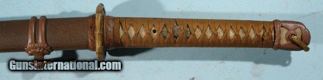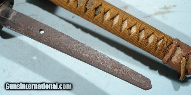 Description: WW2 BRINGBACK JAPANESE EDO PERIOD SHIN GUNTO MTD KATANA BY MINIMOTO TANEHIRO (TADAYOSHI SCHOOL), CIRCA 1600'S. 26.5" (67mm) cutting edge with original shoji hamon. Standard military mounts with corresponding cherry blossoms indicative of gunto mounting. Very old blade though with tang having 11 mei characters on one side (Hizen province proclaiming Tadayoshi school maker) and three characters opposite I have been unable to translate(poetic or holy incantation?). Straight out of local family who's WW2 Coast Guard ancestor chose it out of ships hold off of Guam during War. Have G.I.'s name SOLD |